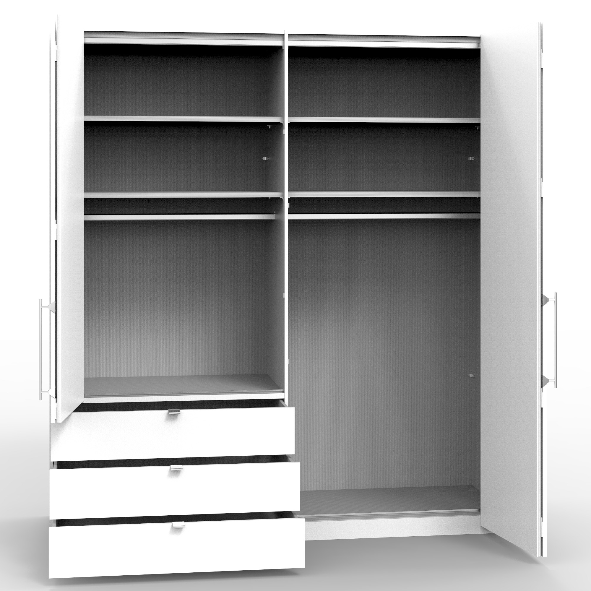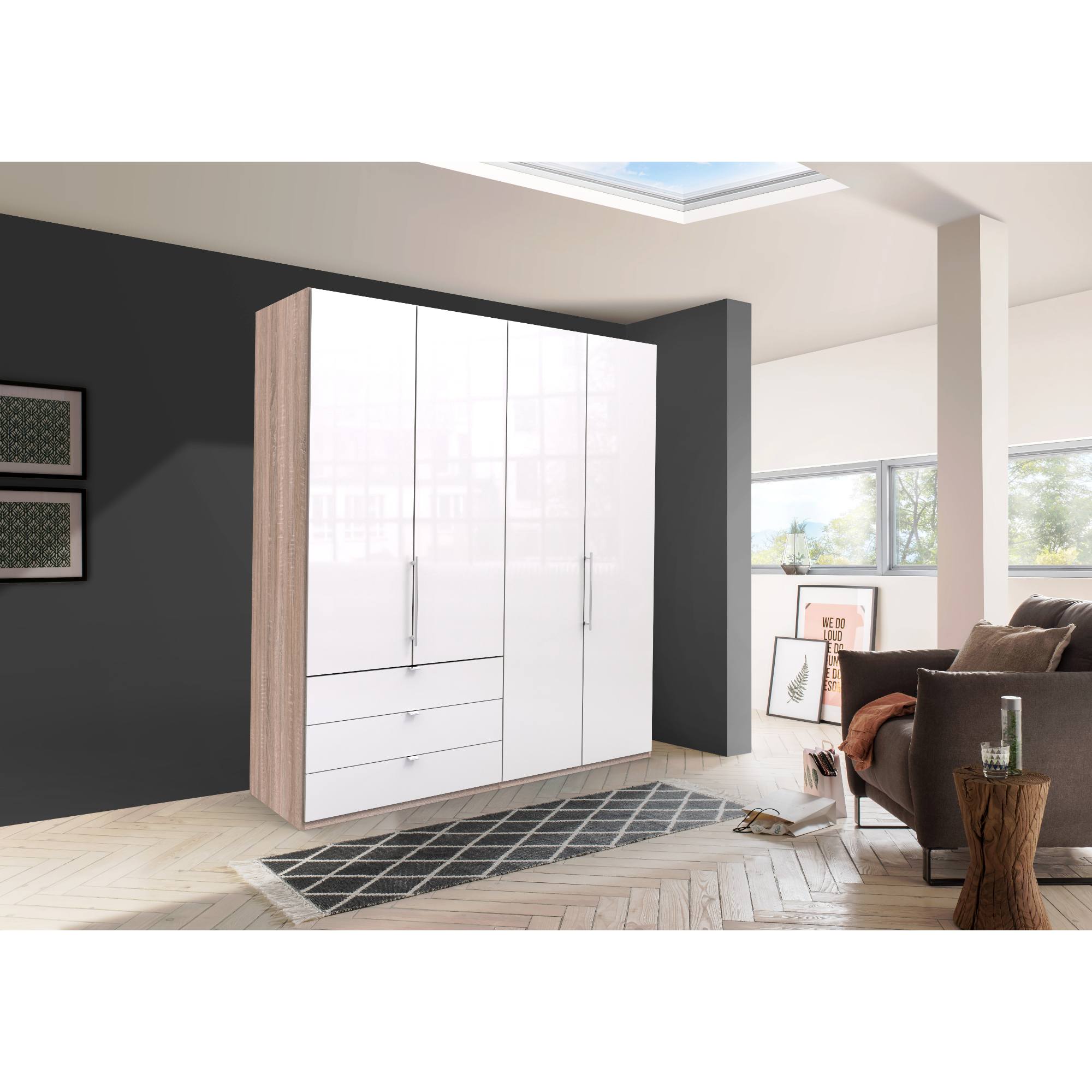 Šatníková skriňa disponuje skladacími dvierkami, ktoré sa elegantne pohybujú na kovových pojazdoch. Za nimi sa nachádza vnútorné vybavenie zostavené zo 4 vložených políc a 2 šatníkových tyčí. V dolnej časti skrine sa nachádzajú praktické zásuvky, ktoré majú samozatvárací mechanizmus s plynulým dotlmením. Decentné kovové rúčky uľahčujú otváranie jednotlivých častí skrine.