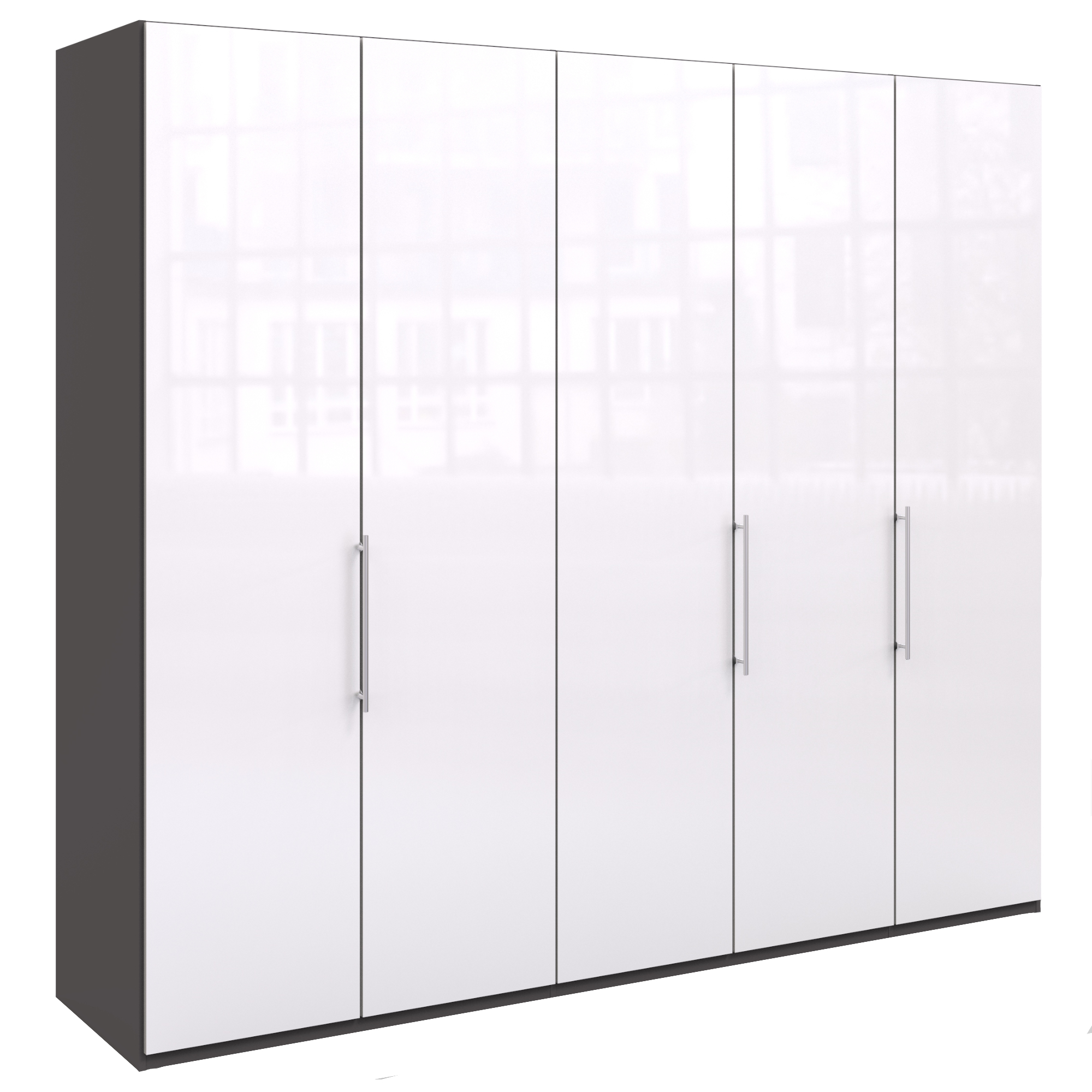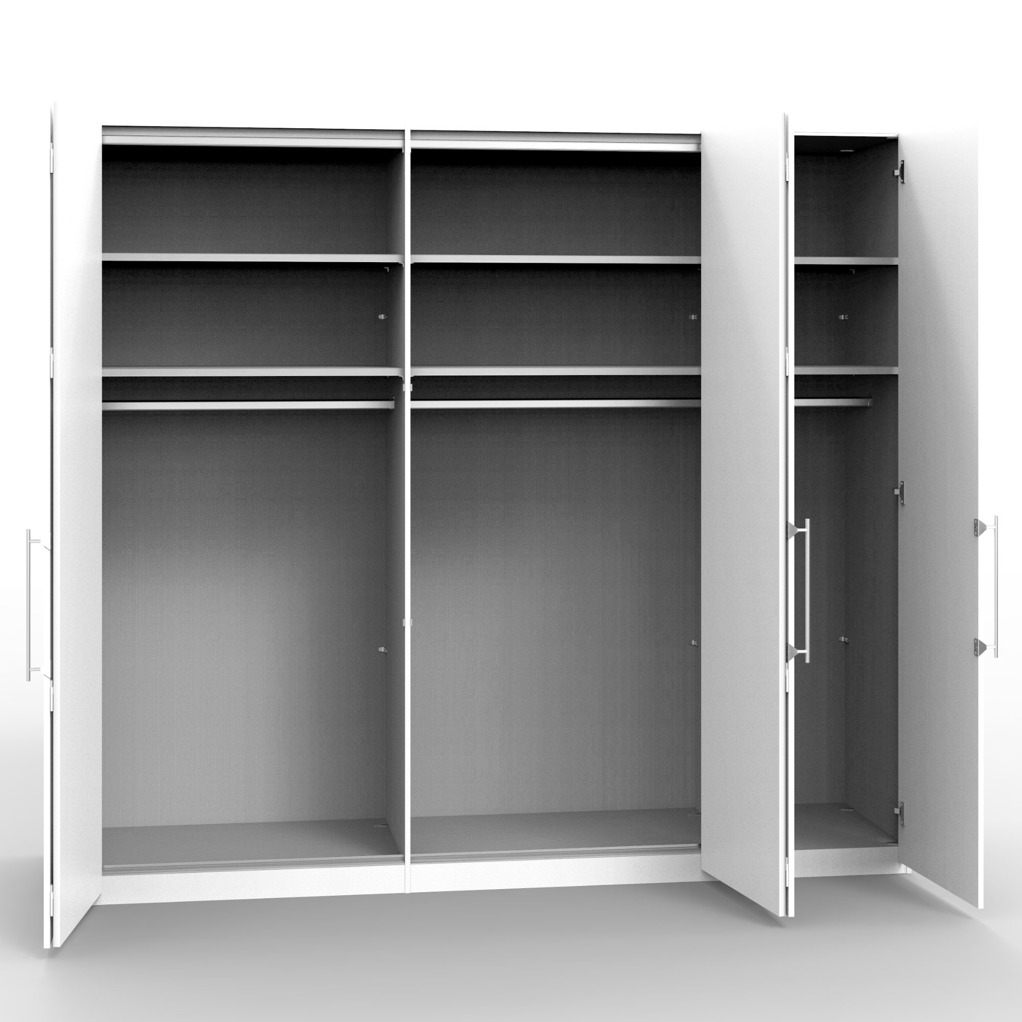 Šatníková skriňa disponuje skladacími dvierkami, ktoré sa elegantne pohybujú na kovových pojazdoch. Za nimi sa nachádza vnútorné vybavenie zostavené zo 6 vložených políc a 3 šatníkových tyčí. Decentné kovové rúčky uľahčujú otváranie jednotlivých častí skrine.