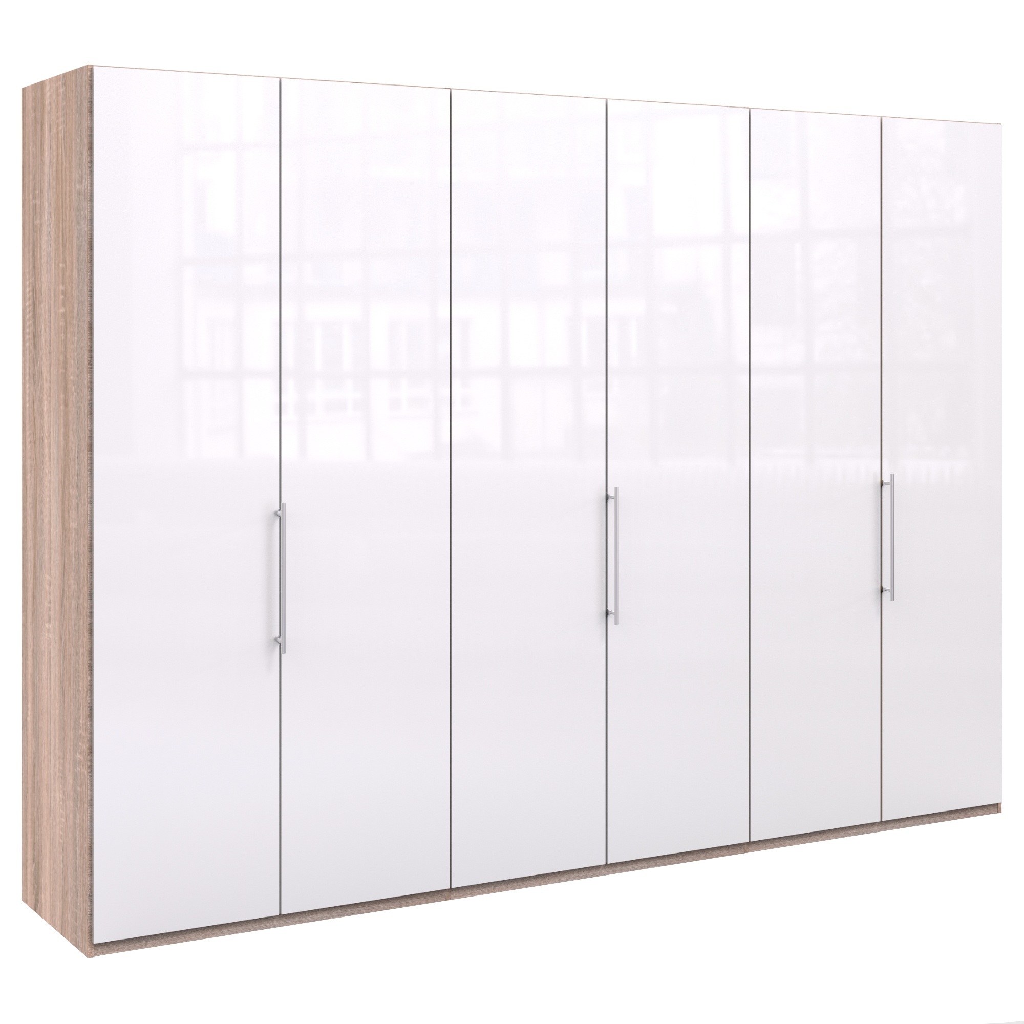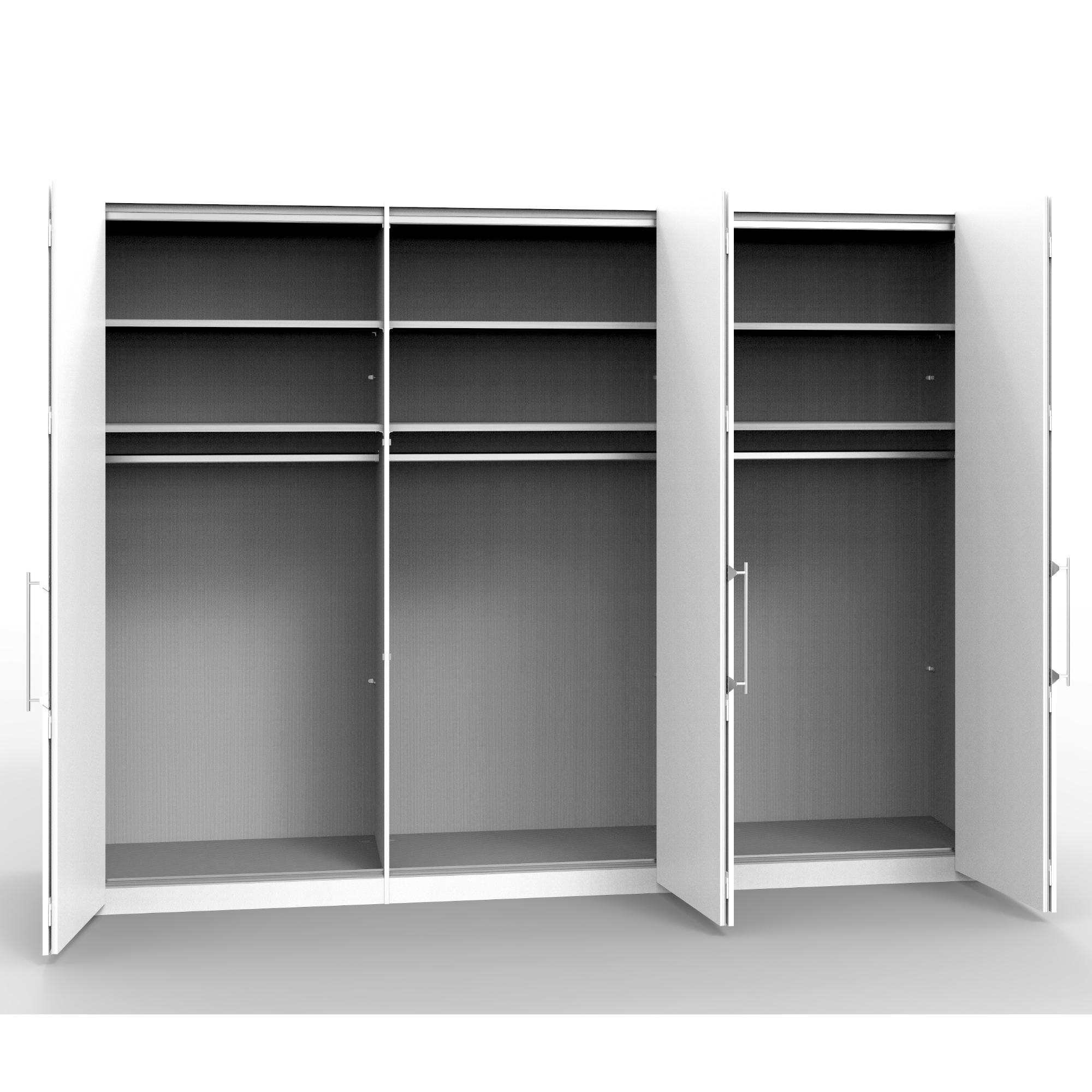 Šatníková skriňa disponuje skladacími dvierkami, ktoré sa elegantne pohybujú na kovových pojazdoch. Za nimi sa nachádza vnútorné vybavenie zostavené zo 6 vložených políc a 3 šatníkových tyčí. Decentné kovové rúčky uľahčujú otváranie jednotlivých častí skrine.
