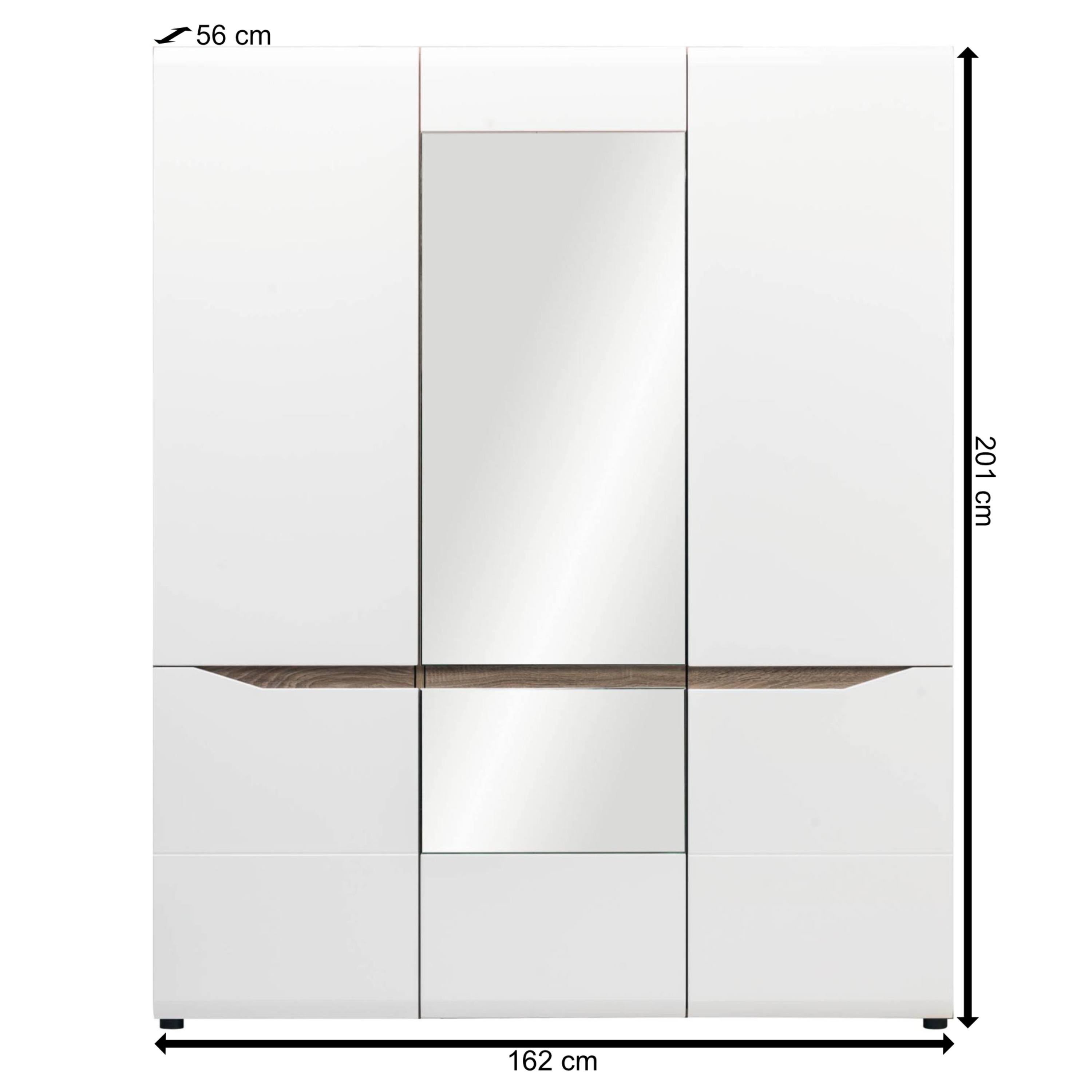 Skriňa je uzatvárateľná pomocou 3 otočných dverí z ktorých prostredné sú doplnené o praktické zrkadlo. Ľavé samostatné dvere za sebou ukrývajú 4 vložené police ideálne na uloženie poskladaného oblečenia. Priestor za zostávajúcim párom dverí je vybavený 2 šatníkovými tyčami nad sebou na prehľadné skladovanie vešiakov s odevmi. Konštrukcia je vyrobená z laminovaného dreveného materiálu a prednej plochy dverí z drevovláknitých MDF dosiek s povrchovou úpravou vo vysokom lesku.