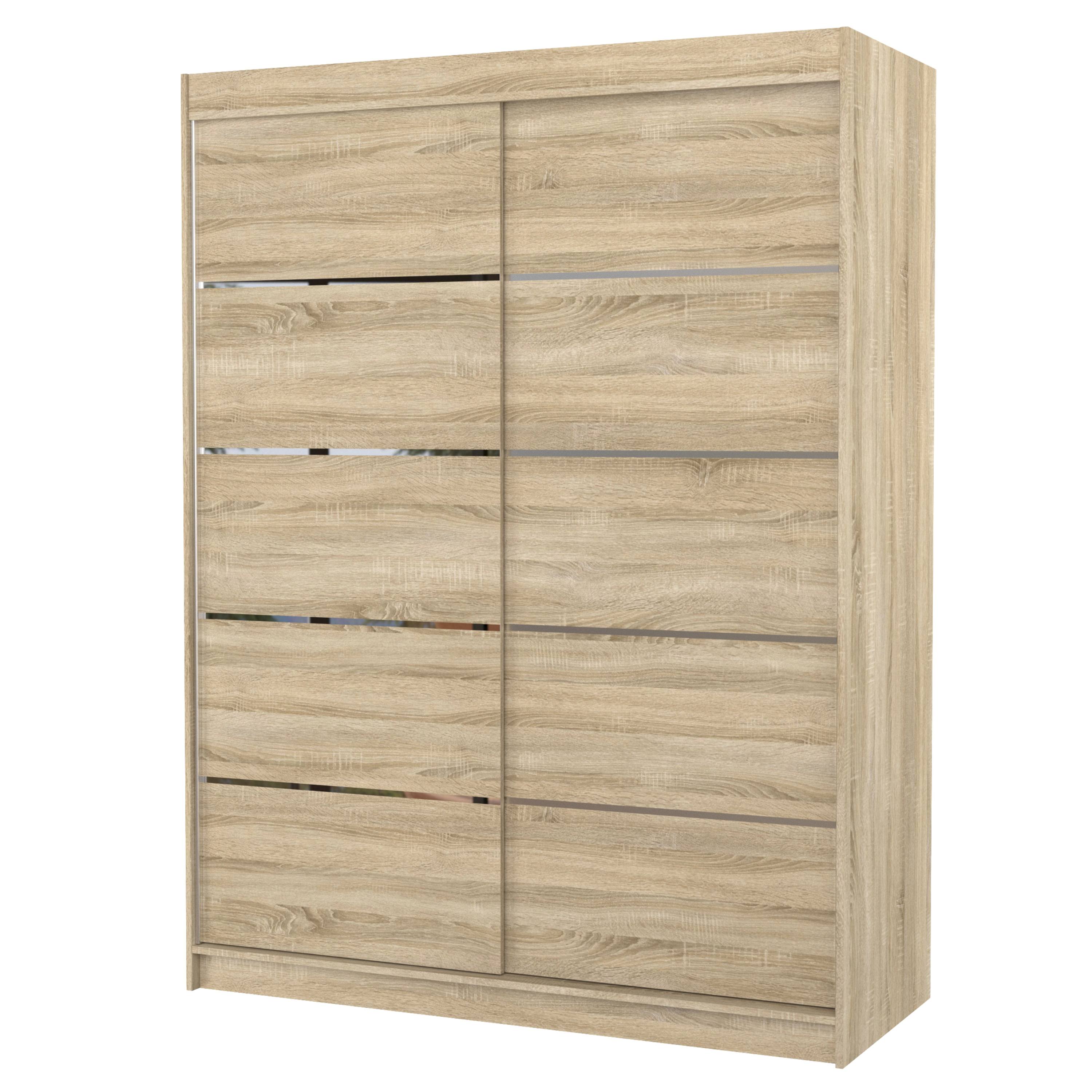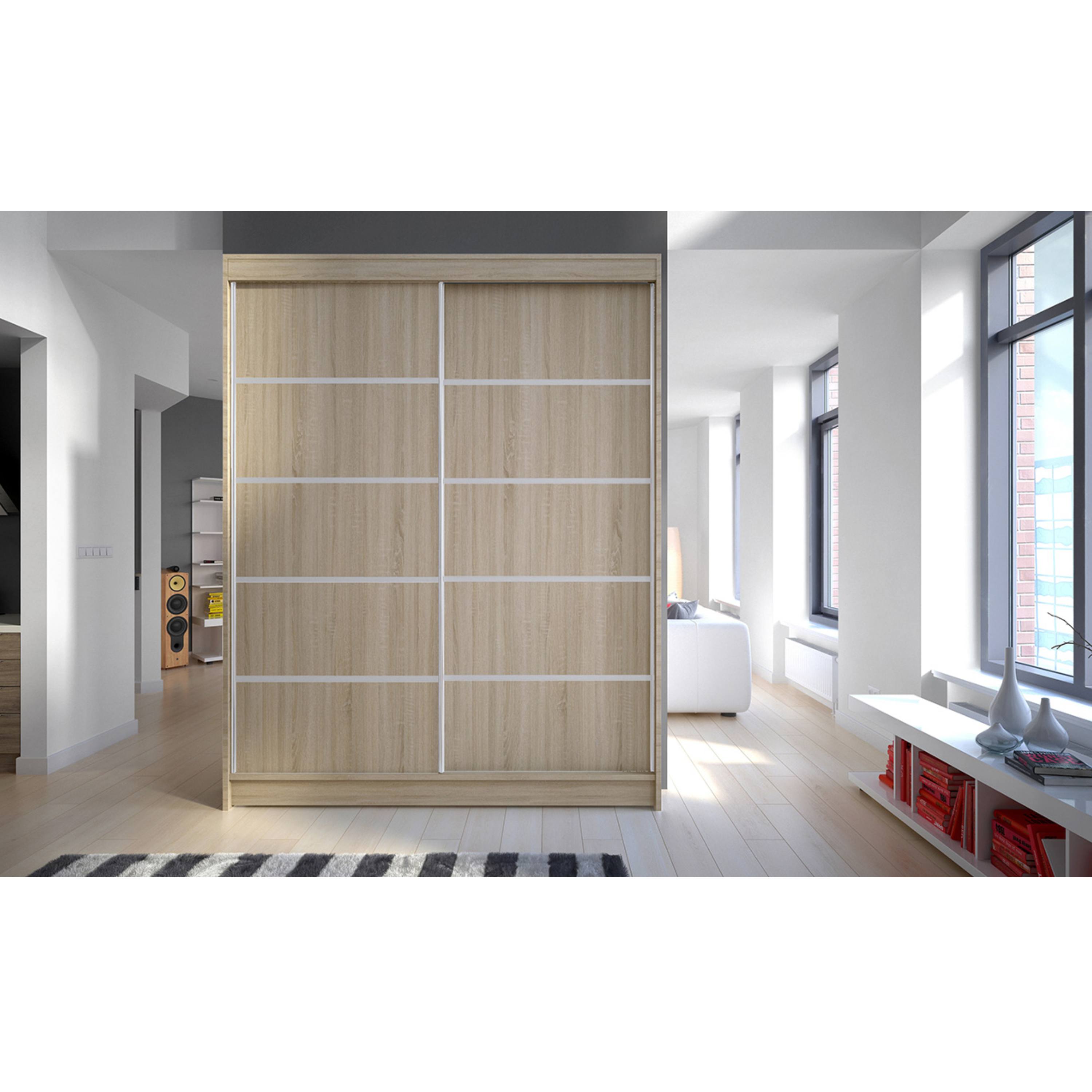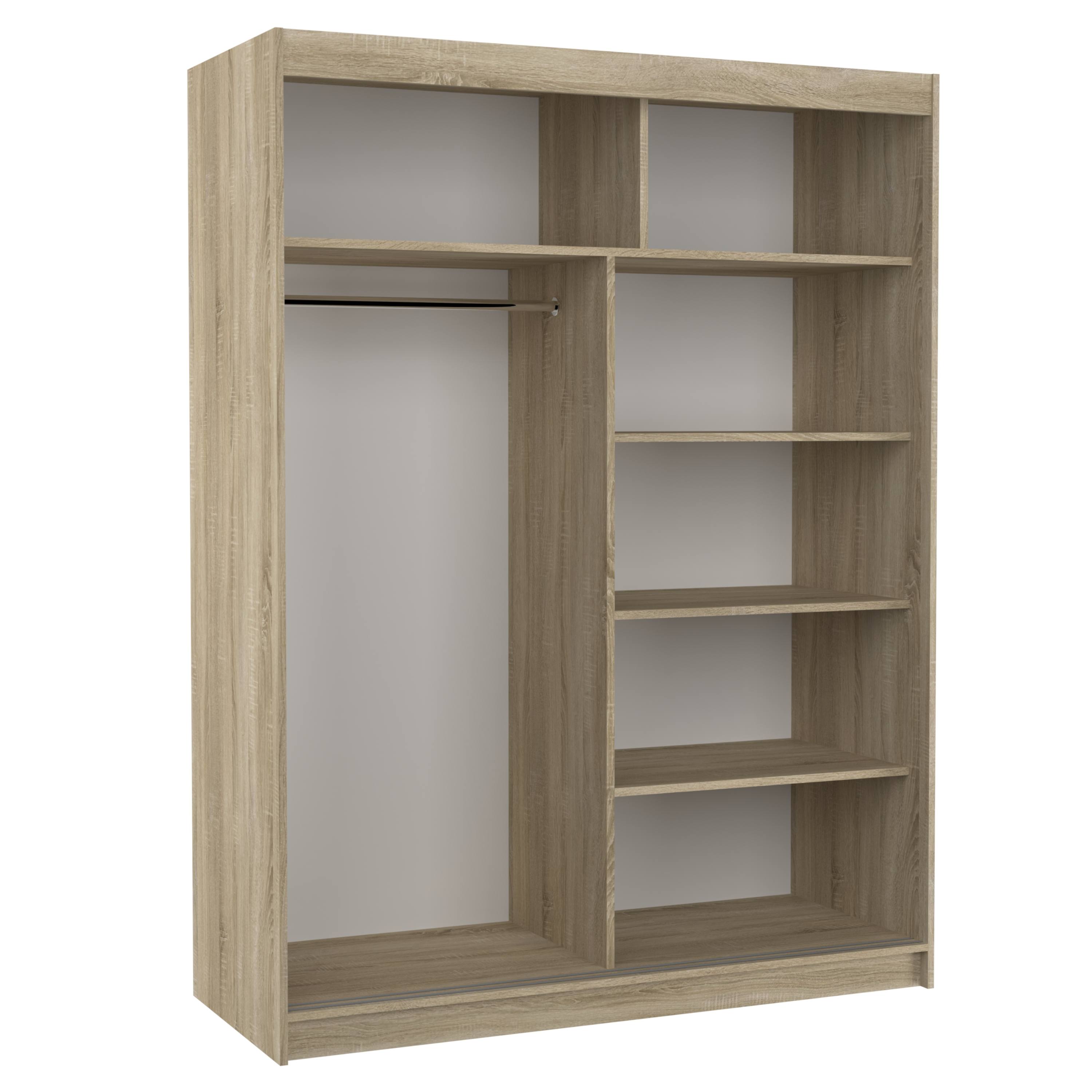 Vnútorné vybavenie pozostáva celkovo z 5 políc a 1 šatníkovej tyče na uloženie rôznych typov odevov. Skriňu uzatvárajú posuvné dvere, ktoré šetria cenný priestor zvonka aj vo vnútri skrine. Korpus skrine je vyrobený z laminovaného dreveného materiálu doplneného o ABS hrany, ktoré chránia pred mechanickým poškodením.