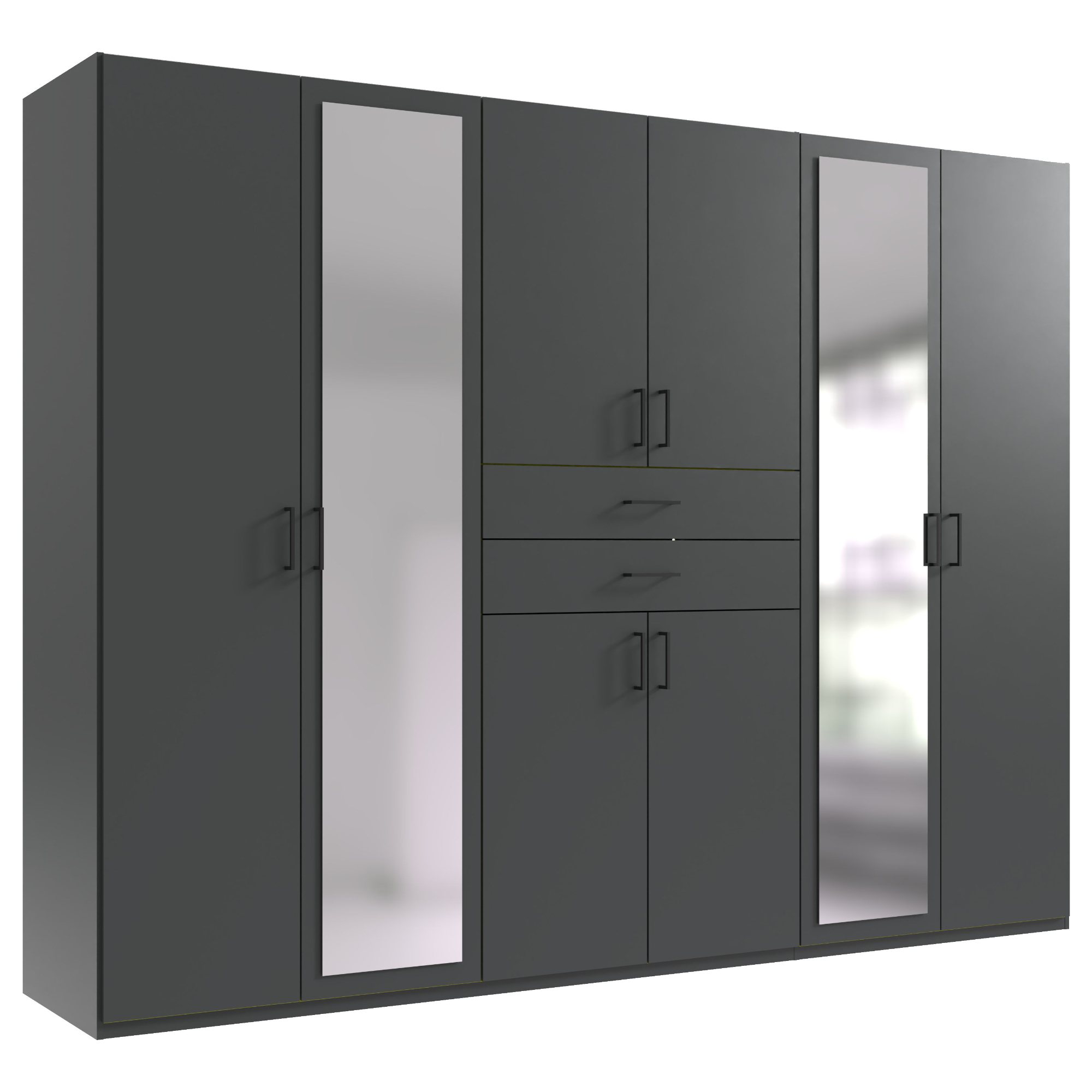 Skriňu uzatvára 8 otočných dverí, ktoré umožňujú maximálne využitie vnútorného priestoru. 2 dvere sú vyplnené zrkadlami, v ktorých si môžete kedykoľvek skontrolovať svoj vzhľad a tiež pomôžu opticky zväčšiť a presvetliť interiér. Ľavý pár dverí, rovnako ako ten pravý, ukrýva prepojený priestor s 1 šatníkovou tyčou a 1 vloženou policou. Za každým párom dverí v stredovej časti sa nachádza dodatočná vložená polica. Na uloženie spodnej bielizne a ďalších drobnejších predmetov môžete využiť aj 2 praktické zásuvky. Všetky predné plochy sú osadené výraznými rúčkami, ktoré uľahčia každodennú manipuláciu. Skriňa je vyrobená z materiálu nenáročného na údržbu.