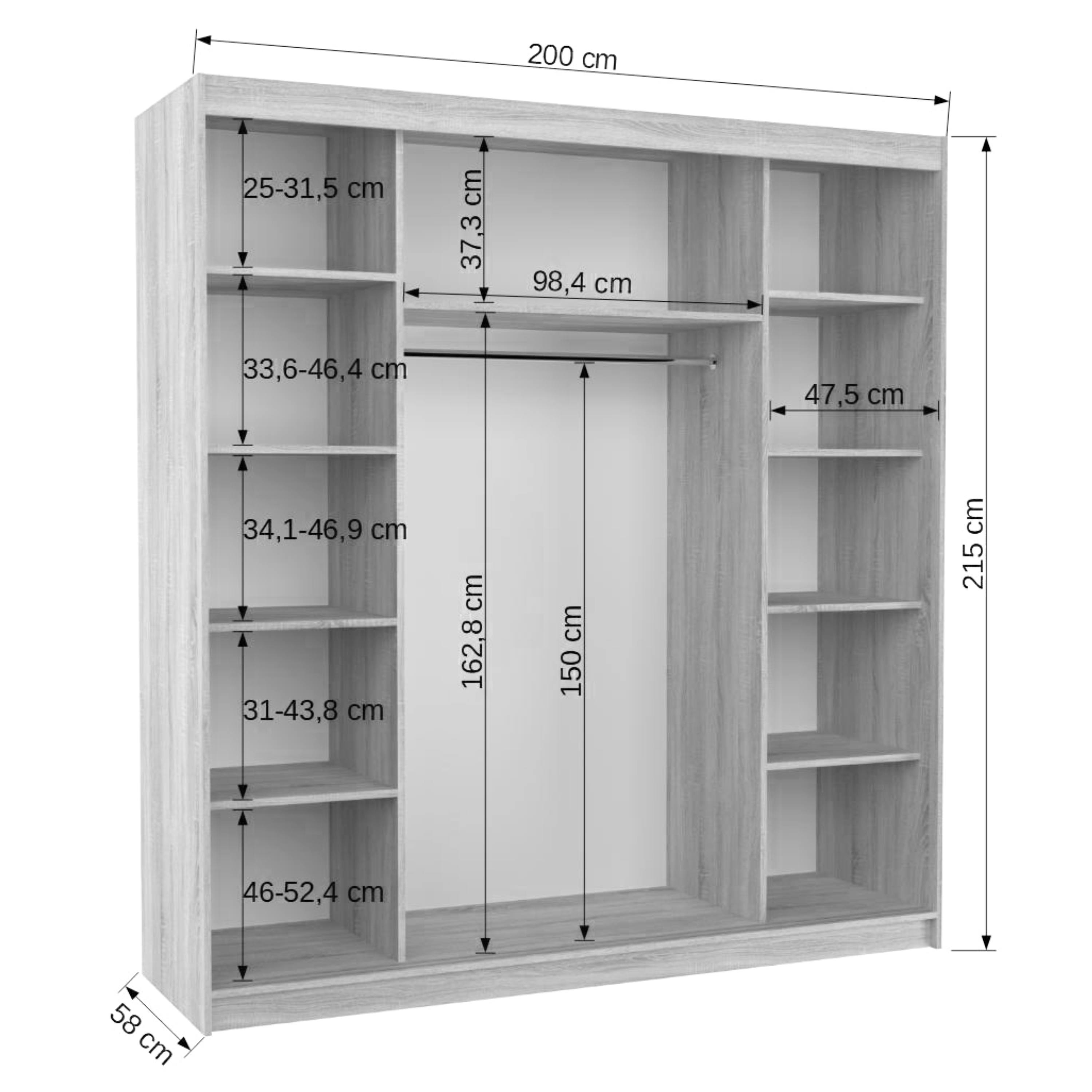 Skriňa je uzatvárateľná praktickými posuvnými dverami, ktoré šetria cenné miesto mimo skriňu. Vnútorné vybavenie pozostáva zo 4 políc na každej strane na uloženie poskladaného oblečenia, doplnkov alebo úložných boxov, zatiaľ čo prostredná prepojená časť je vybavená šatníkovou tyčou a širokou policou nad ňou. Skriňa tak ponúka priestor aj na zavesenie kabátov, košieľ či šiat a zároveň miesto na uskladnenie sezónnych vecí. Konštrukcia skrine je vyrobená z laminovaného dreveného materiálu, ktorý je doplnený o ABS hrany chrániace pred mechanickým poškodením.