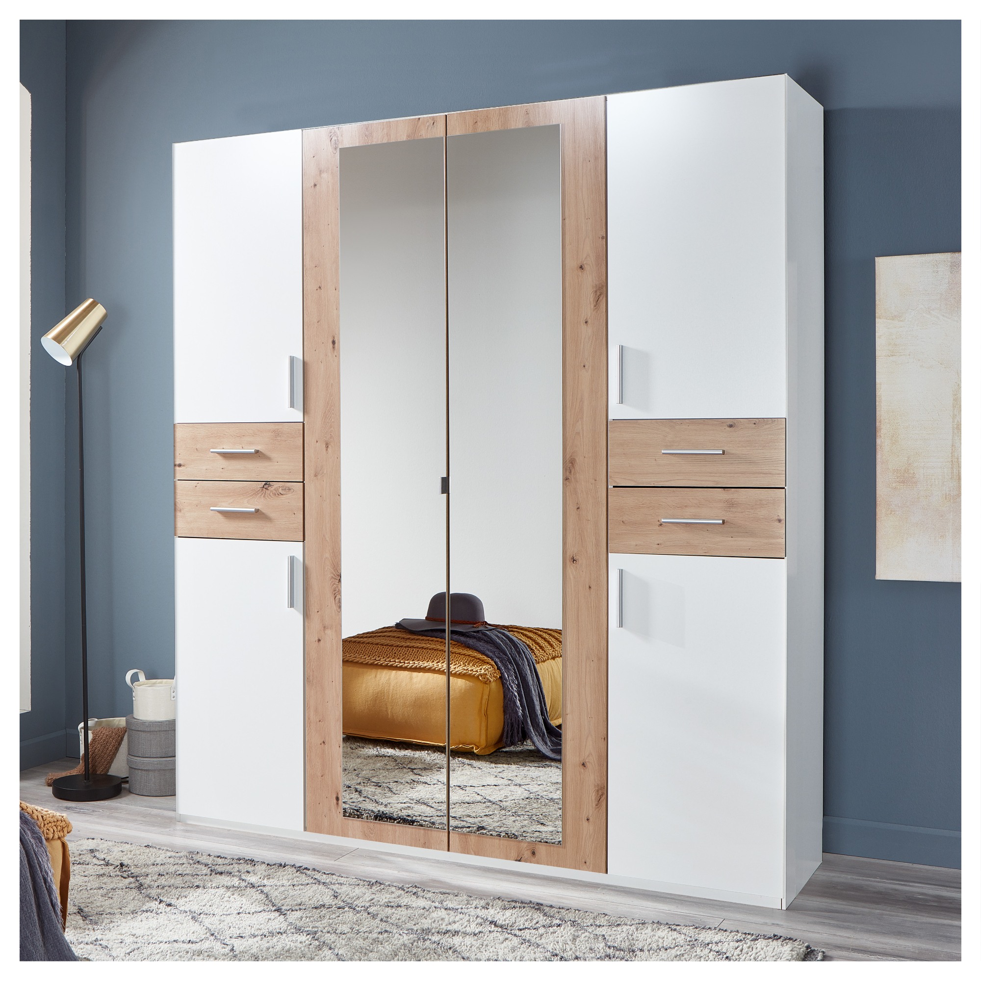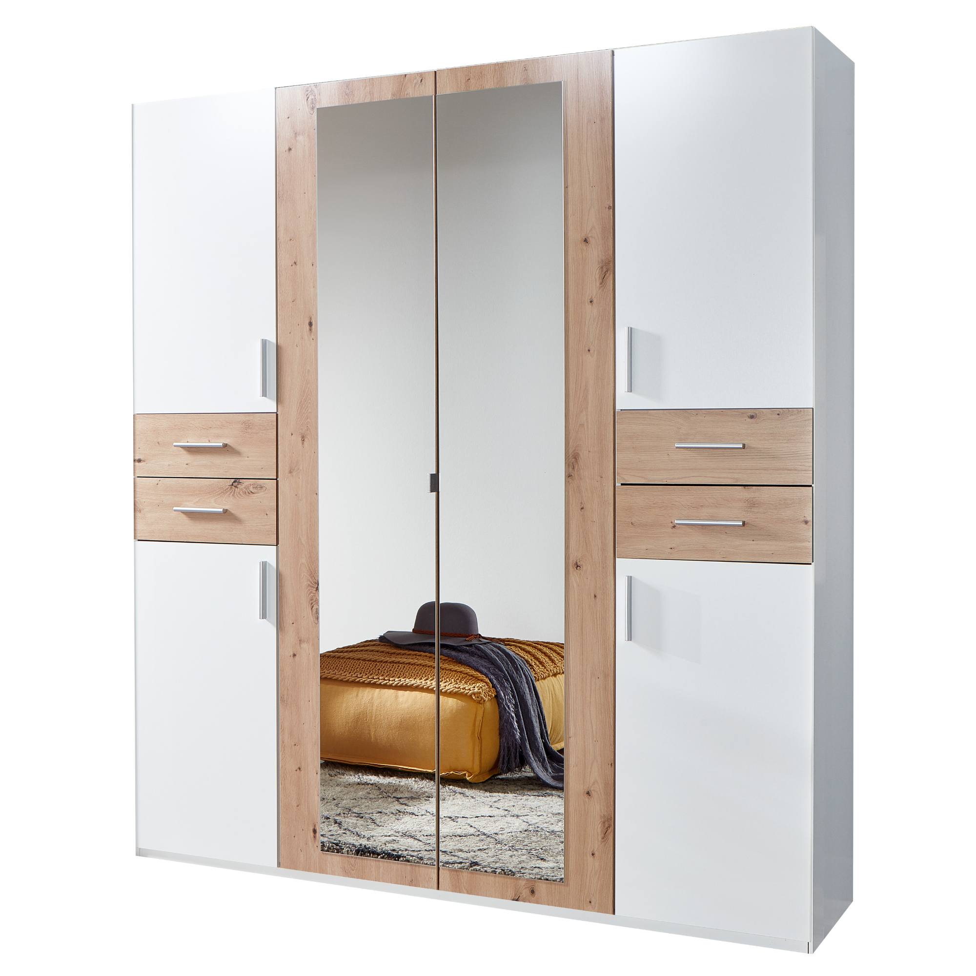 Skriňu uzatvára celkom 6 otočných dverí, ktoré sú osadené praktickými rúčkami na jednoduchú manipuláciu. Prostredné dvere sú navyše vyplnené zrkadlami, v ktorých si môžete kedykoľvek skontrolovať svoj vzhľad a tiež pomôžu opticky zväčšiť a presvetliť miestnosť. Za týmto párom dverí sa nachádza prepojený priestor s 1 vloženou policou a 1 šatníkovou tyčou. Ľavá strana, rovnako ako tá pravá, obsahuje 2 vložené police a 2 praktické zásuvky. Skriňa je vyrobená z laminovaného dreveného materiálu s povrchom nenáročným na údržbu.