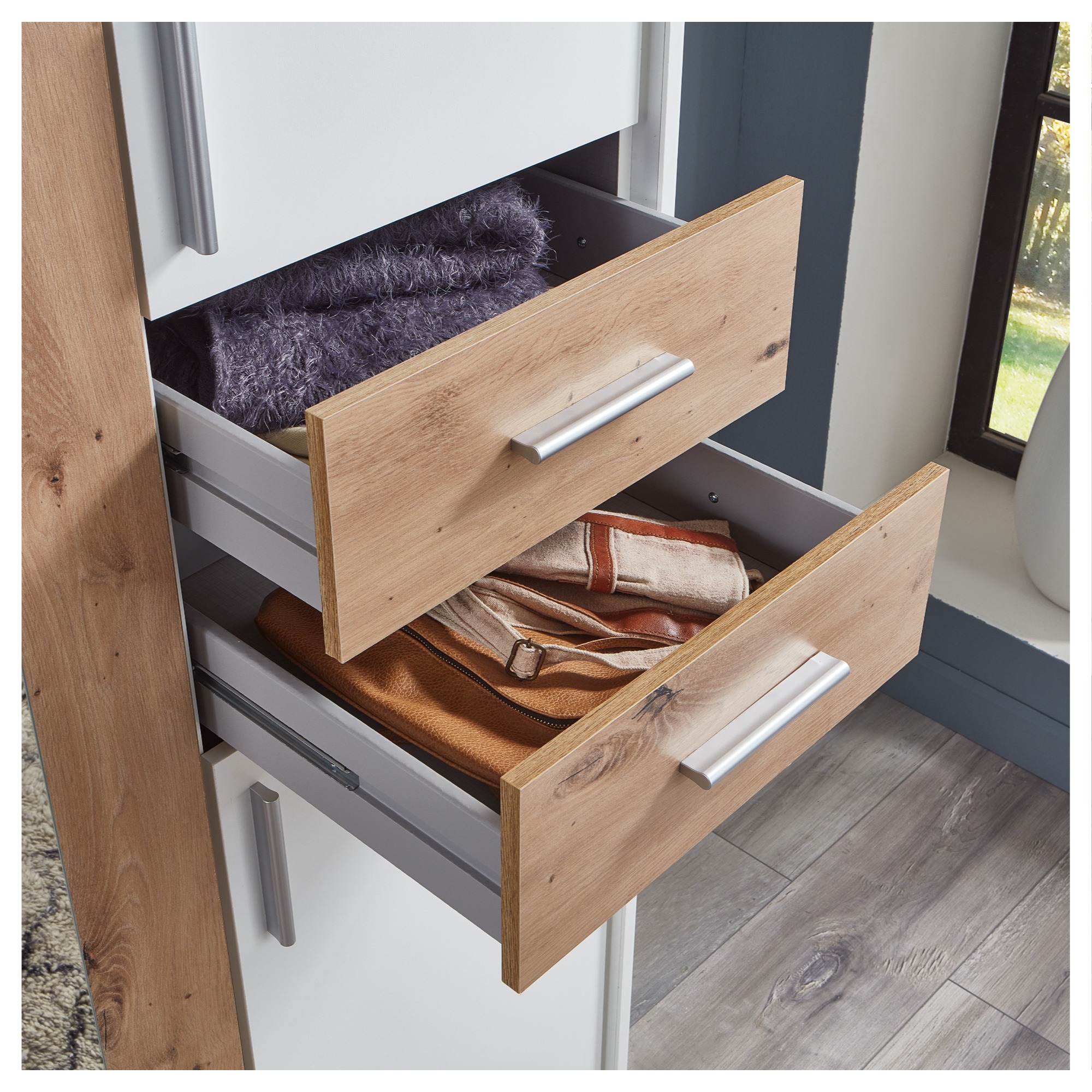 - Šatníková tyč, 5 vložených políc a 4 zásuvky