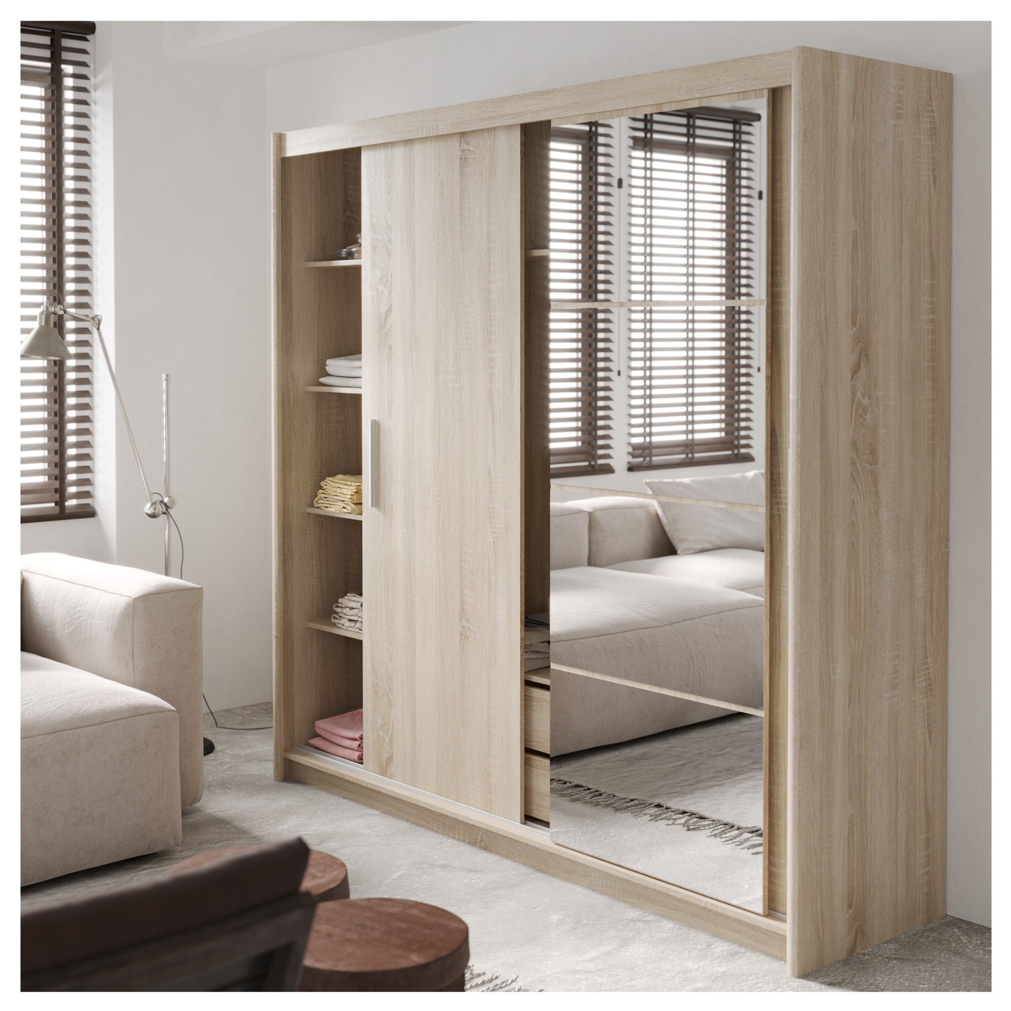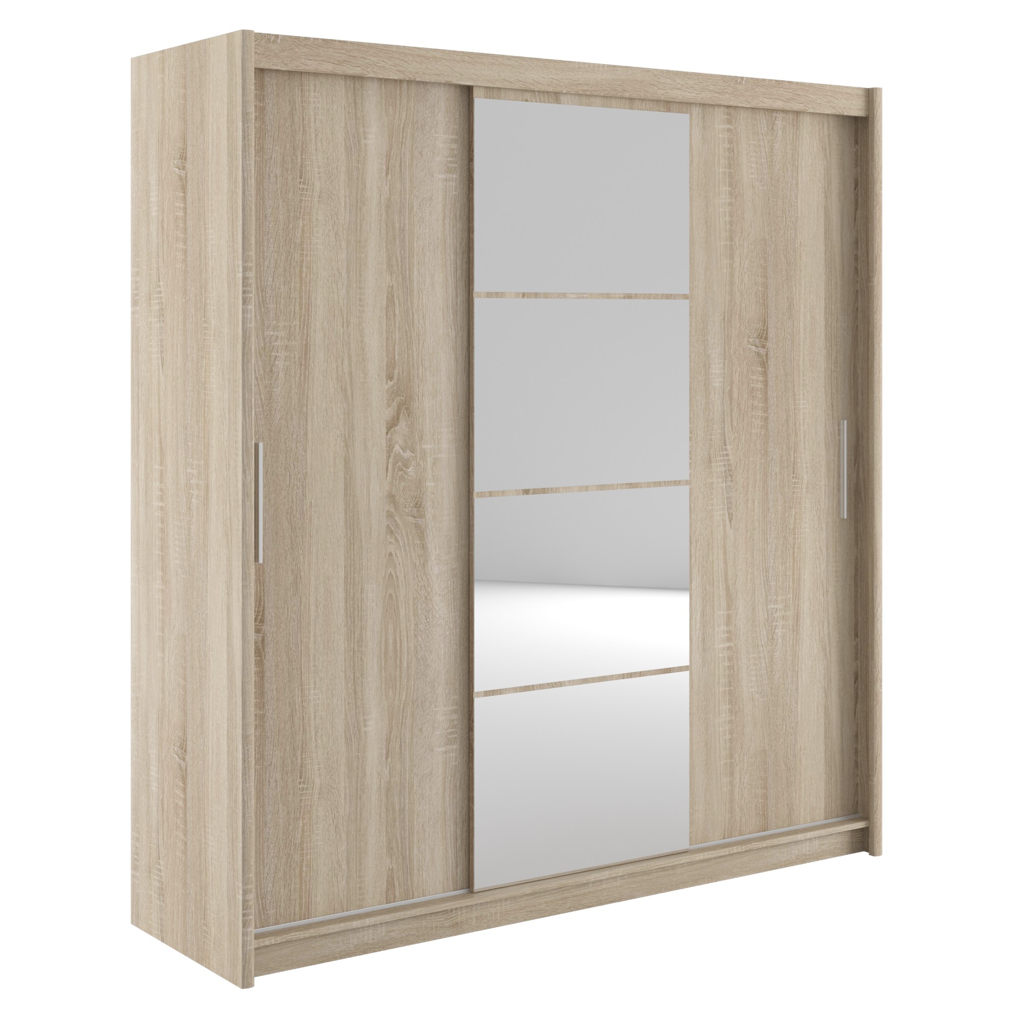 Úložný priestor je rozčlenený do 3 hlavných blokov. Priestor za ľavými dverami obsahuje 3 vložené police, ktoré bez problémov pojmú poskladané oblečenie, úložné boxy s doplnkami či lôžkoviny. Priestor za prostrednými aj pravými dverami je vyplnený 1 priestrannou šatníkovou tyčou a tie umožňujú pohodlné zavesenie väčších odevov alebo tých z krčivých materiálov. Prostredný blok navyše obsahuje 2 praktické zásuvky v spodnej časti. Poslednou súčasťou vnútorného vybavenia sú 2 medziposchodové police v hornej časti skrine. Skriňu uzatvárajú 3 posuvné dvere s plastovými rúčkami na ľahkú manipuláciu. Prostredné dvere sú navyše vyplnené zrkadlovou plochou a vy si tak môžete kedykoľvek skontrolovať svoj vzhľad. Zrkadlo tiež zaistí optické zväčšenie a presvetlenie interiéru. Skriňa je vyrobená z laminovanej drevotriesky nenáročnej na údržbu.