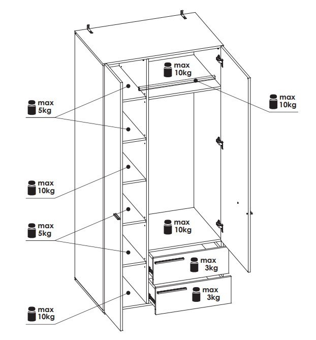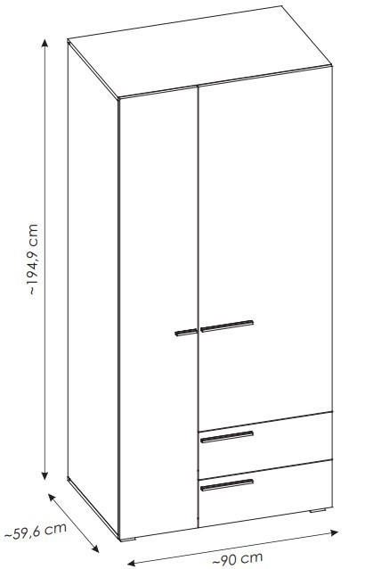 Ponúka prakticky riešené vnútorné vybavenie na prehľadné uskladnenie všetkého oblečenia. Za 2 otočnými dverami nájdete celkom 6 vložených políc a 1 šatníkovú tyč na zavesenie búnd či krčivého oblečenia. Dodatočný úložný priestor ponúka ešte 2 zásuvky v spodnej časti skrine. Skriňa je vyrobená z laminovaného dreveného materiálu, ktorého povrch nie je náročný na údržbu.