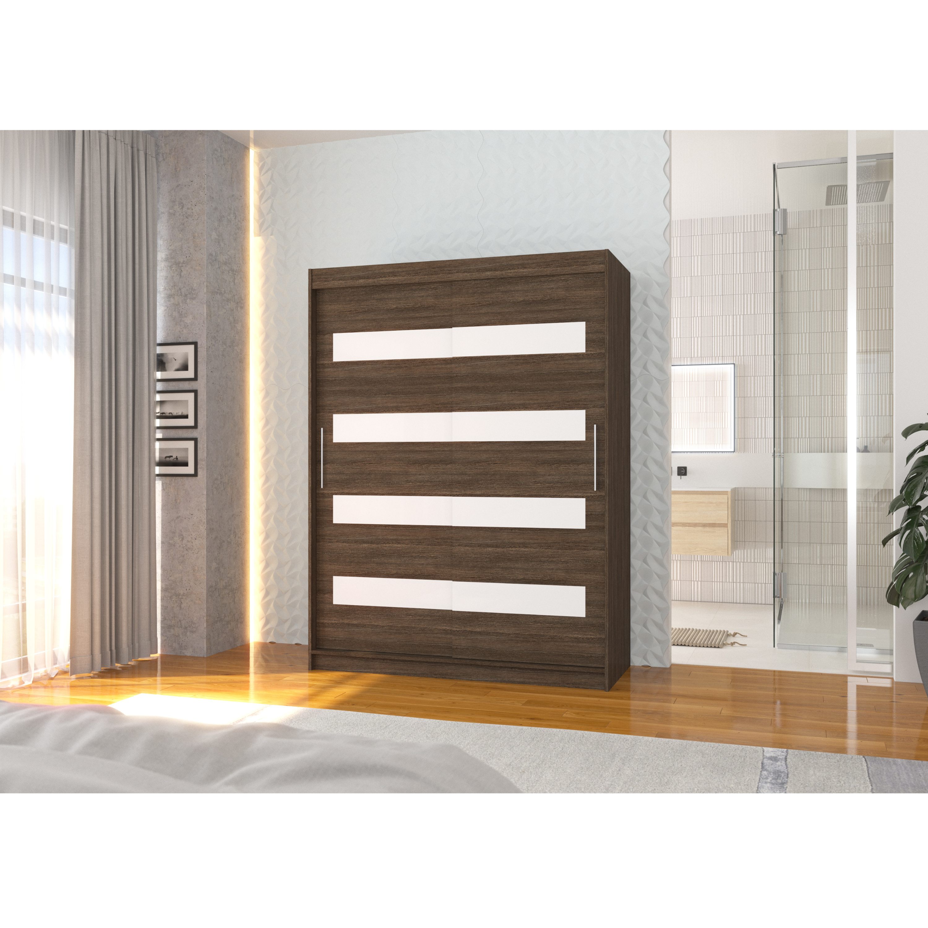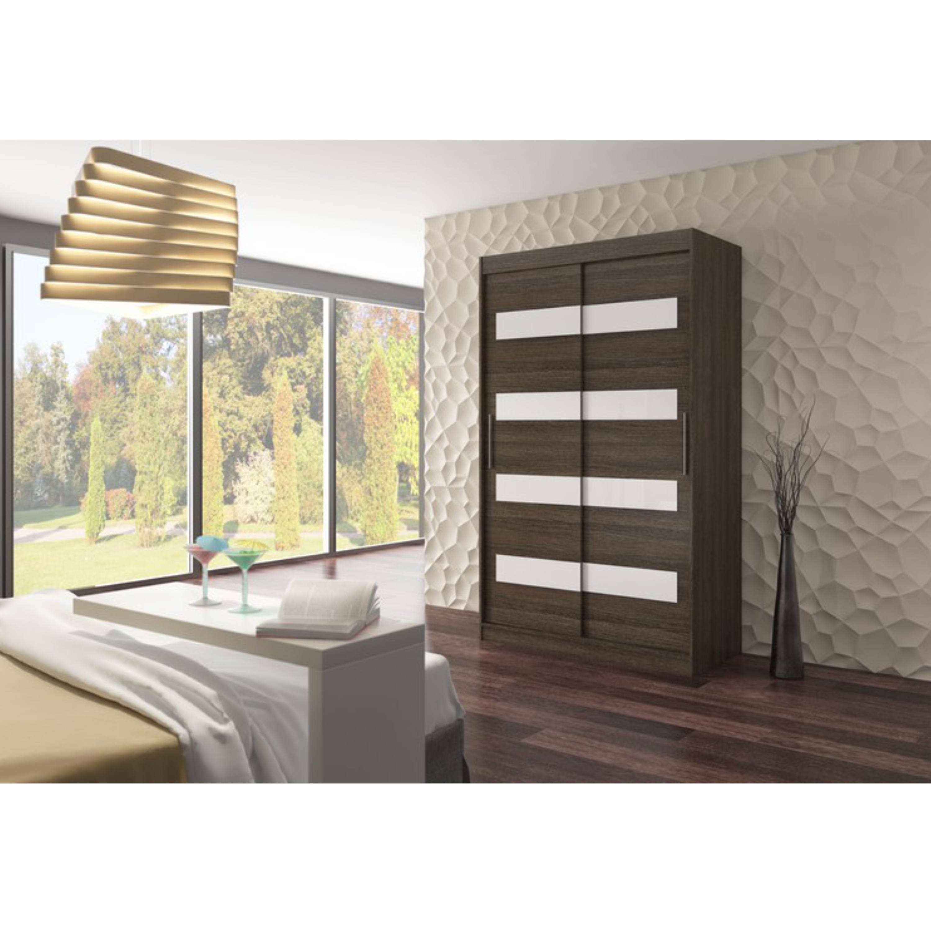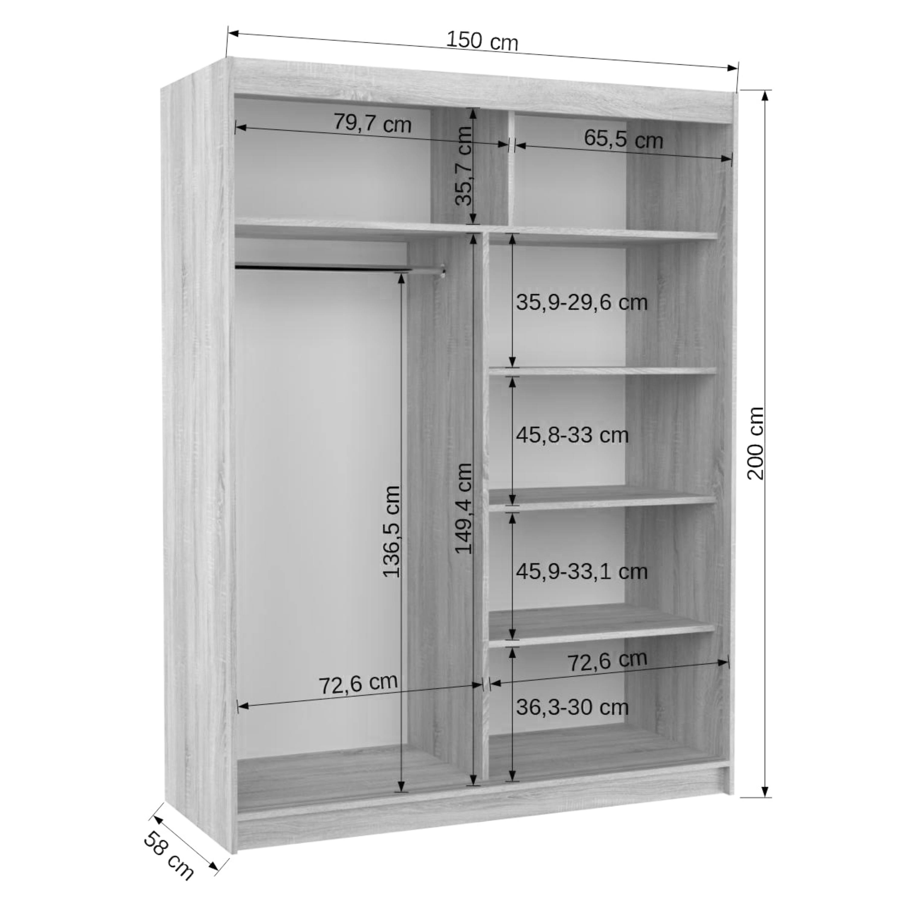 Vnútorné vybavenie pozostáva celkom z 5 políc a 1 šatníkovej tyče na uloženie rôznych typov odevov. Skriňu uzatvárajú posuvné dvere, ktoré šetria cenný priestor vo vnútri aj mimo skriňu. Korpus skrine je vyrobený z laminovaného dreveného materiálu doplneného o ABS hrany chrániace pred mechanickým poškodením.