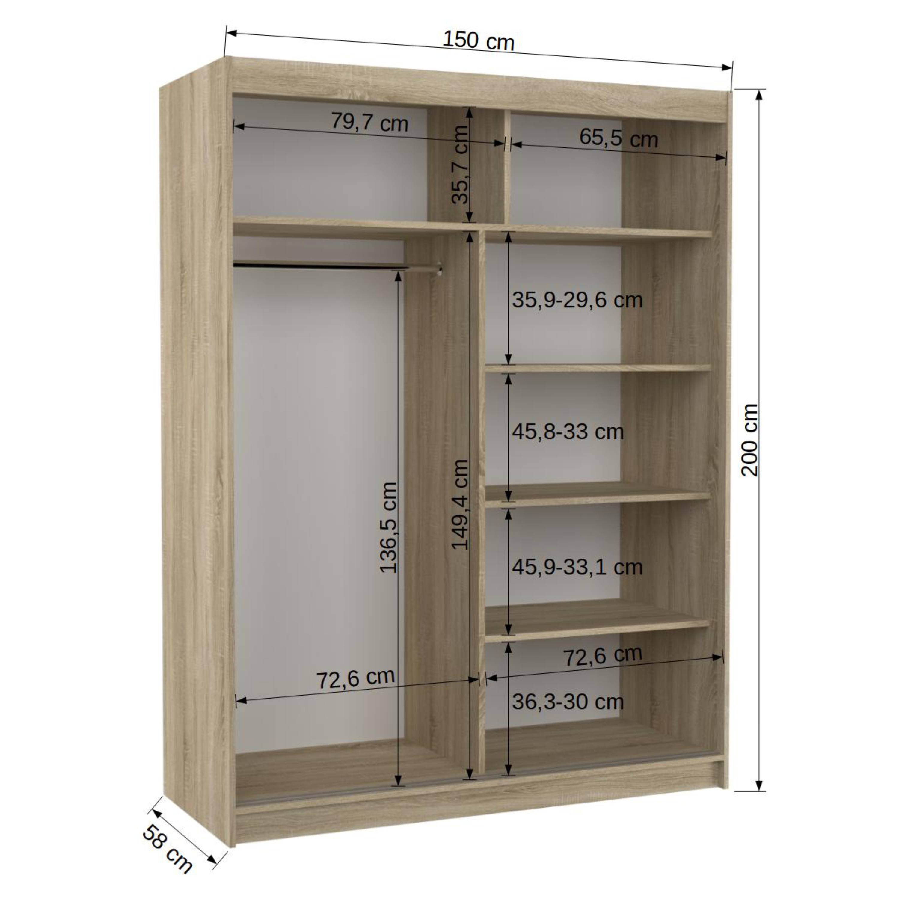 Vnútorné vybavenie pozostáva celkom z 5 políc a 1 šatníkovej tyče na uloženie rôznych typov odevov. Skriňu uzatvárajú posuvné dvere, ktoré šetria cenný priestor vo vnútri aj mimo skriňu. Korpus skrine je vyrobený z laminovaného dreveného materiálu doplneného o ABS hrany chrániace pred mechanickým poškodením.
