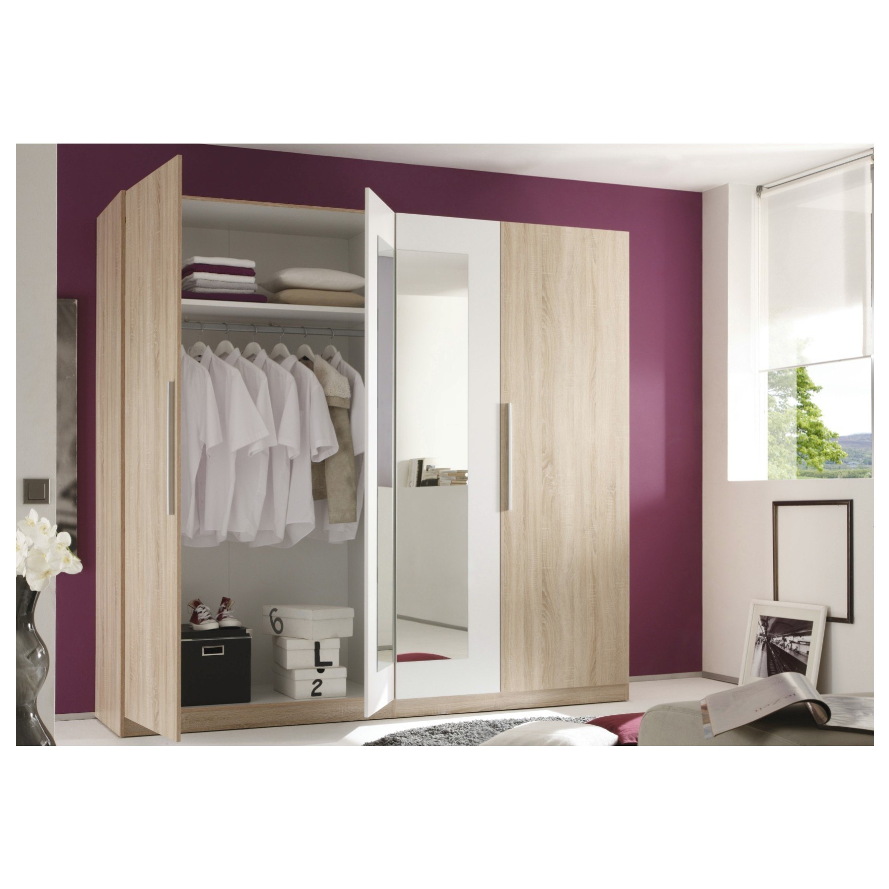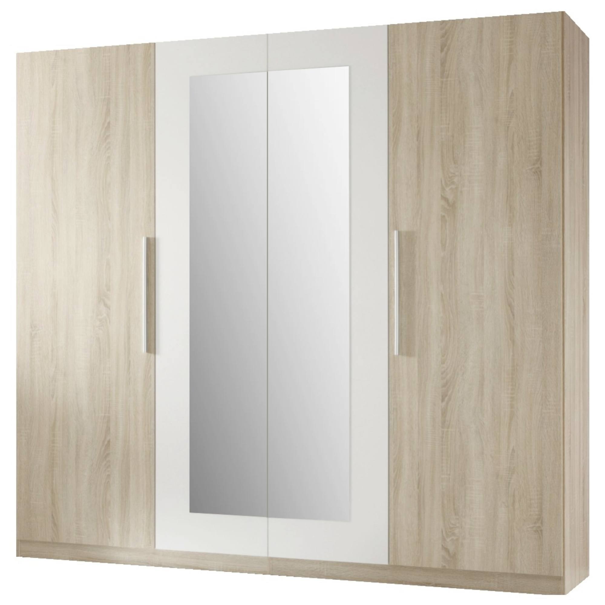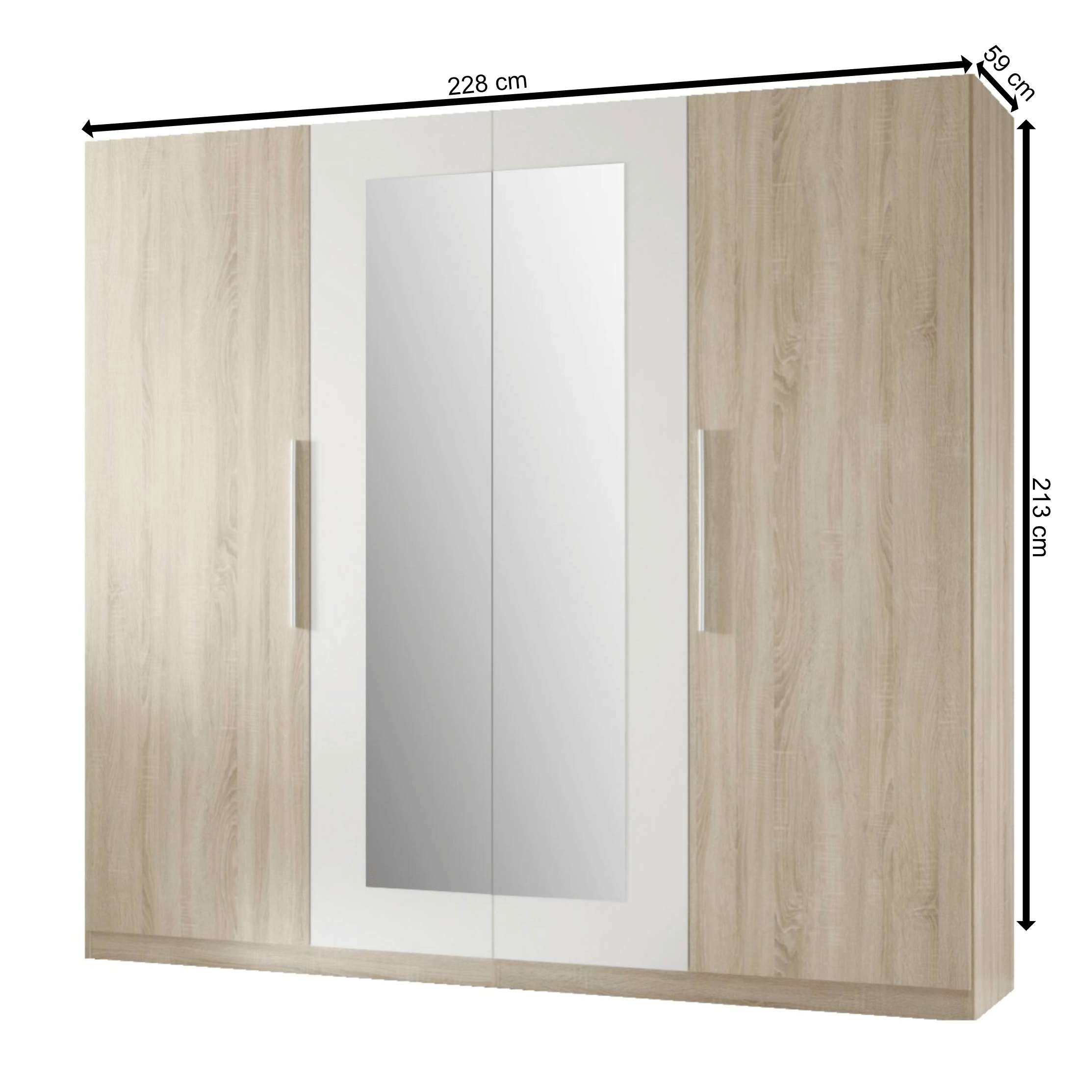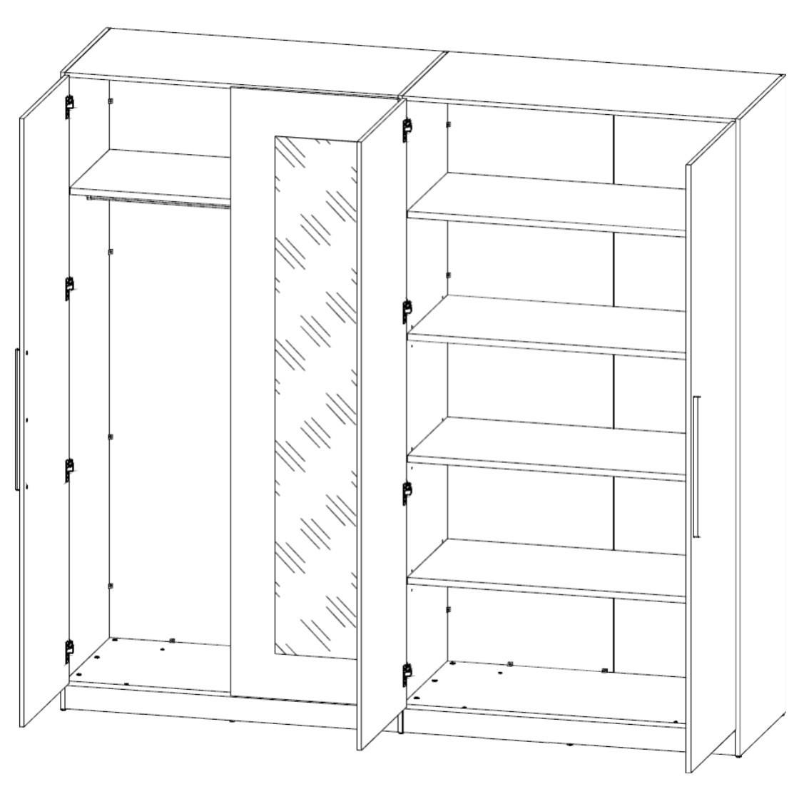 Skriňa disponuje 4 otočnými dverami z ktorých 2 sú vybavené zrkadlom. Vnútorné vybavenie skrine je členené do dvoch veľkých blokov. Prvý blok obsahuje 1 vloženú policu a 1 šatníkovú tyč. Druhý blok má 4 vložené police. Decentné rúčky uľahčujú otváranie jednotlivých častí skrine. Šatníková skriňa je vyrobená z ľahko udržiavateľného dreveného laminovaného materiálu.