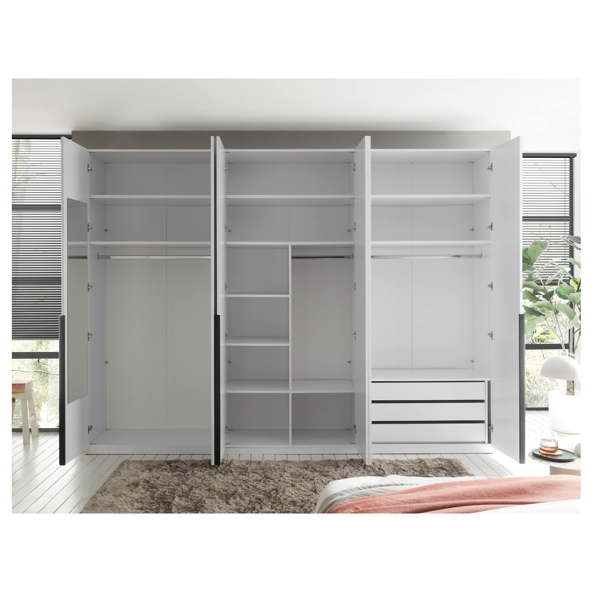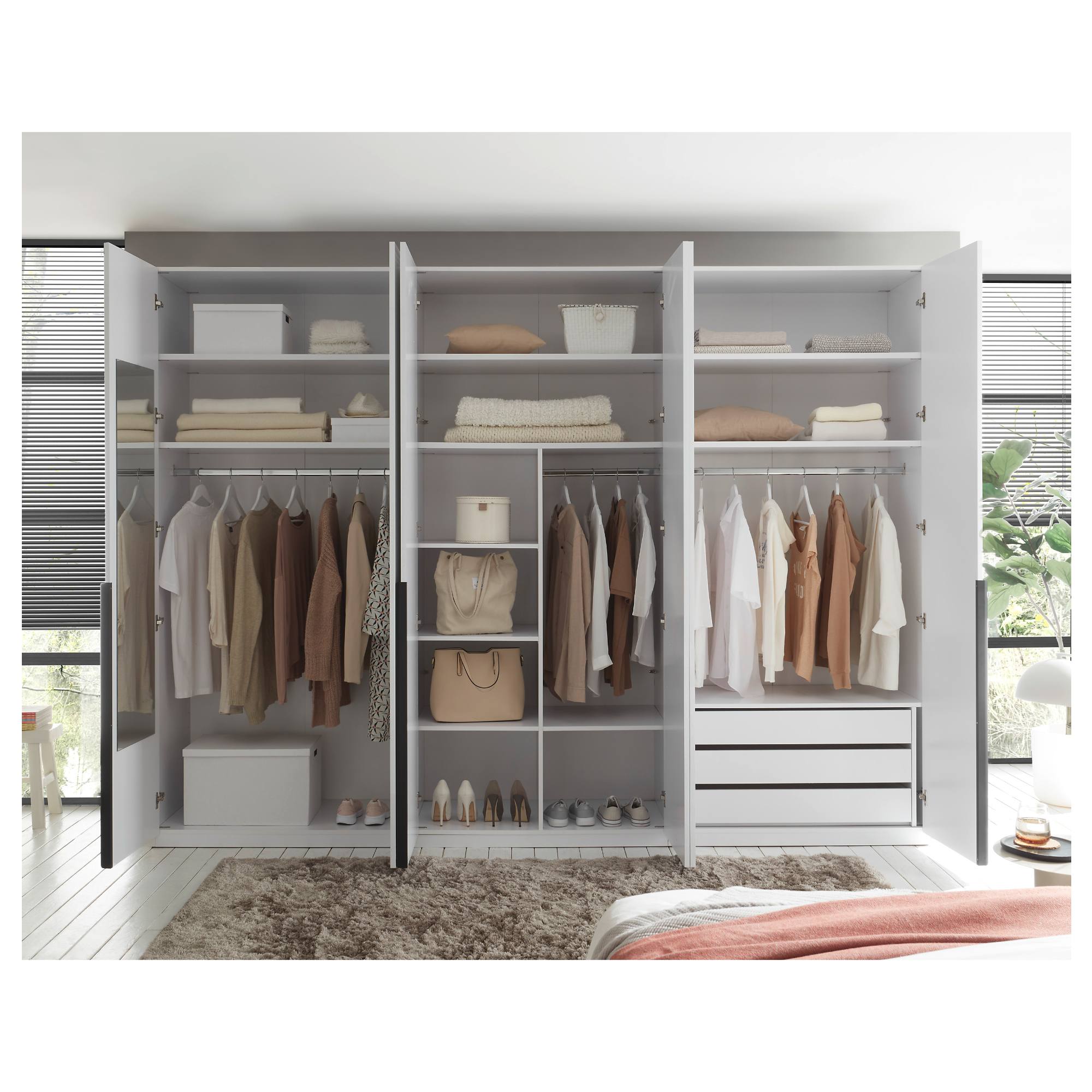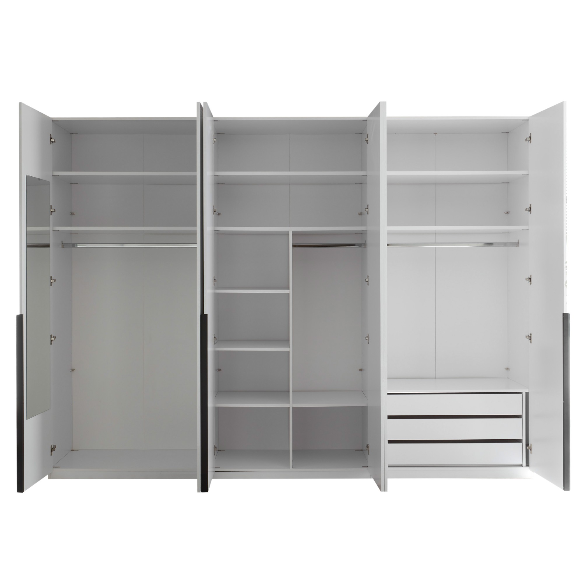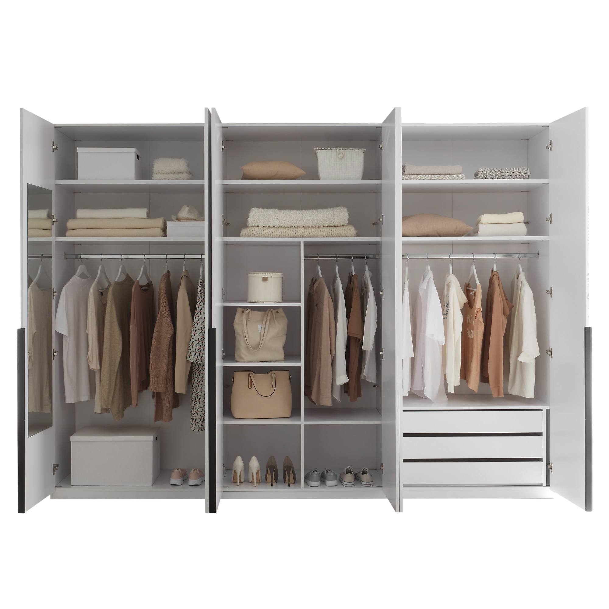 Vo vnútri nájdete bohatý úložný priestor pre prehľadnú organizáciu vášho oblečenia. Skriňa je rozdelená na 3 časti. Ľavá strana je vybavená 2 policami, 1 šatníkovou tyčou a 1 zrkadlom umiestneným na vnútornej strane dverí. V strednej časti nájdete 2 police v hornej časti, ďalšie 3 police v úzkom bočnom paneli a 1 šatníkovú tyč s ďalšou policou. Pravá strana je vybavená 2 policami, 1 šatníkovou tyčou a 3 zásuvkami. Horné police ponúkajú ideálne miesto na uloženie lôžkovín či úložných boxov. Šatníkové tyče sú perfektným pomocníkom na zavesenie šiat, kabátov či oblekov, vďaka čomu zabránite pokrčeniu odevov. Zásuvky je možné využiť na uskladnenie menších doplnkov. Každá časť je vybavená otočnými dverami s 1 úchytom. Dvere sú vyhotovené vo vysokom lesku, ktorý dodáva skrini luxusný vzhľad.