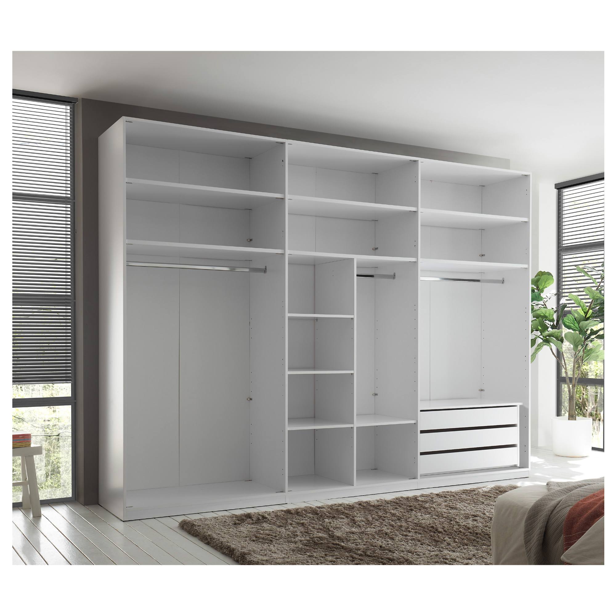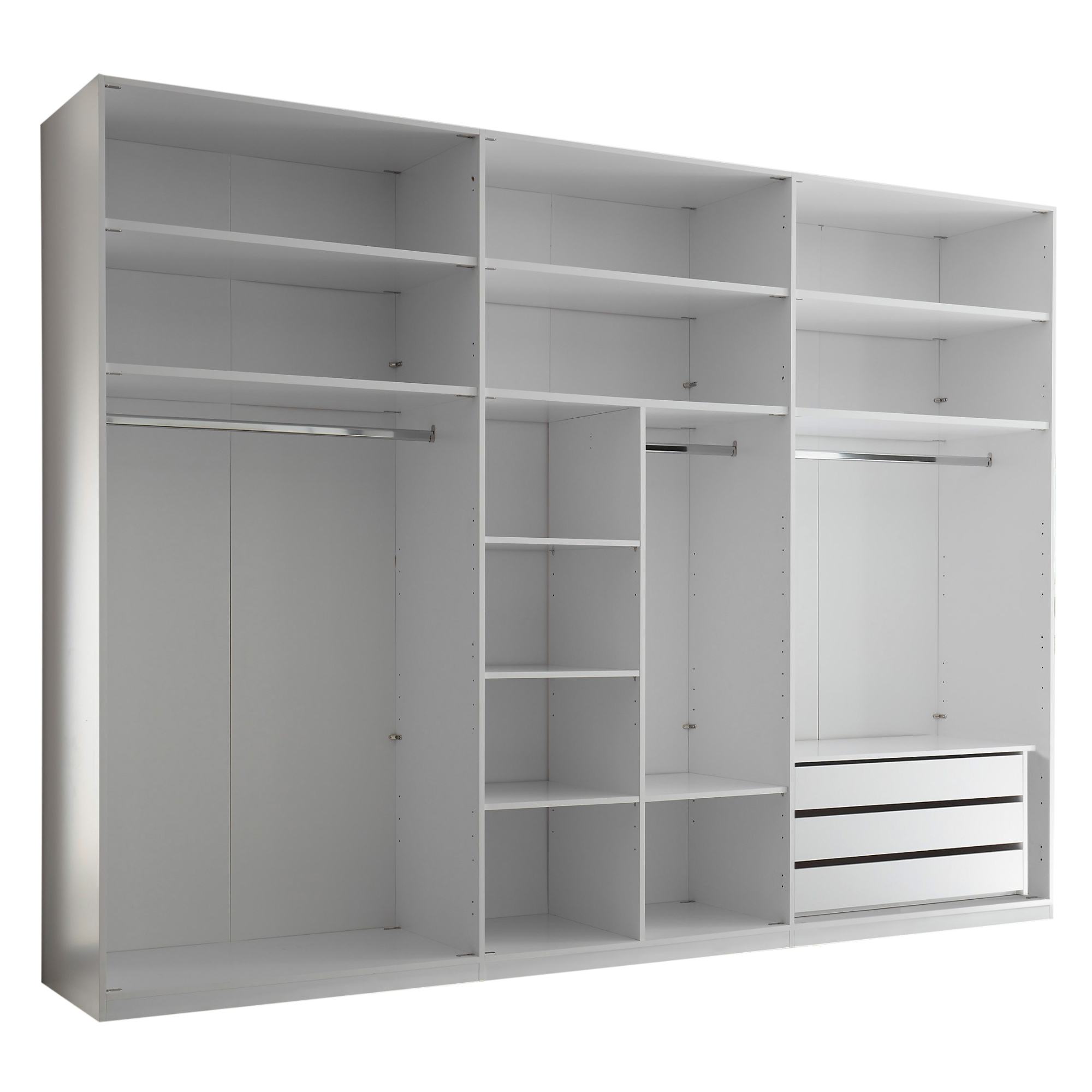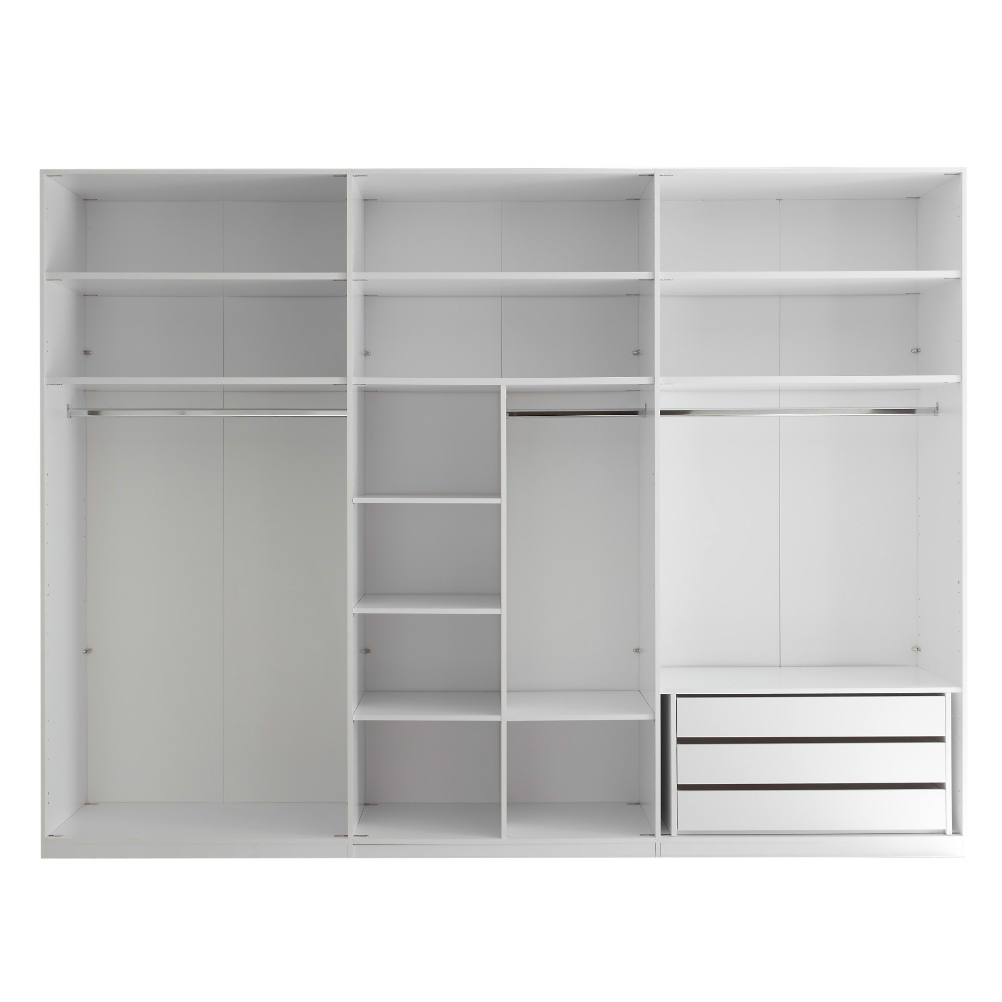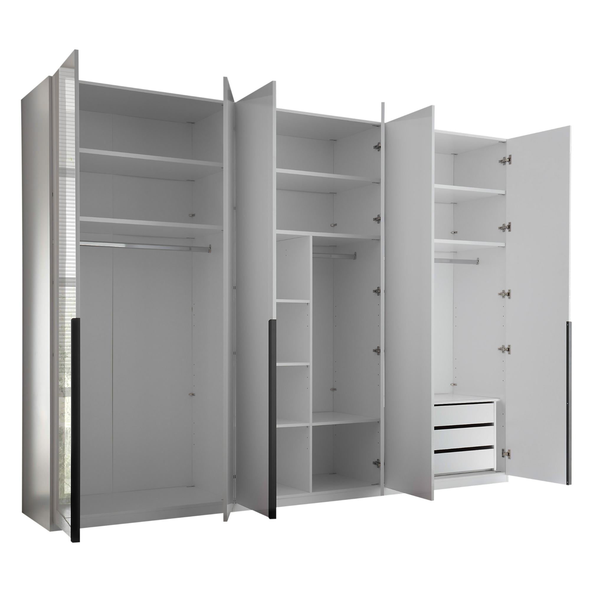 Vo vnútri nájdete bohatý úložný priestor pre prehľadnú organizáciu vášho oblečenia. Skriňa je rozdelená na 3 časti. Ľavá strana je vybavená 2 policami, 1 šatníkovou tyčou a 1 zrkadlom umiestneným na vnútornej strane dverí. V strednej časti nájdete 2 police v hornej časti, ďalšie 3 police v úzkom bočnom paneli a 1 šatníkovú tyč s ďalšou policou. Pravá strana je vybavená 2 policami, 1 šatníkovou tyčou a 3 zásuvkami. Horné police ponúkajú ideálne miesto na uloženie lôžkovín či úložných boxov. Šatníkové tyče sú perfektným pomocníkom na zavesenie šiat, kabátov či oblekov, vďaka čomu zabránite pokrčeniu odevov. Zásuvky je možné využiť na uskladnenie menších doplnkov. Každá časť je vybavená otočnými dverami s 1 úchytom. Dvere sú vyhotovené vo vysokom lesku, ktorý dodáva skrini luxusný vzhľad.