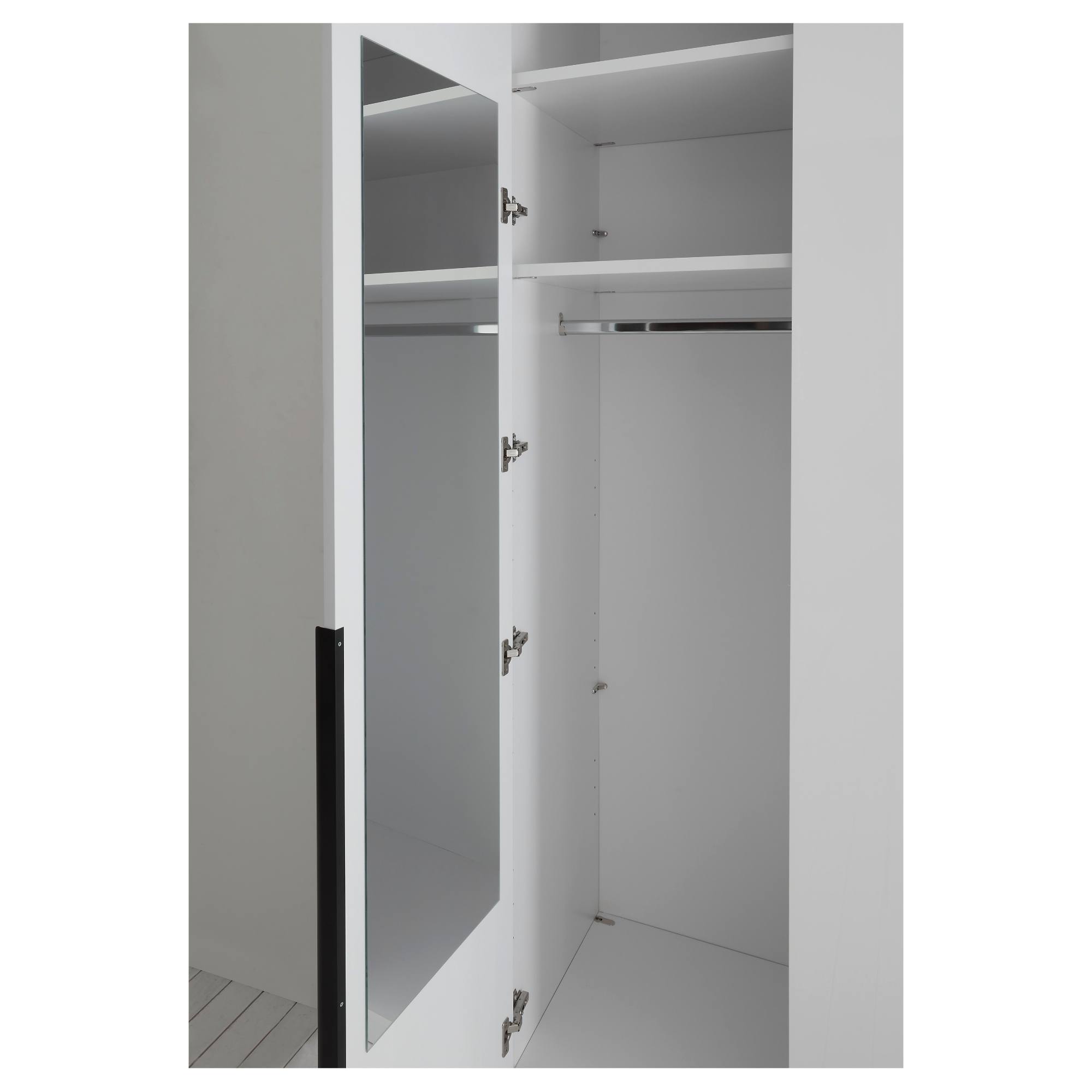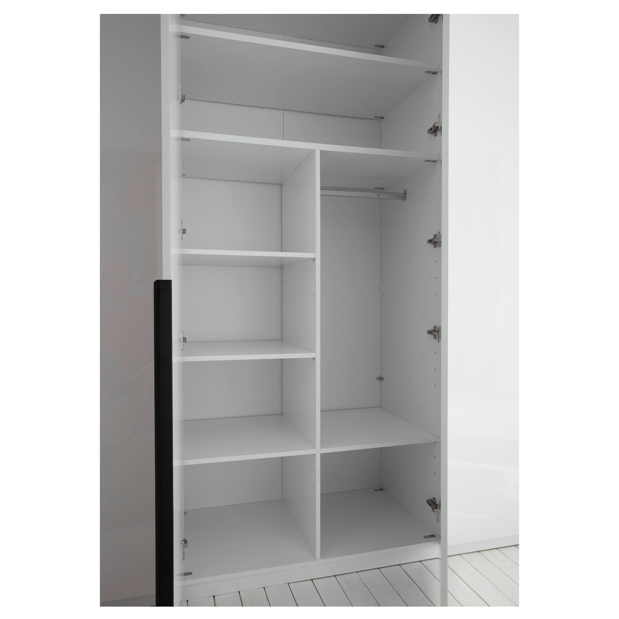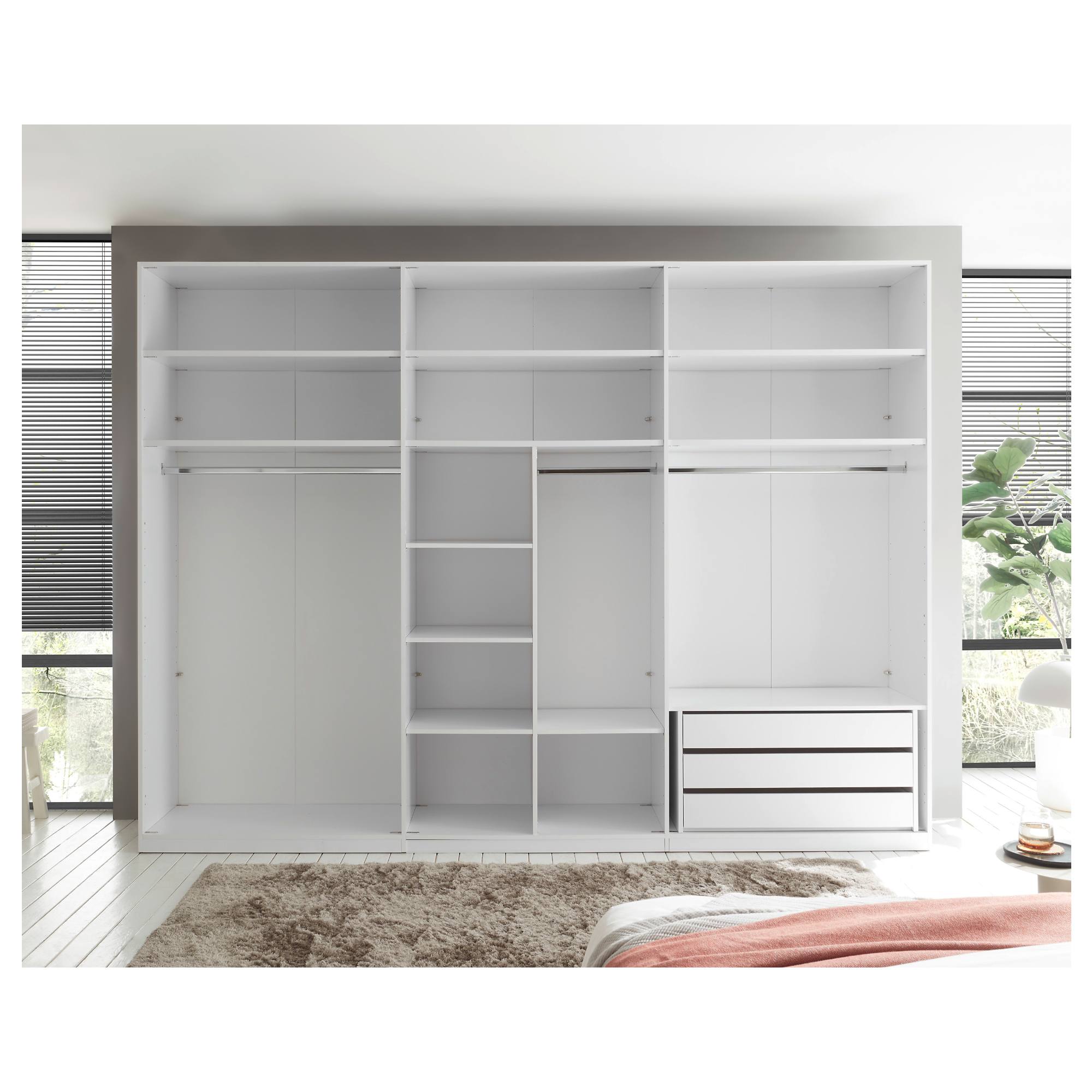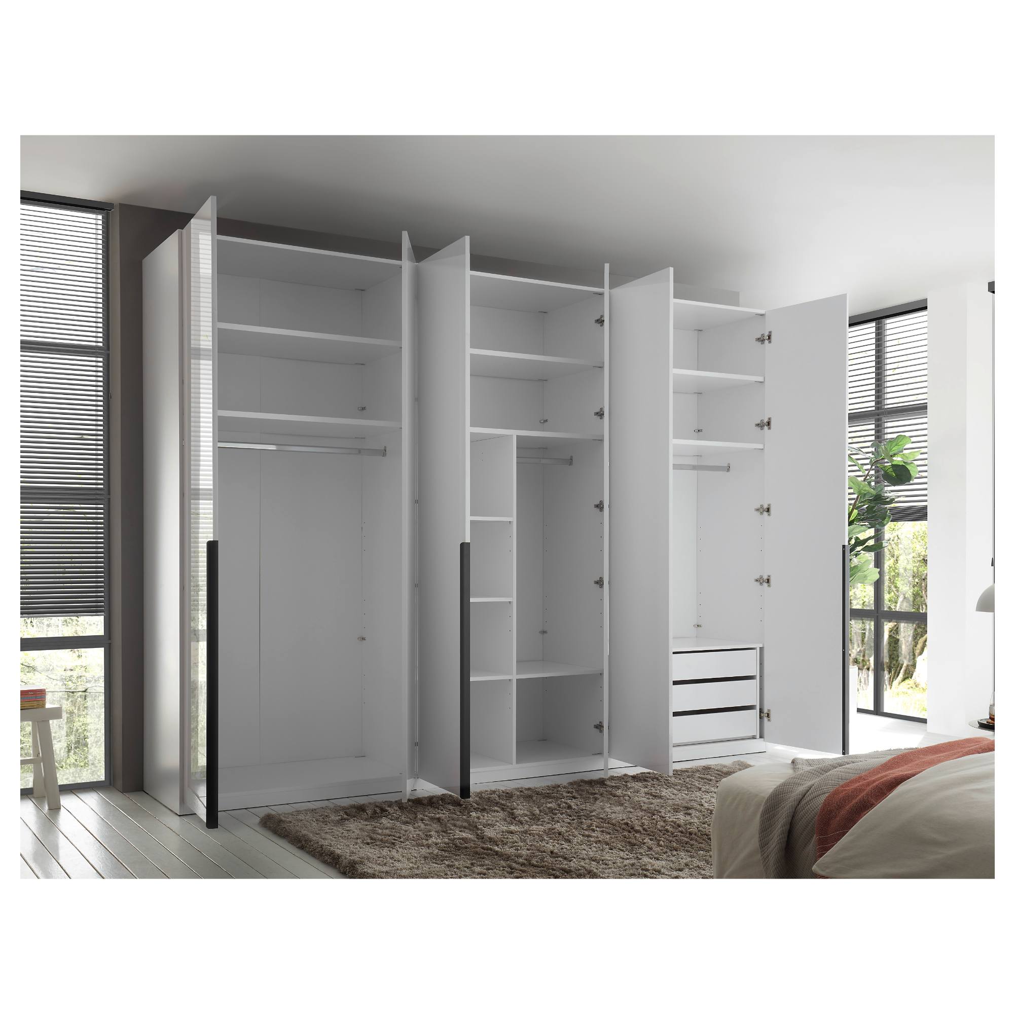 Vo vnútri nájdete bohatý úložný priestor pre prehľadnú organizáciu vášho oblečenia. Skriňa je rozdelená na 3 časti. Ľavá strana je vybavená 2 policami, 1 šatníkovou tyčou a 1 zrkadlom umiestneným na vnútornej strane dverí. V strednej časti nájdete 2 police v hornej časti, ďalšie 3 police v úzkom bočnom paneli a 1 šatníkovú tyč s ďalšou policou. Pravá strana je vybavená 2 policami, 1 šatníkovou tyčou a 3 zásuvkami. Horné police ponúkajú ideálne miesto na uloženie lôžkovín či úložných boxov. Šatníkové tyče sú perfektným pomocníkom na zavesenie šiat, kabátov či oblekov, vďaka čomu zabránite pokrčeniu odevov. Zásuvky je možné využiť na uskladnenie menších doplnkov. Každá časť je vybavená otočnými dverami s 1 úchytom. Dvere sú vyhotovené vo vysokom lesku, ktorý dodáva skrini luxusný vzhľad.