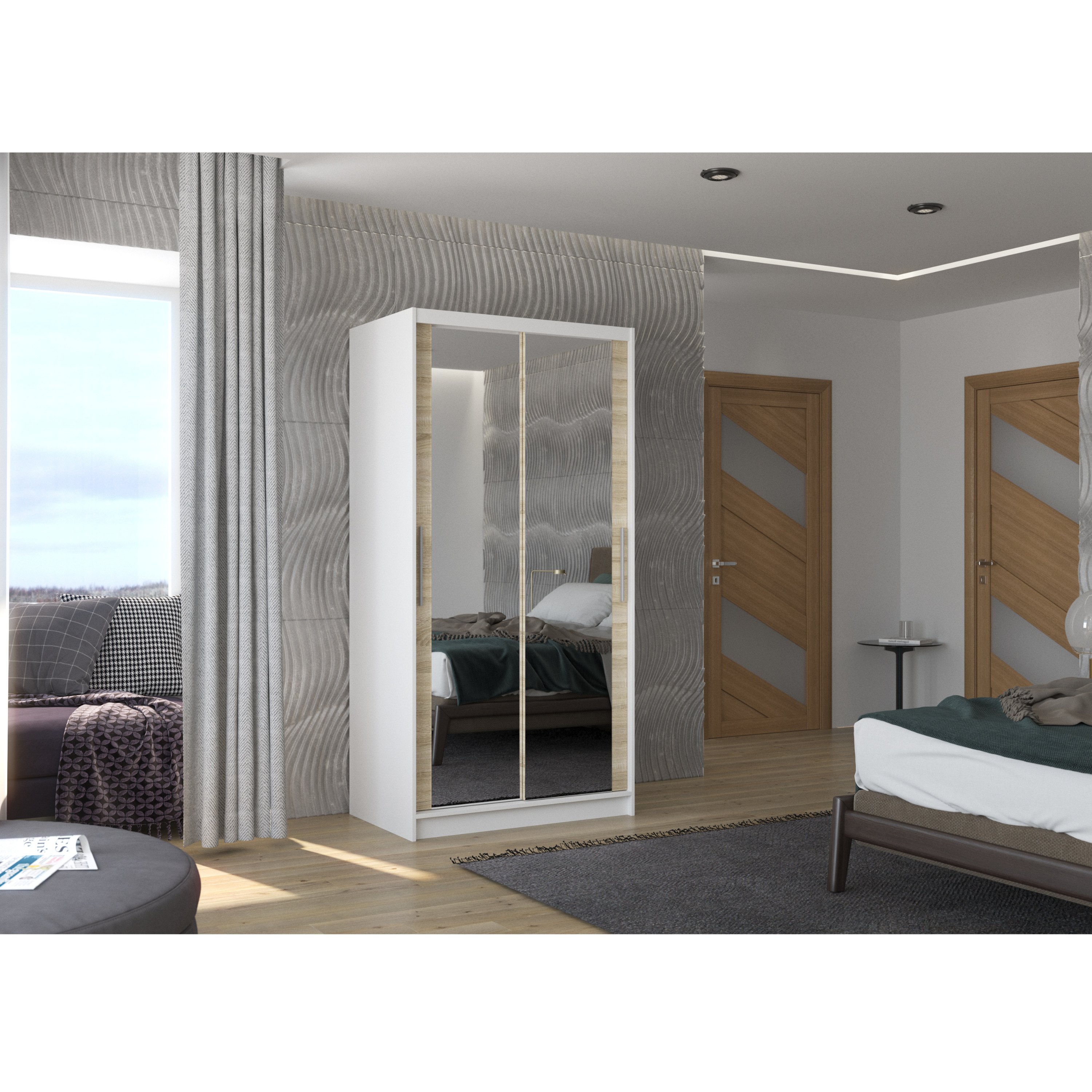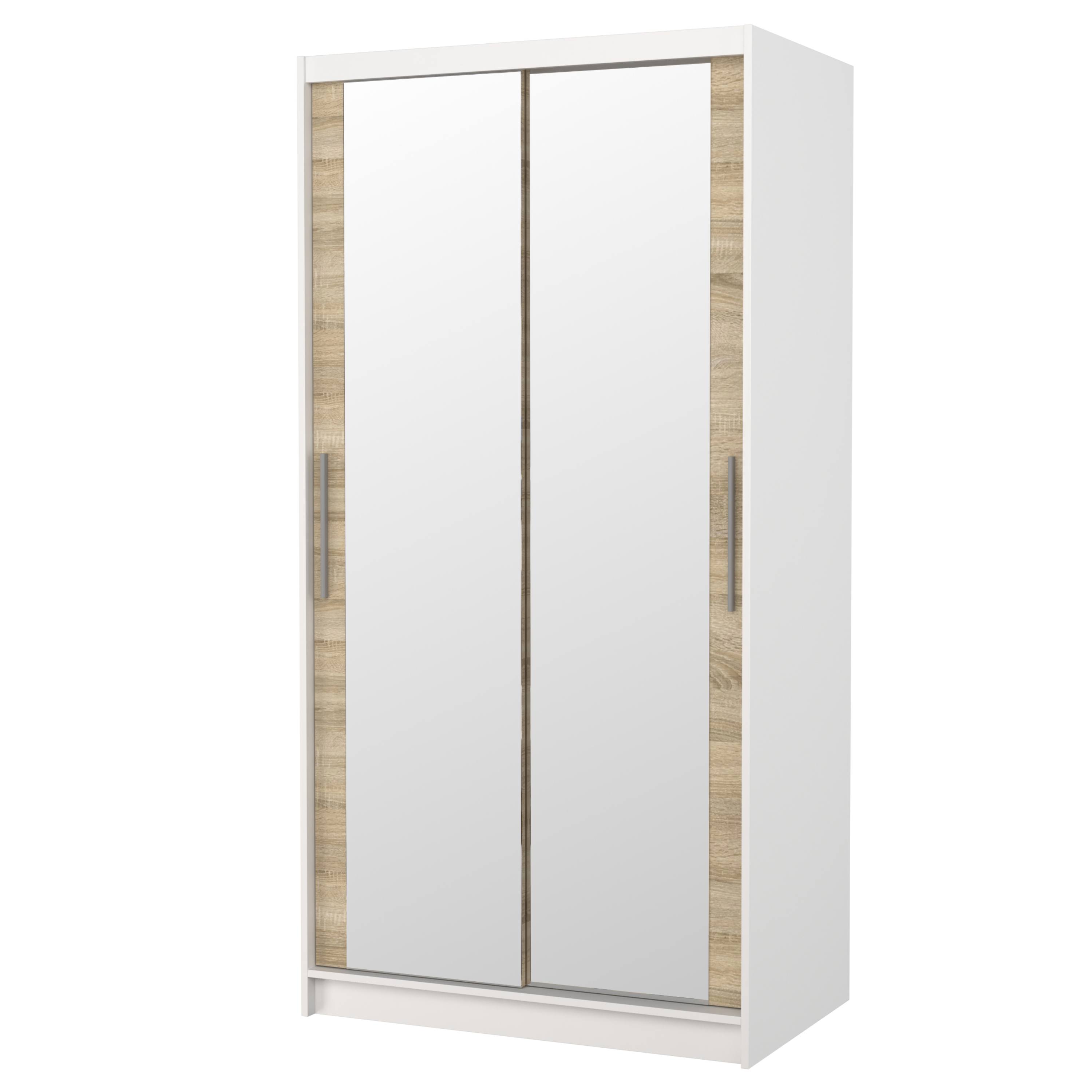 Skriňa je vybavená párom posuvných dverí, ktorých otváranie uľahčujú výrazné úchyty. Súčasťou dverí sú aj praktické zrkadlové plochy, vďaka ktorým si môžete kedykoľvek upraviť svoj vzhľad. Vnútorný priestor je vybavený celkovo 4 policami na prehľadné uloženie poskladaného oblečenia alebo aj sezónnych doplnkov, a tiež šatníkovou tyčou, ktorá je ideálna na zavesenie objemných alebo krčivých odevov. Skriňa je vyrobená z laminovaného dreveného materiálu doplneného o ABS hrany, ktoré chránia pred mechanickým poškodením. Vďaka svojej kompaktnej veľkosti je skvelou voľbou aj do menších interiérov.