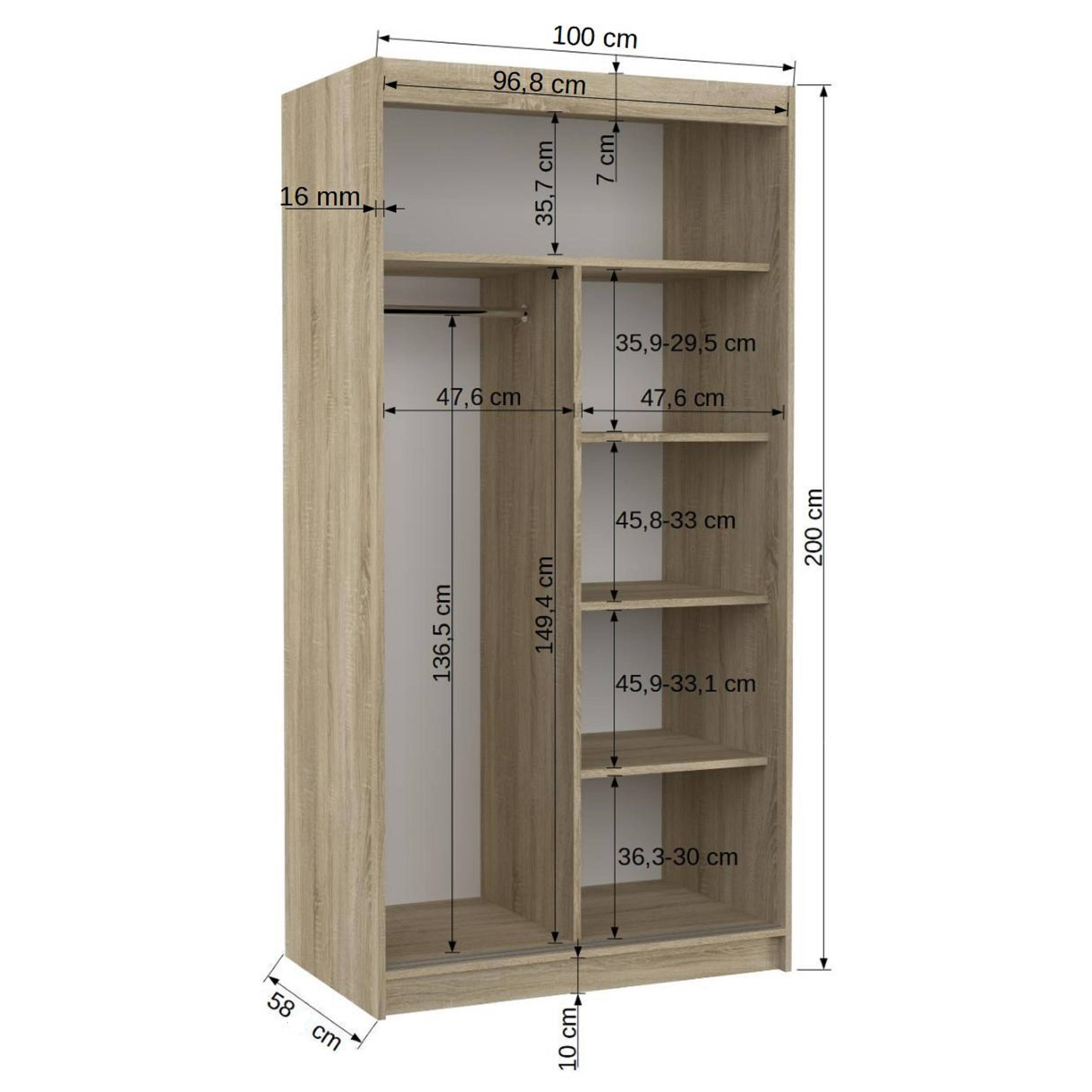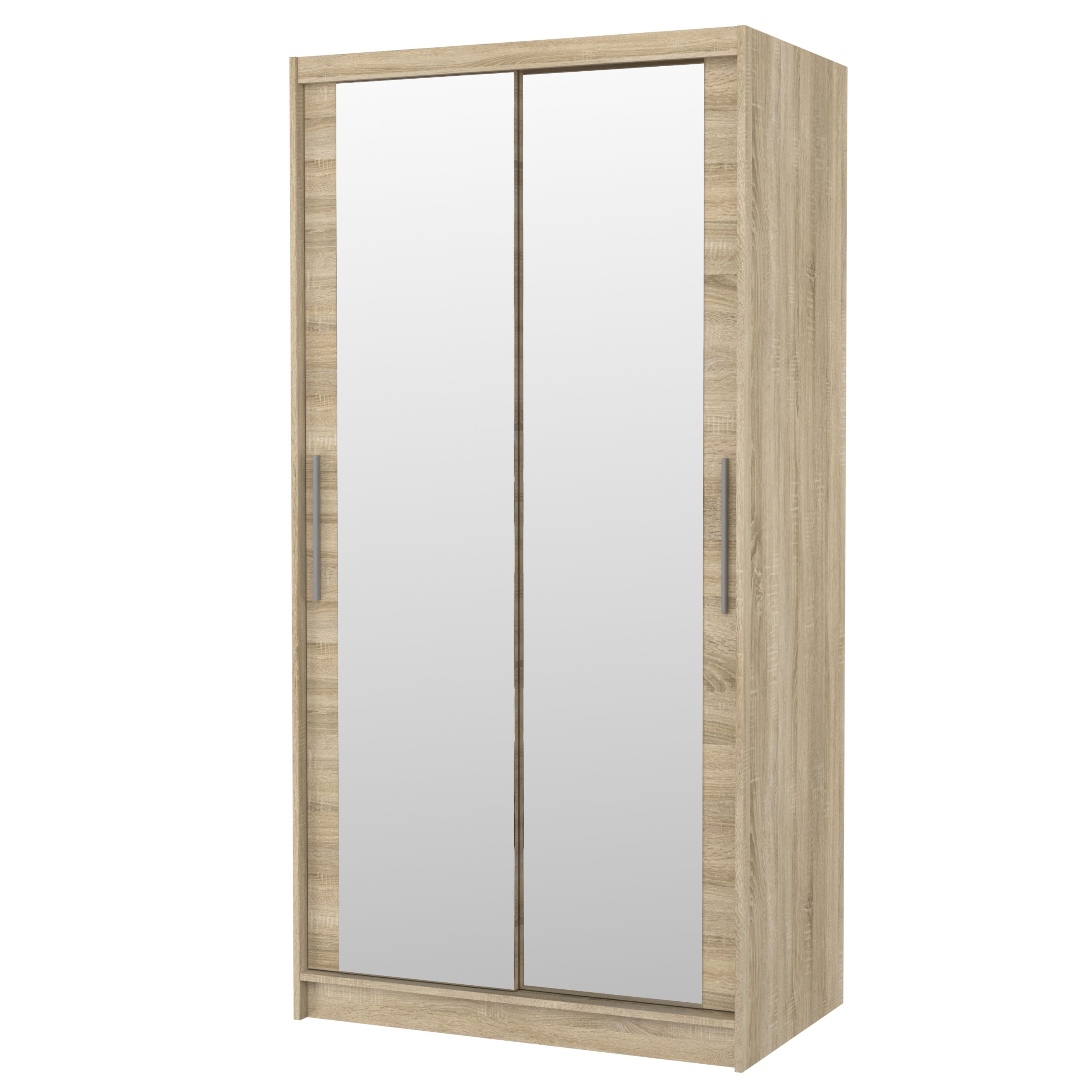 Skriňa je vybavená párom posuvných dverí, ktorých otváranie uľahčujú výrazné úchyty. Súčasťou dverí sú aj praktické zrkadlové plochy, vďaka ktorým si môžete kedykoľvek upraviť svoj vzhľad. Vnútorný priestor je vybavený celkovo 4 policami na prehľadné uloženie poskladaného oblečenia alebo aj sezónnych doplnkov, a tiež šatníkovou tyčou, ktorá je ideálna na zavesenie objemných alebo krčivých odevov. Skriňa je vyrobená z laminovaného dreveného materiálu doplneného o ABS hrany, ktoré chránia pred mechanickým poškodením. Vďaka svojej kompaktnej veľkosti je skvelou voľbou aj do menších interiérov.