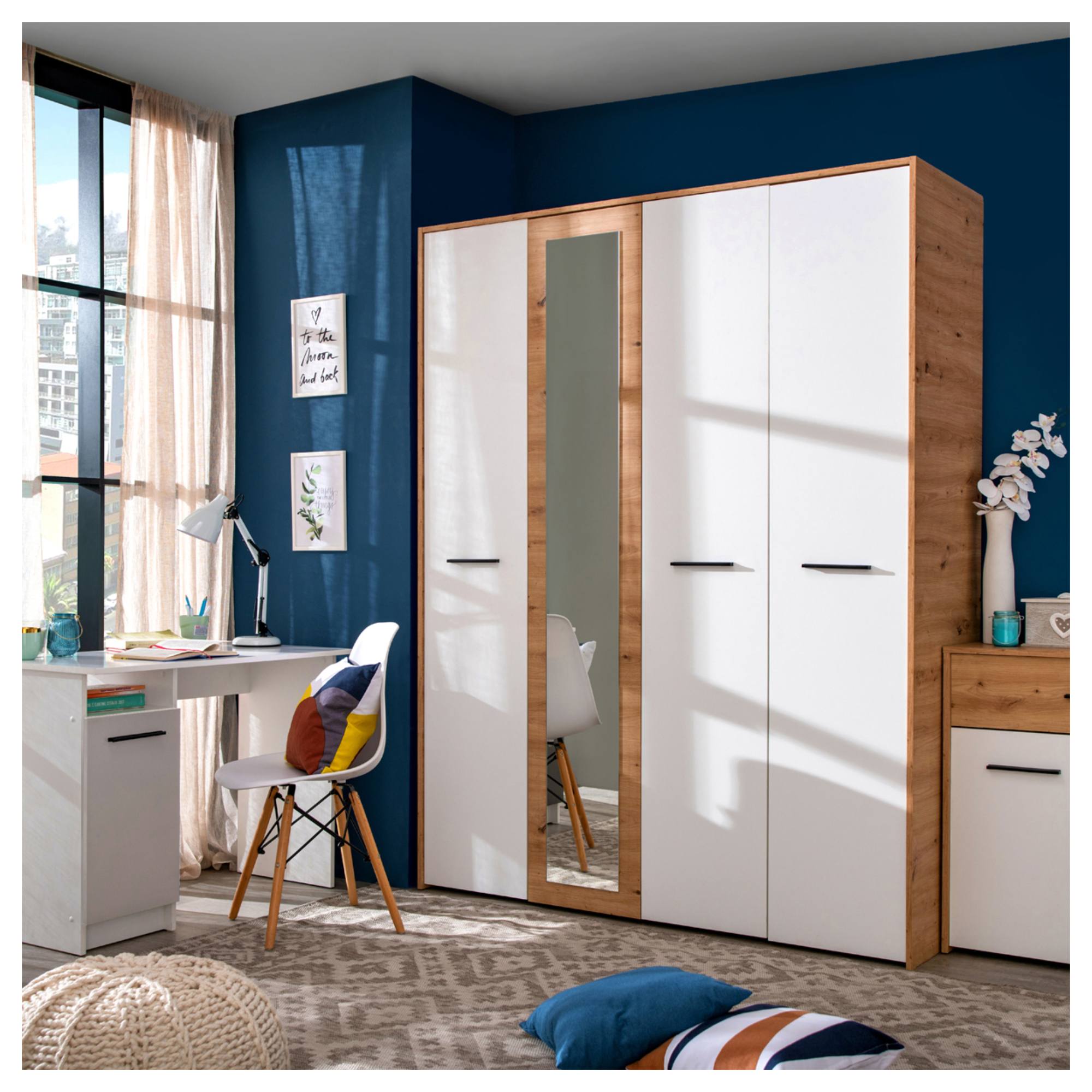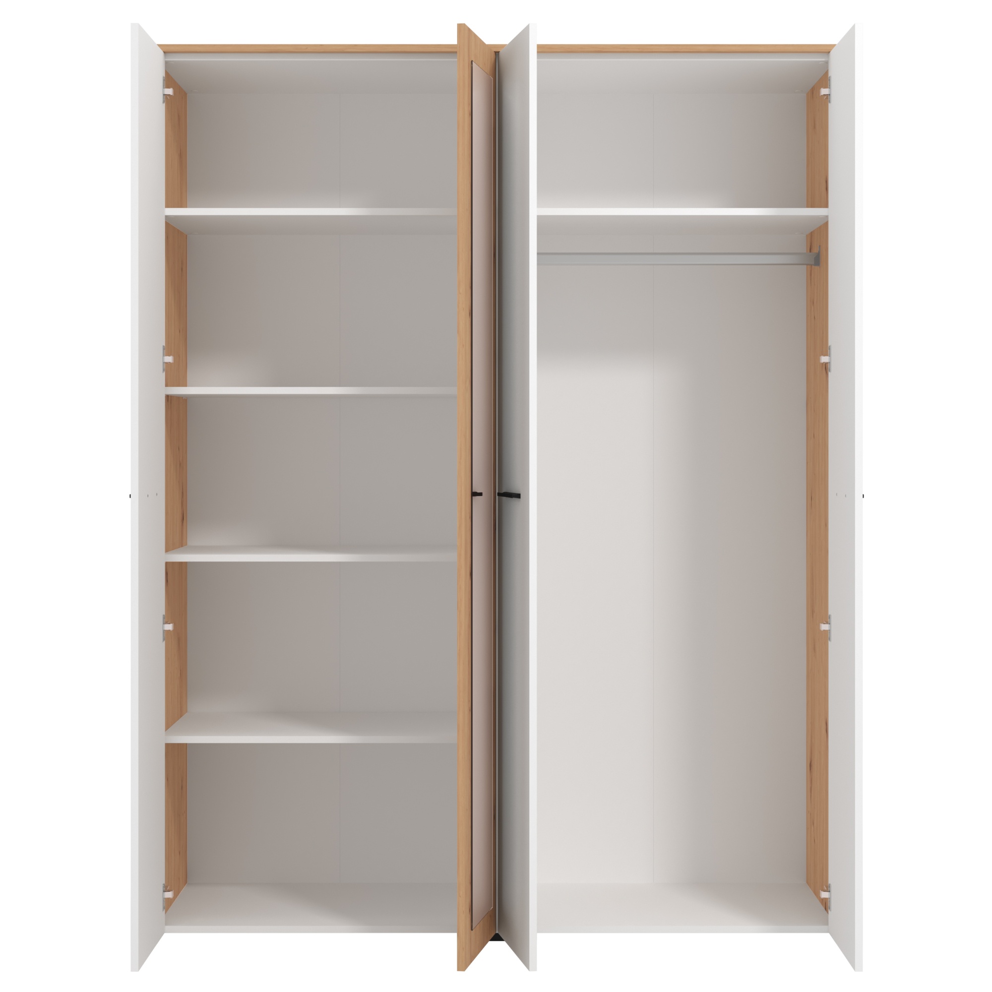 Skriňa disponuje 2 pármi otočných dverí, ktoré sú na jednoduchšiu manipuláciu vybavené praktickými rúčkami. Jedny z centrálnych dverí sú zrkadlové, takže pomôžu presvetliť miestnosť a zároveň si v nich môžete kedykoľvek skontrolovať svoj vzhľad. Vnútorný priestor je vybavený šatníkovou tyčou a 5 vloženými policami. Všetko oblečenie a doplnky tak budú vždy prehľadne usporiadané a budete k nim mať ľahký prístup. Skriňa je vyrobená z laminovaného dreveného materiálu, ktorý sa vyznačuje ľahkou udržiavateľnosťou.