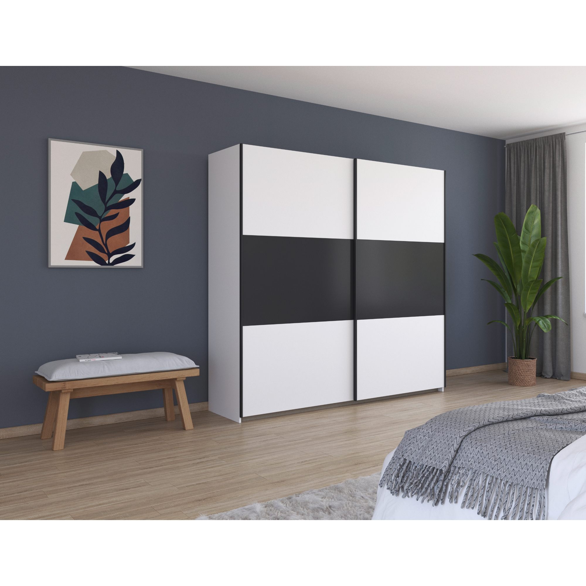 Skriňa je uzatvárateľná pomocou 2 posuvných dverí, ktoré šetria cenné miesto zvonku aj vo vnútri skrine. Vnútorné vybavenie skrine pozostáva celkom z 2 vložených políc a 2 šatníkových tyčí s flexibilným usporiadaním. Skriňa tak ponúka dostatok miesta na uloženie vášho oblečenia a doplnkov. Vyrobená je z drevotriesky s povrchom nenáročným na údržbu.