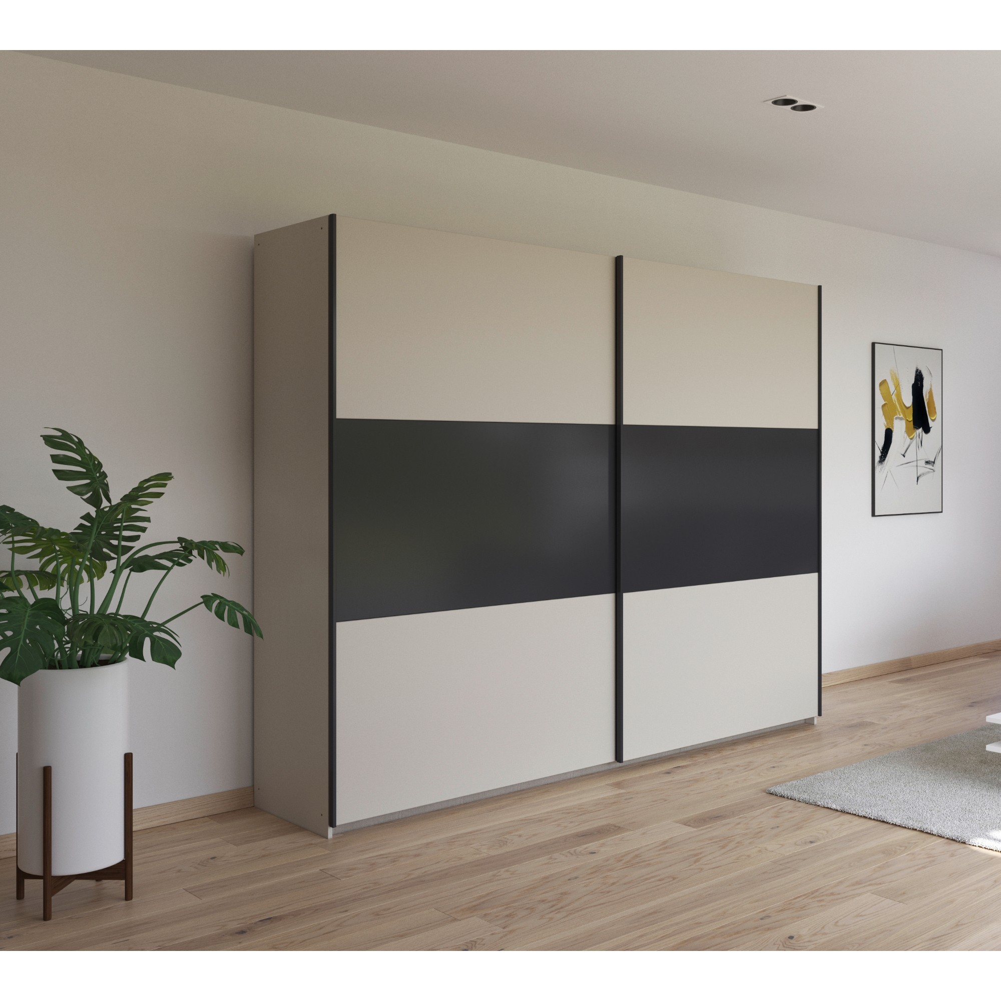 Skriňa je uzatvárateľná pomocou 2 posuvných dverí, ktoré šetria cenné miesto zvonku aj vo vnútri skrine. Vnútorné vybavenie skrine pozostáva celkom z 3 vložených políc a 3 šatníkových tyčí s flexibilným usporiadaním. Skriňa tak ponúka dostatok miesta na uloženie vášho oblečenia a doplnkov. Vyrobená je z drevotriesky s povrchom nenáročným na údržbu.