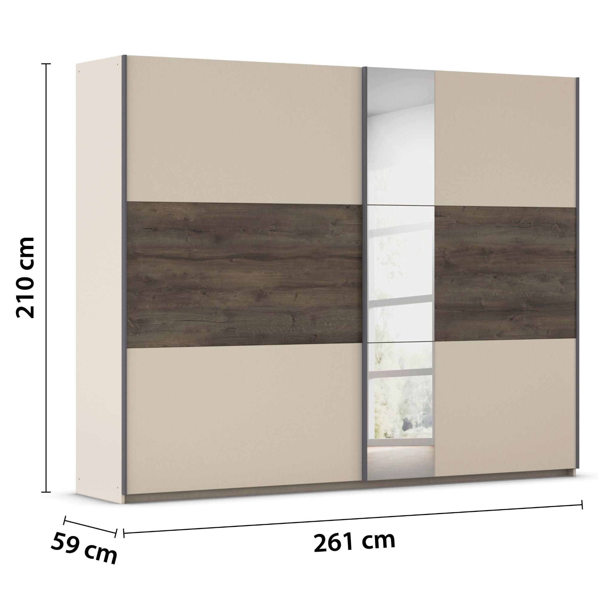 Skriňa je uzatvárateľná pomocou 2 posuvných dverí, ktoré šetria cenné miesto zvonku aj vo vnútri skrine. Jedny z dverí sú navyše vybavené zrkadlom, ktoré spoľahlivo presvetlí miestnosť. Vnútorné vybavenie skrine pozostáva celkom z 3 vložených políc a 3 šatníkových tyčí s flexibilným usporiadaním. Skriňa tak ponúka dostatok miesta na uloženie vášho oblečenia a doplnkov a zároveň umožňuje prispôsobenie sa potrebám užívateľa. Skriňa je vyrobená z dreveného materiálu s povrchom nenáročným na údržbu.