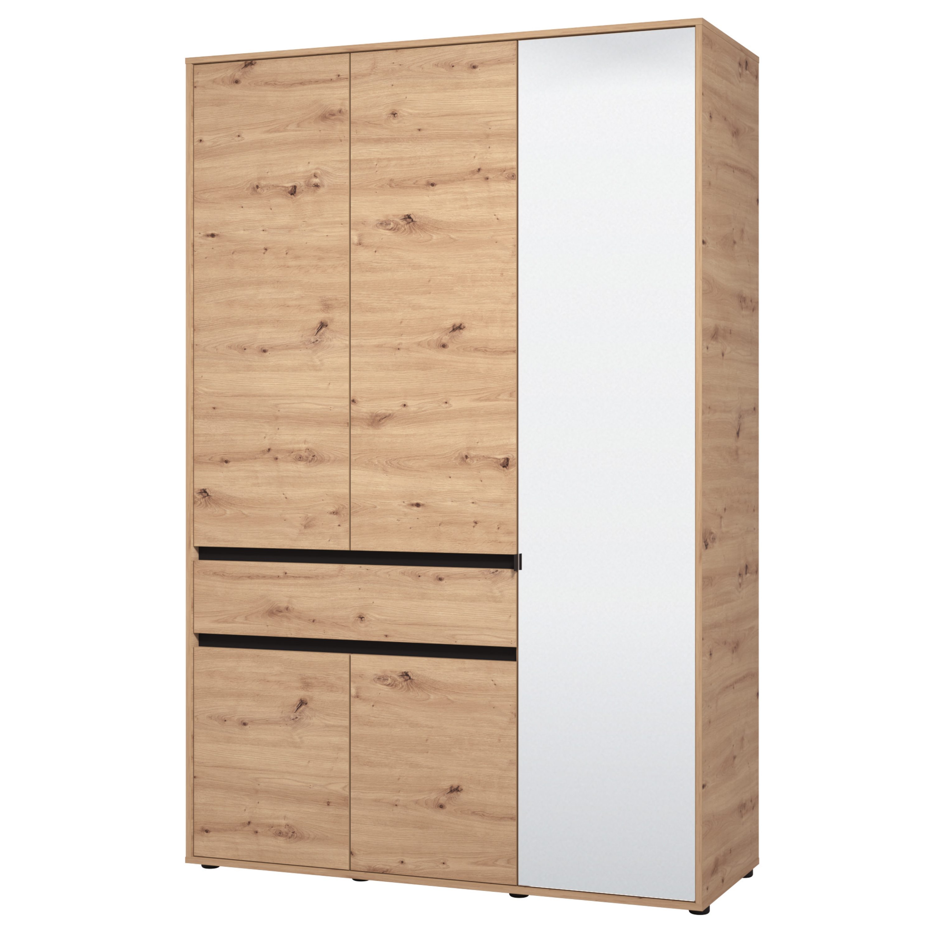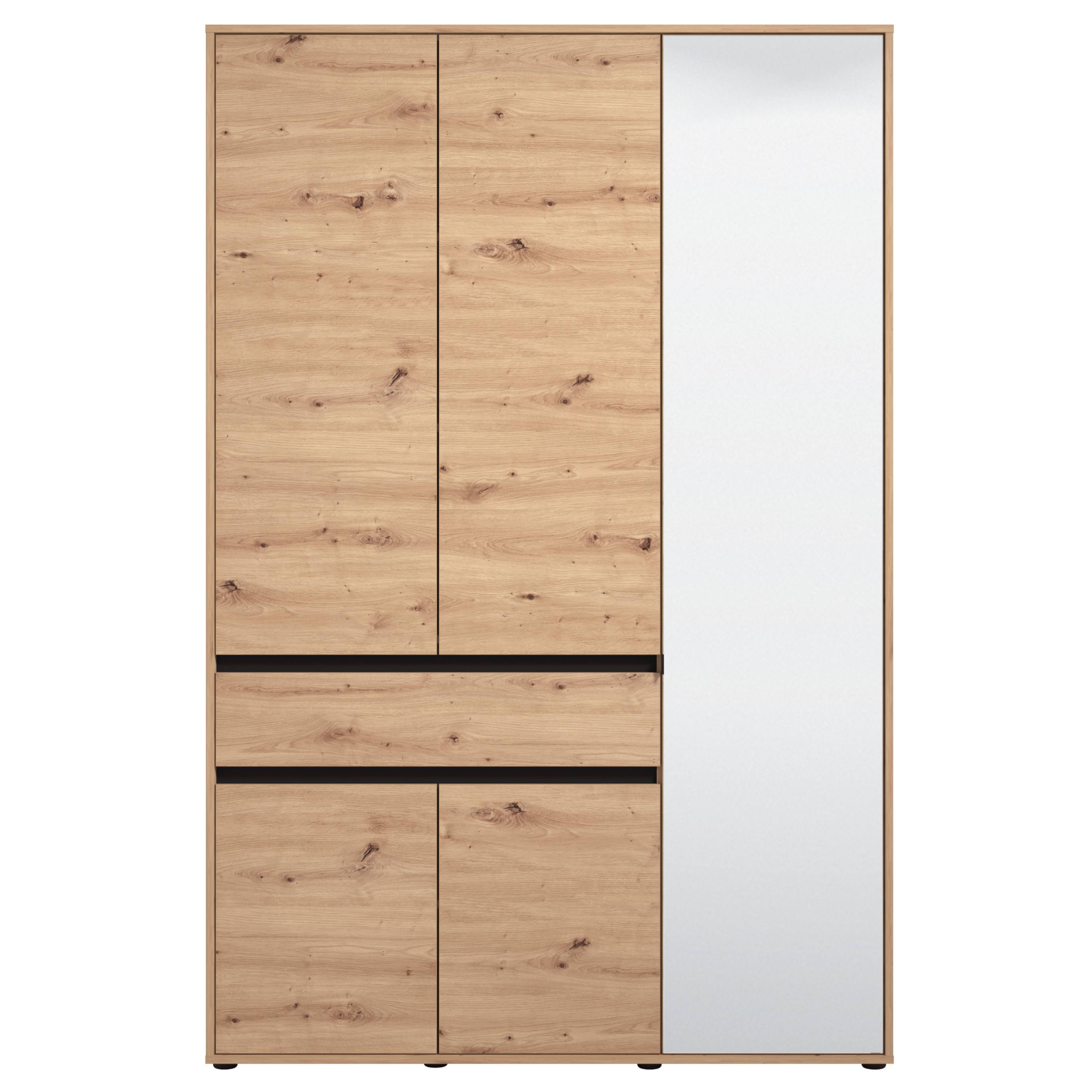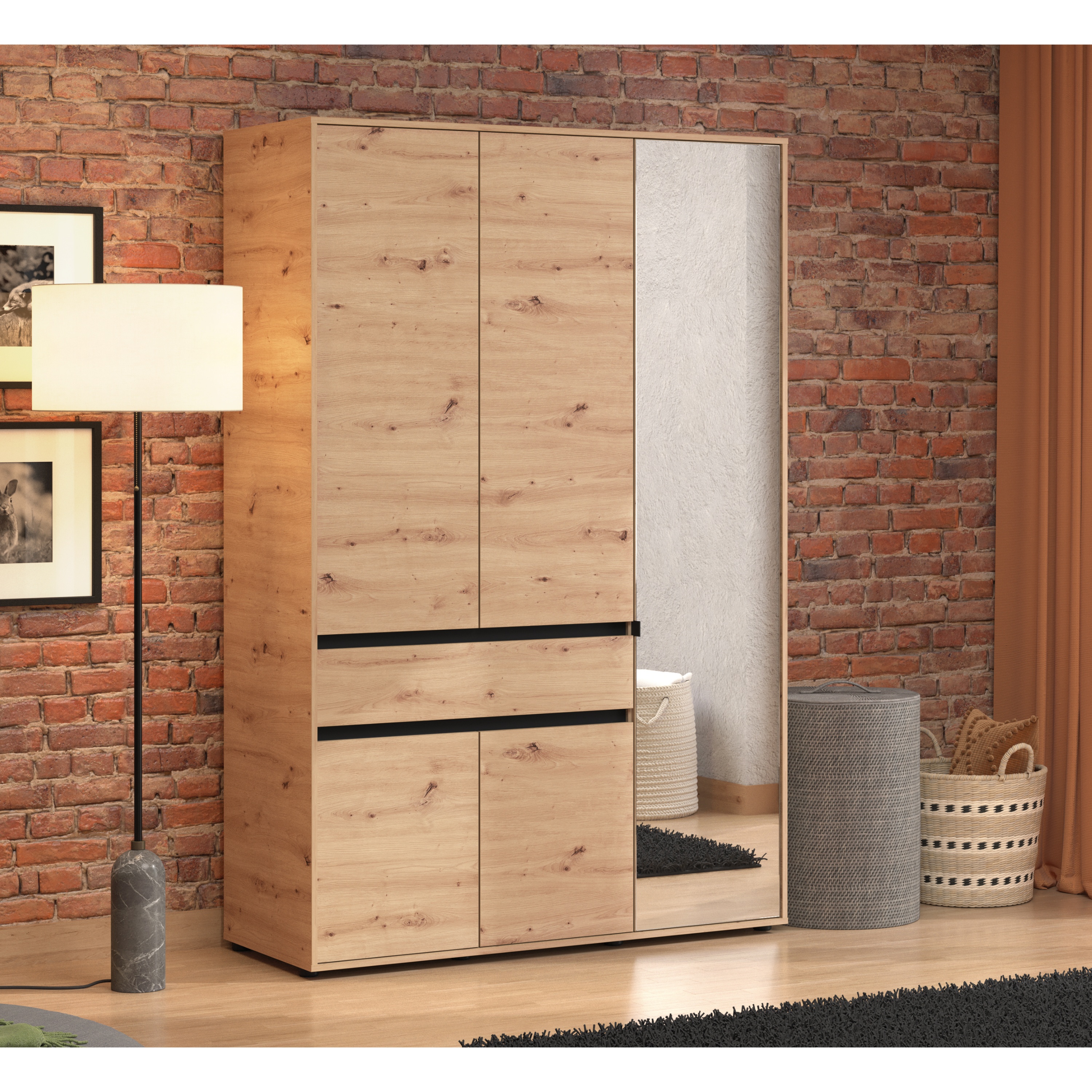 Skriňa je vybavená celkom 5 otočnými dverami, ktoré umožňujú maximálne využitie úložného priestoru. Samostatné pravé dvere sú vybavené zrkadlom, ktoré presvetlí a opticky zväčší miestnosť. Uzatvárateľné časti sú vybavené celkom 4 vloženými policami a šatníkovou tyčou na prehľadné uloženie nielen vášho oblečenia, ale aj doplnkov alebo obuvi. Uprostred sa nachádza ešte priestranná zásuvka na oddelenie drobností.