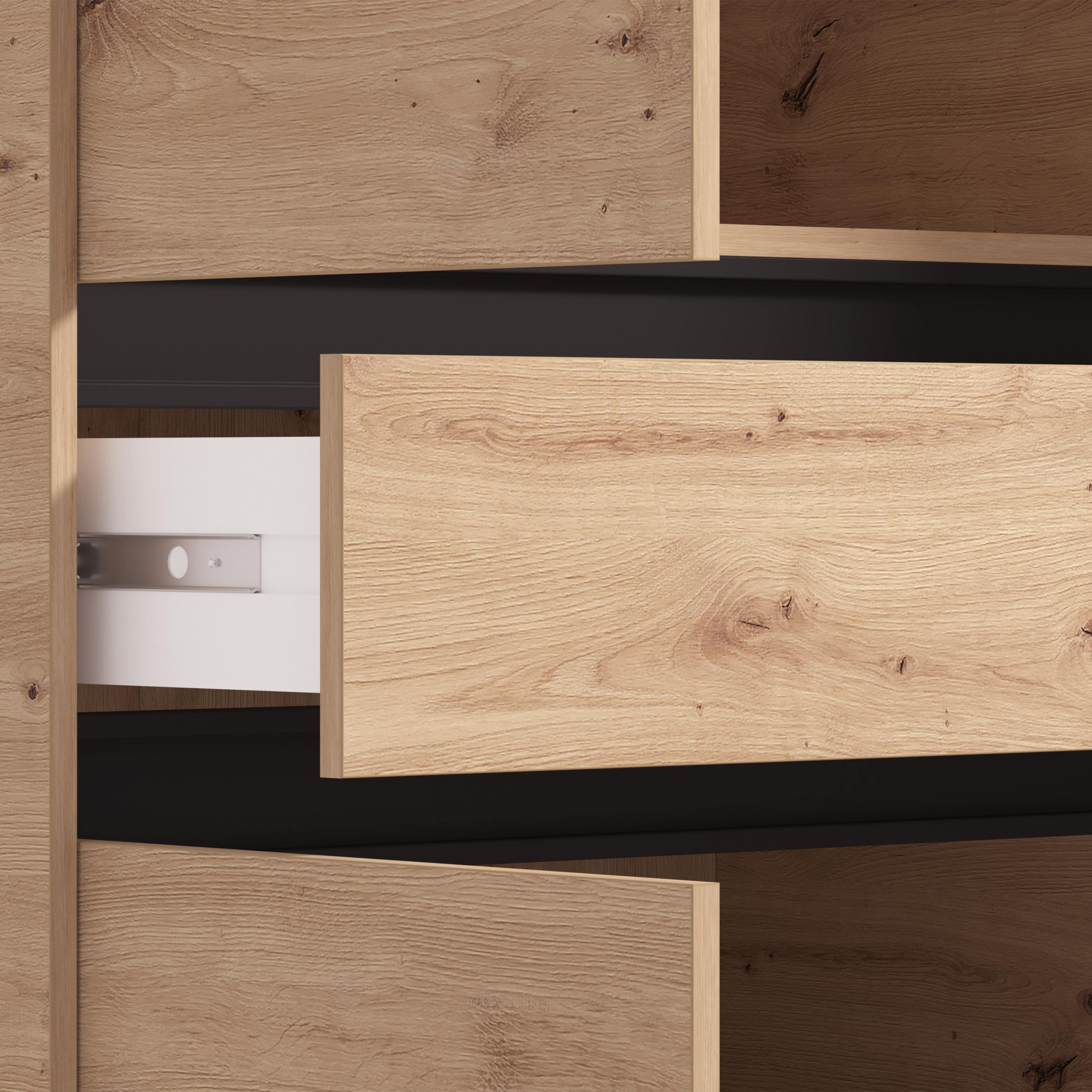 Jednotlivé prvky disponujú bezrúčkovým otváraním čo zvýrazňuje čistý vzhľad celej konštrukcie. Skriňa je vyrobená z laminovanej drevotriesky s povrchom nenáročným na údržbu.