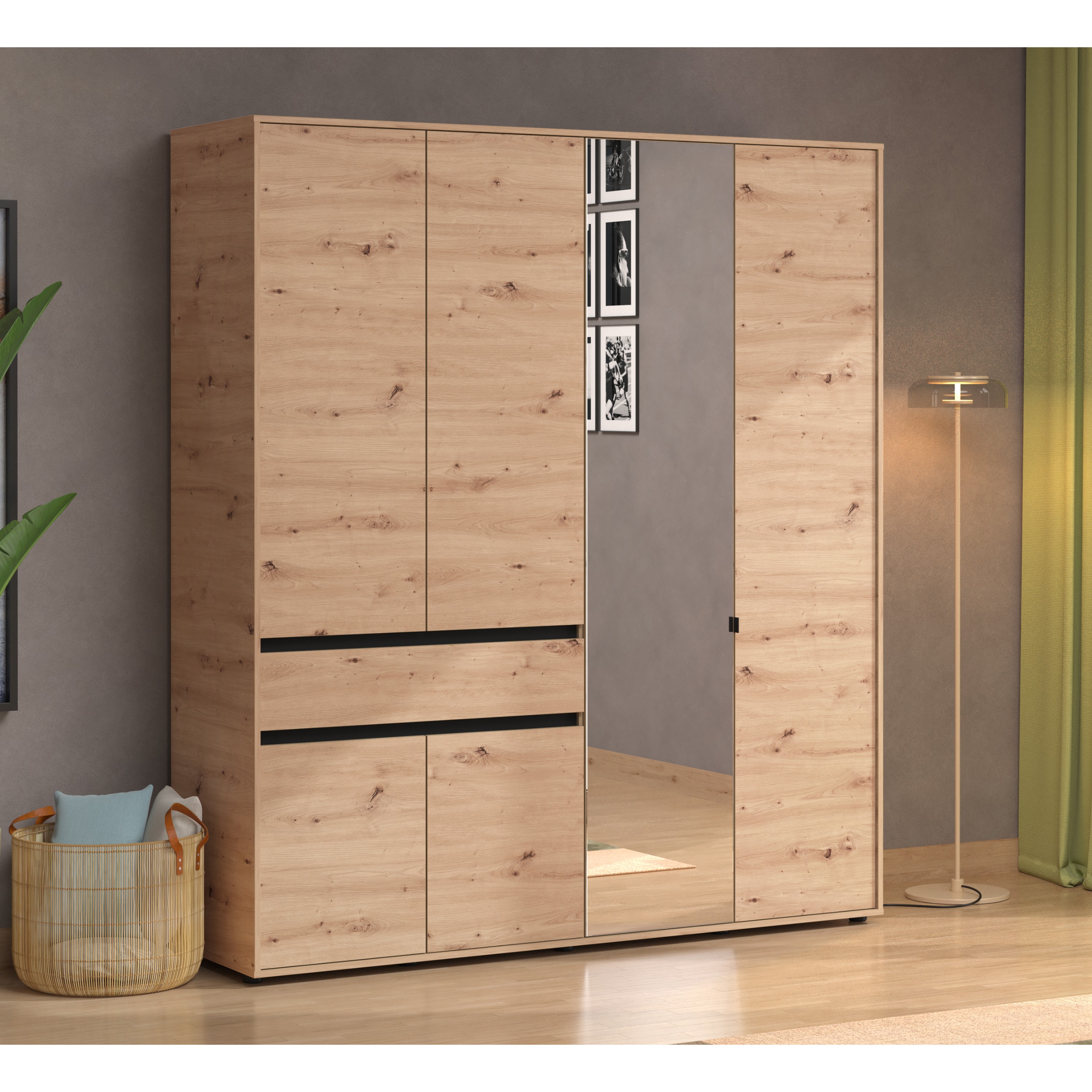 Skriňa je vybavená celkom 6 otočnými dverami, ktoré umožňujú maximálne využitie úložného priestoru. Ľavá strana je vybavená celkom 3 priestrannými vložnými policami a tiež priestrannou zásuvkou na oddelenie drobností. Prepojený priestor v pravej polovici skrine obsahuje šatníková tyč a ďalšiu vloženú policu. Jedny z dverí sú vybavené zrkadlom, ktoré presvetlí a opticky zväčší miestnosť.