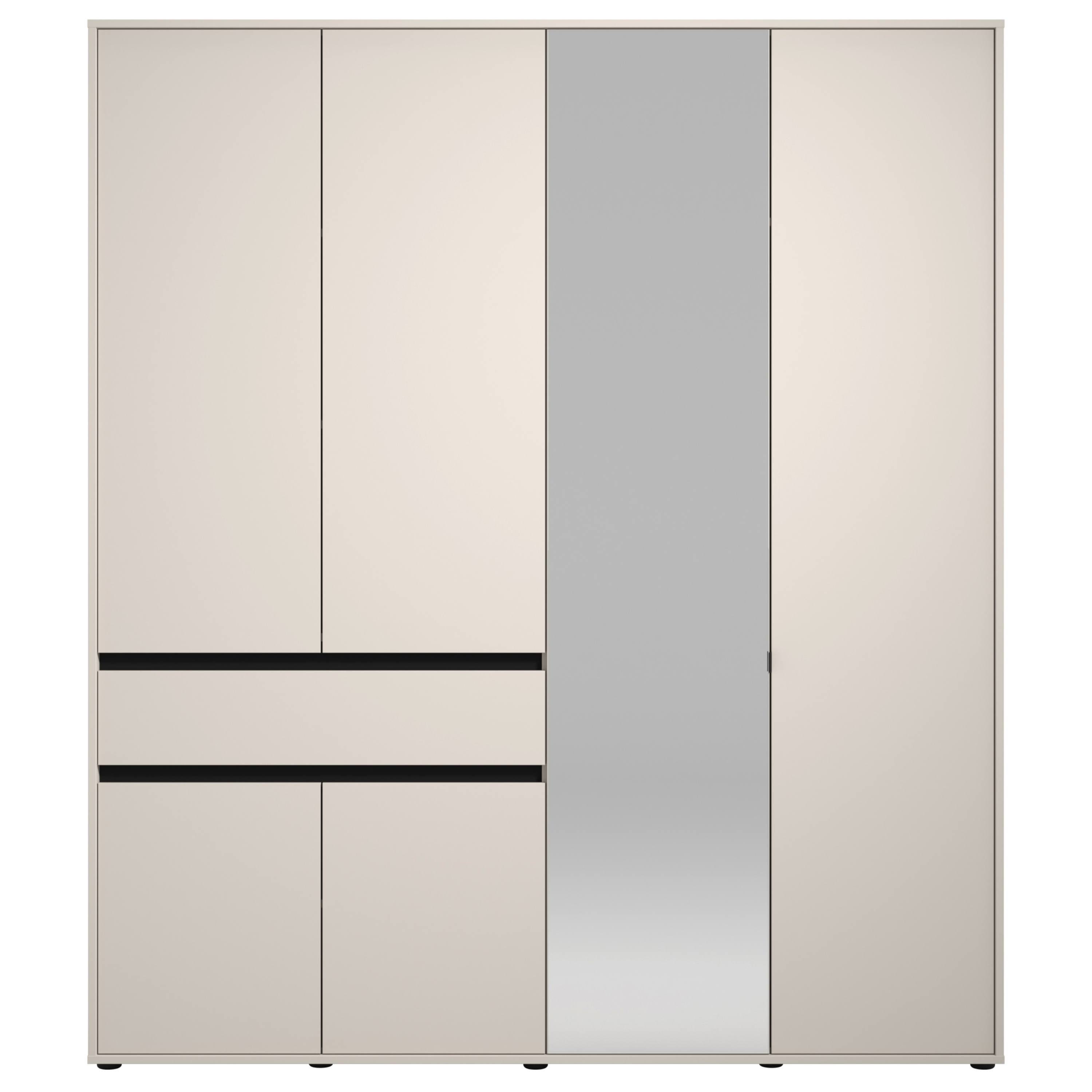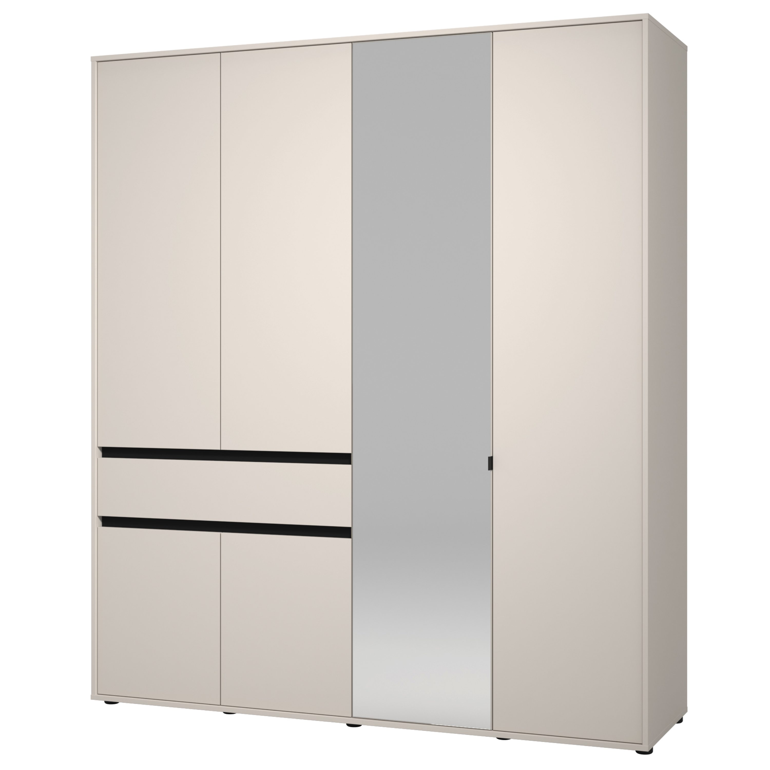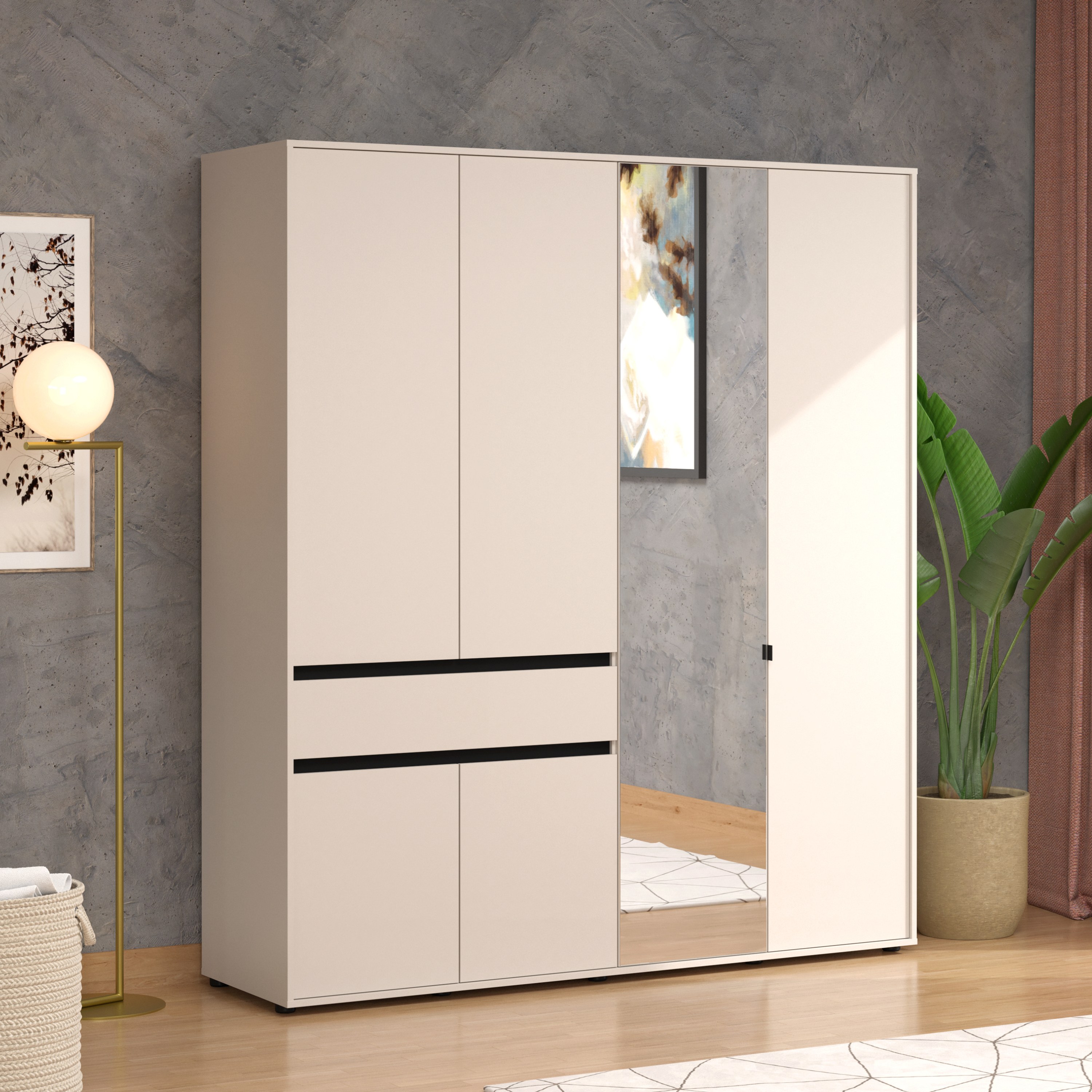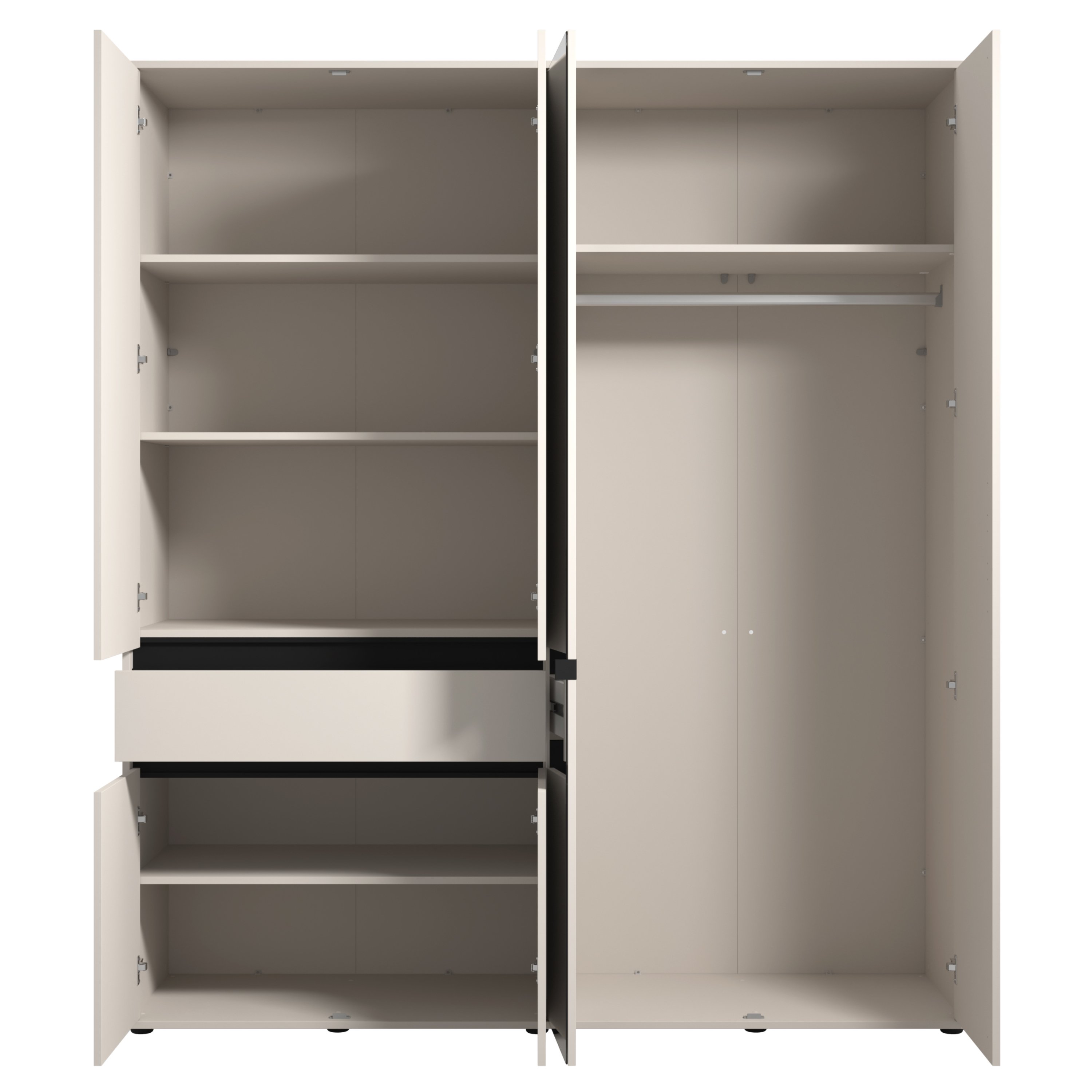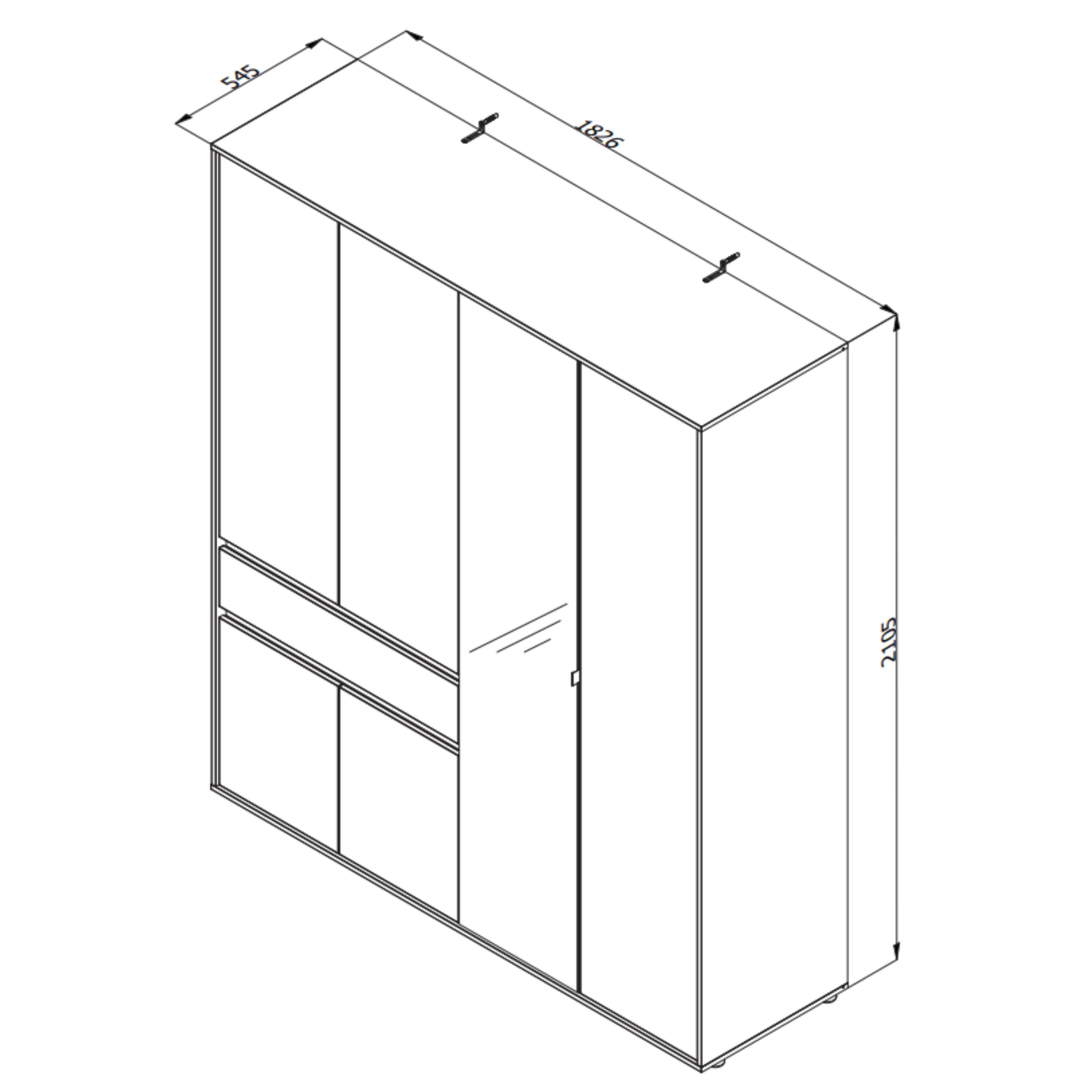 Skriňa je vybavená celkom 6 otočnými dverami, ktoré umožňujú maximálne využitie úložného priestoru. Ľavá strana je vybavená celkom 3 priestrannými vložnými policami a tiež priestrannou zásuvkou na oddelenie drobností. Prepojený priestor v pravej polovici skrine obsahuje šatníková tyč a ďalšiu vloženú policu. Jedny z dverí sú vybavené zrkadlom, ktoré presvetlí a opticky zväčší miestnosť.
