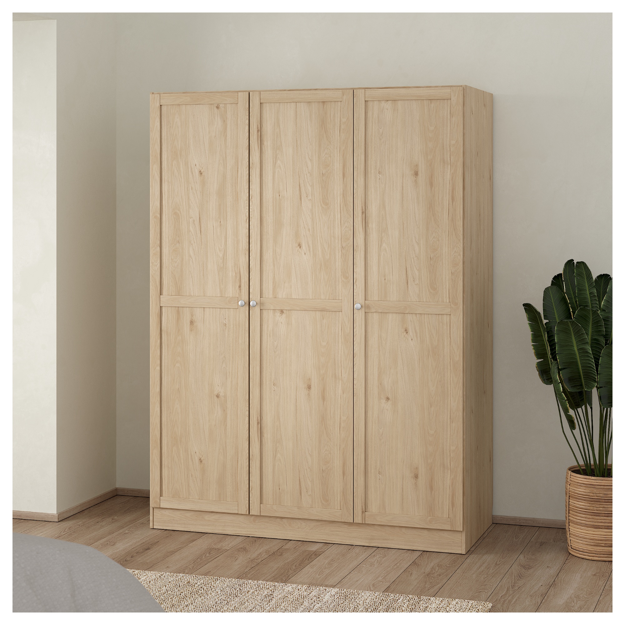 Skriňa je uzatvárateľná 3 otočnými dverami, ktoré umožňujú maximálne využitie úložného priestoru. Za párom dverí v ľavej časti skrine sa nachádza široká šatníková tyč a nad ňou vložená polica. Vnútorný priestor za samostatnými dverami obsahuje 4 vložené police na prehľadné skladovanie poskladaného oblečenia alebo doplnkov. Na ľahkú manipuláciu sú dvere doplnené o decentné kovové rúčky. Skriňa je vyrobená z fóliovanej drevotriesky s povrchom nenáročným na údržbu.