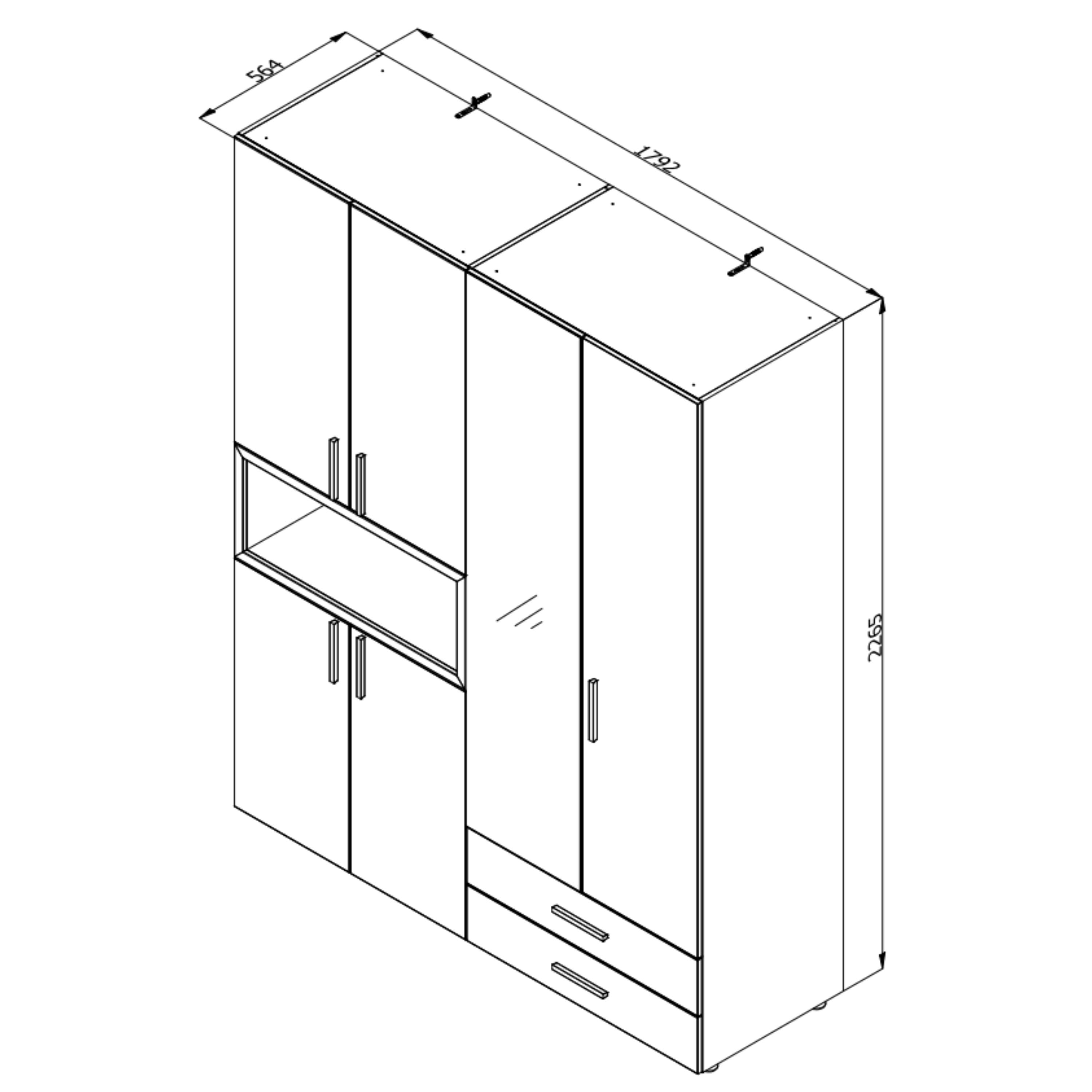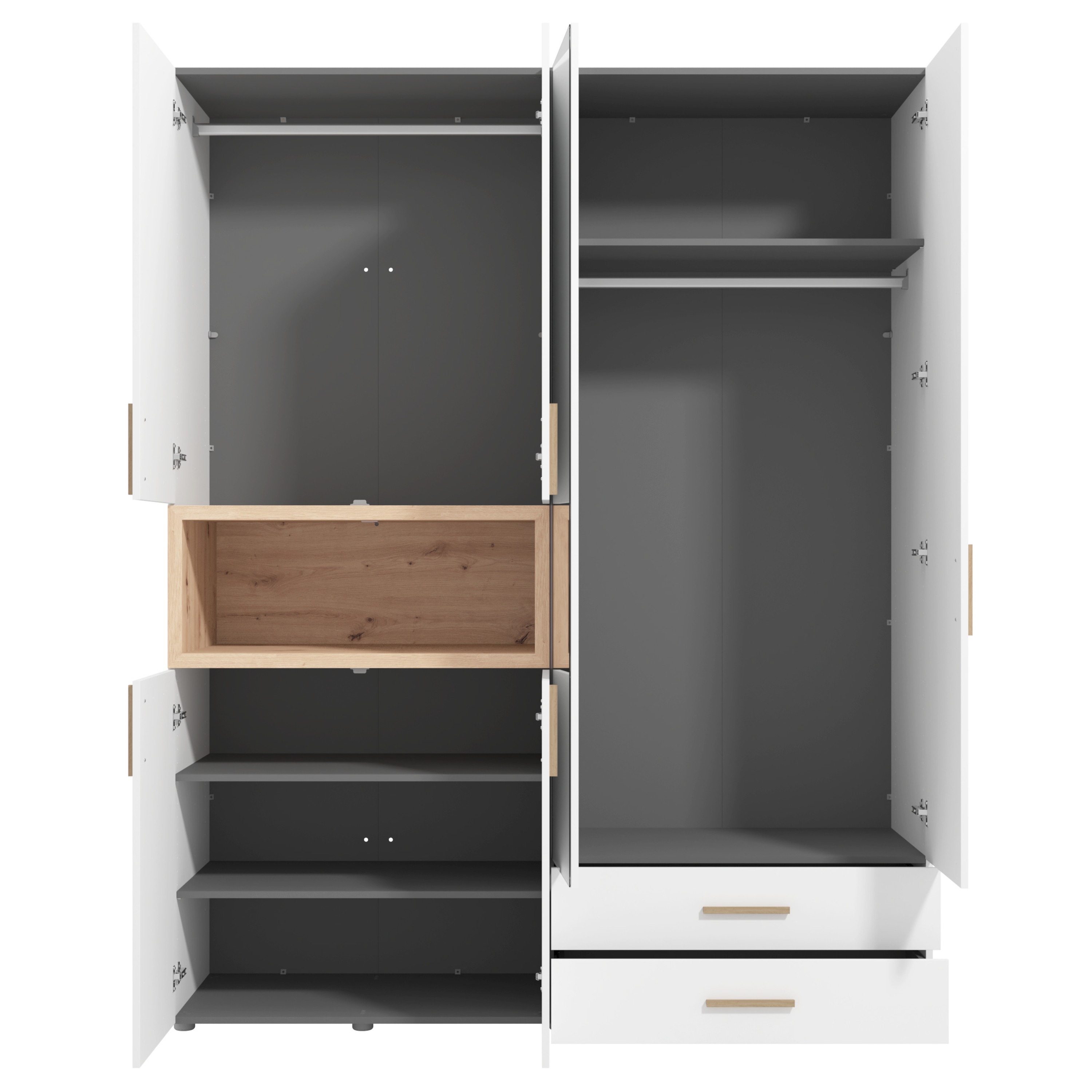 Skriňa je vybavená celkom 6 otočnými dverami, ktoré umožňujú maximálne využitie úložného priestoru. Uzatvárateľné časti obsahujú celkom 3 vložené police a 2 šatníkové tyče na prehľadné uloženie nielen vášho oblečenia, ale aj doplnkov alebo obuvi. Uprostred sa ešte nachádza otvorený odkladací priestor na odloženie drobností dennej potreby alebo vystavenie dekorácií. Na oddelenie spodnej bielizne alebo menších doplnkov môžete využiť 2 zásuvky v spodnej časti.
