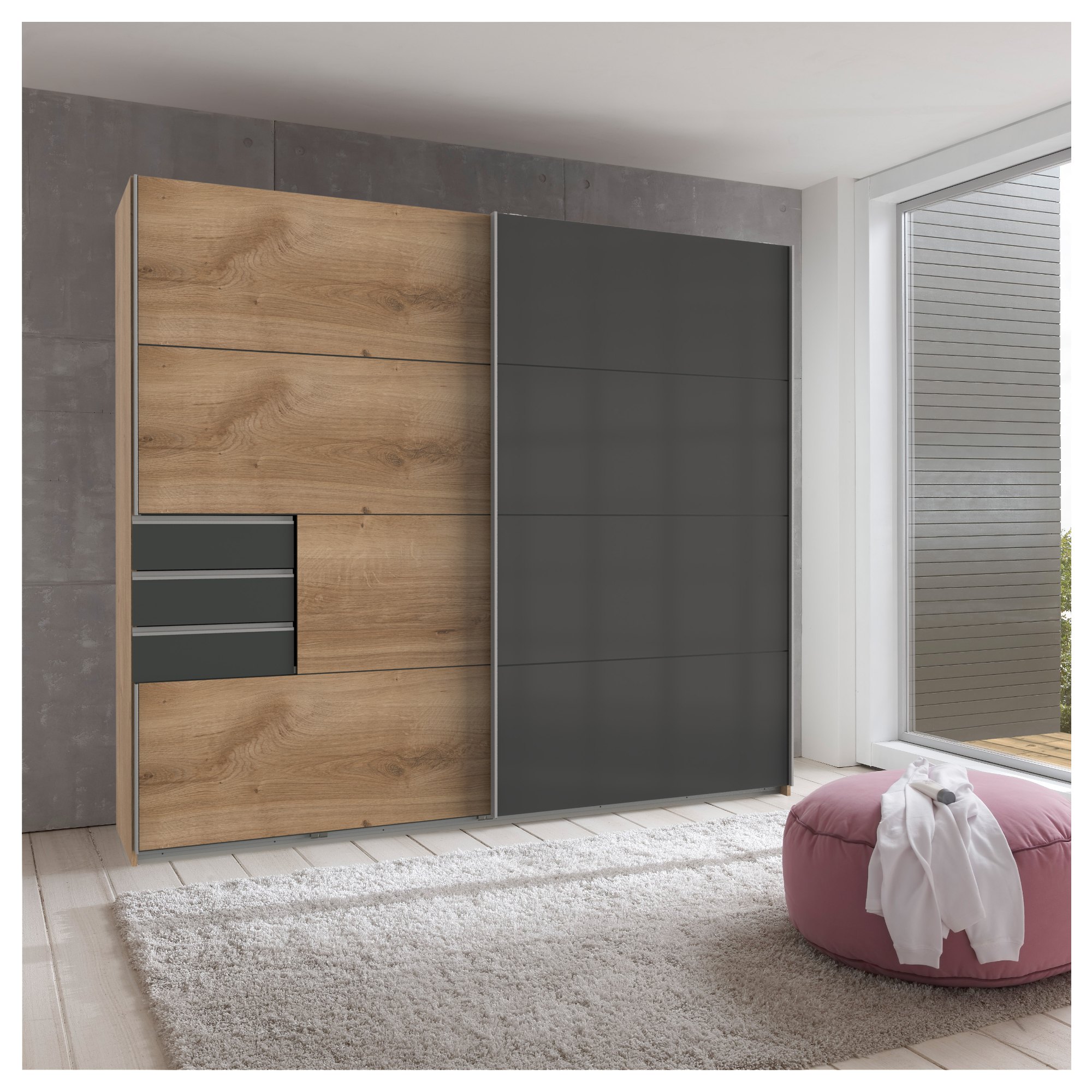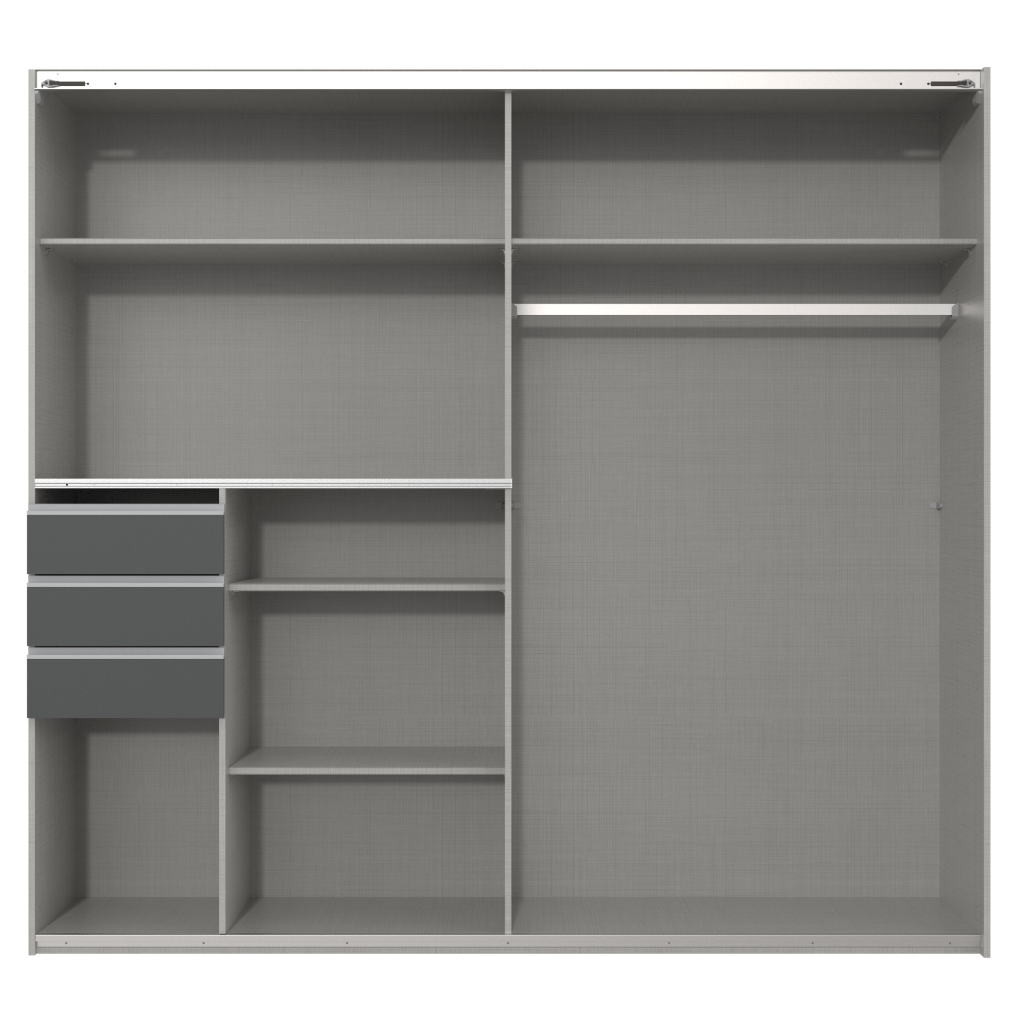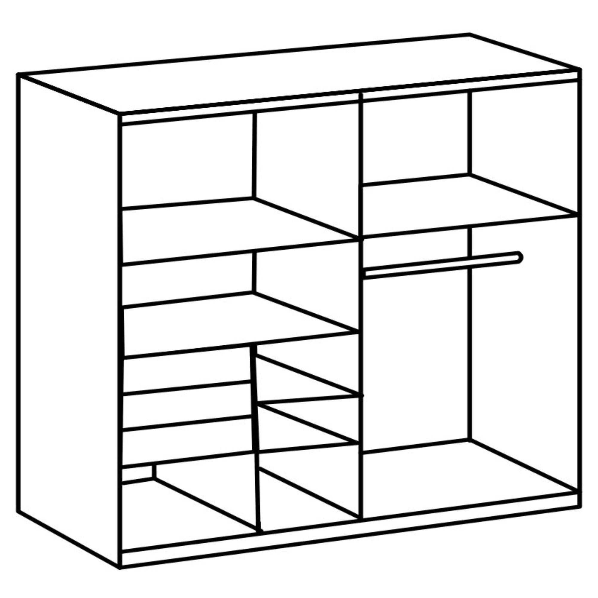 Pravá strana obsahuje priestrannú šatníková tyč na pohodlné zavesenie búnd, kabátov alebo odevov z krčivých materiálov. Nad tyčou nájdete 1 vloženú policu na lôžkoviny či mimosezónne oblečenie. Využiť môžete aj priestrannú plochu na dne skrine, ktorá je ideálna na úložné boxy. Ľavá, členená strana obsahuje celkom 4 vložené police, ktoré bez problémov pojmú väčšie množstvo poskladaného oblečenia a doplnkov. 3 praktické zásuvky sú ideálne na oddelenie drobného šatstva od ostatných uložených predmetov. Skriňa uzatvára pár posuvných dverí, ktoré šetria cenný priestor zvonku aj vo vnútri skrine a umožňujú ju tak využiť na maximum.