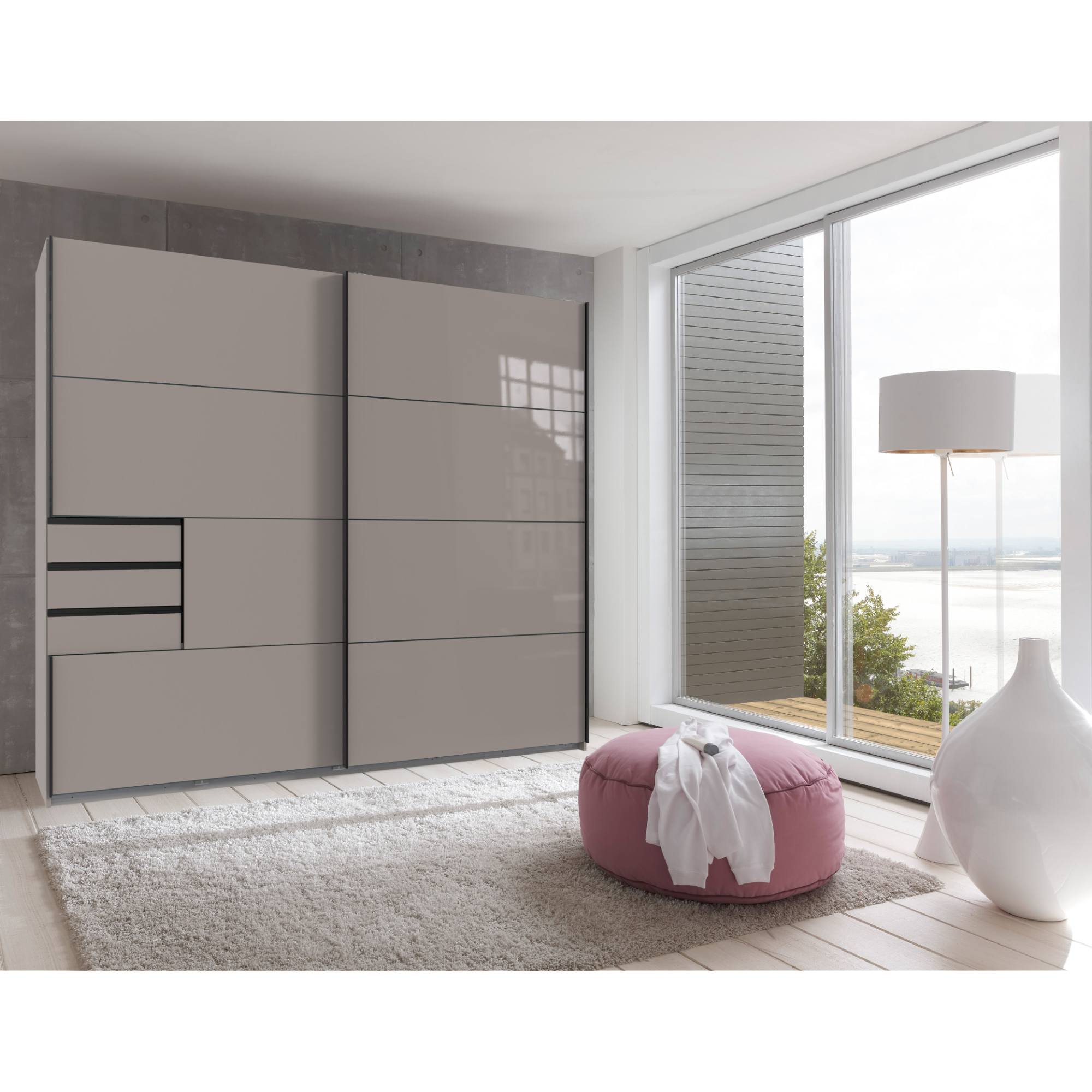 Pravá strana obsahuje priestrannú šatníková tyč na pohodlné zavesenie búnd, kabátov alebo odevov z krčivých materiálov. Nad tyčou nájdete 1 vloženú policu na lôžkoviny či mimosezónne oblečenie. Využiť môžete aj priestrannú plochu na dne skrine, ktorá je ideálna na úložné boxy. Ľavá, členená strana obsahuje celkom 4 vložené police, ktoré bez problémov pojmú väčšie množstvo poskladaného oblečenia a doplnkov. 3 praktické zásuvky sú ideálne na oddelenie drobného šatstva od ostatných uložených predmetov. Skriňa uzatvára pár posuvných dverí, ktoré šetria cenný priestor zvonku aj vo vnútri skrine a umožňujú ju tak využiť na maximum.