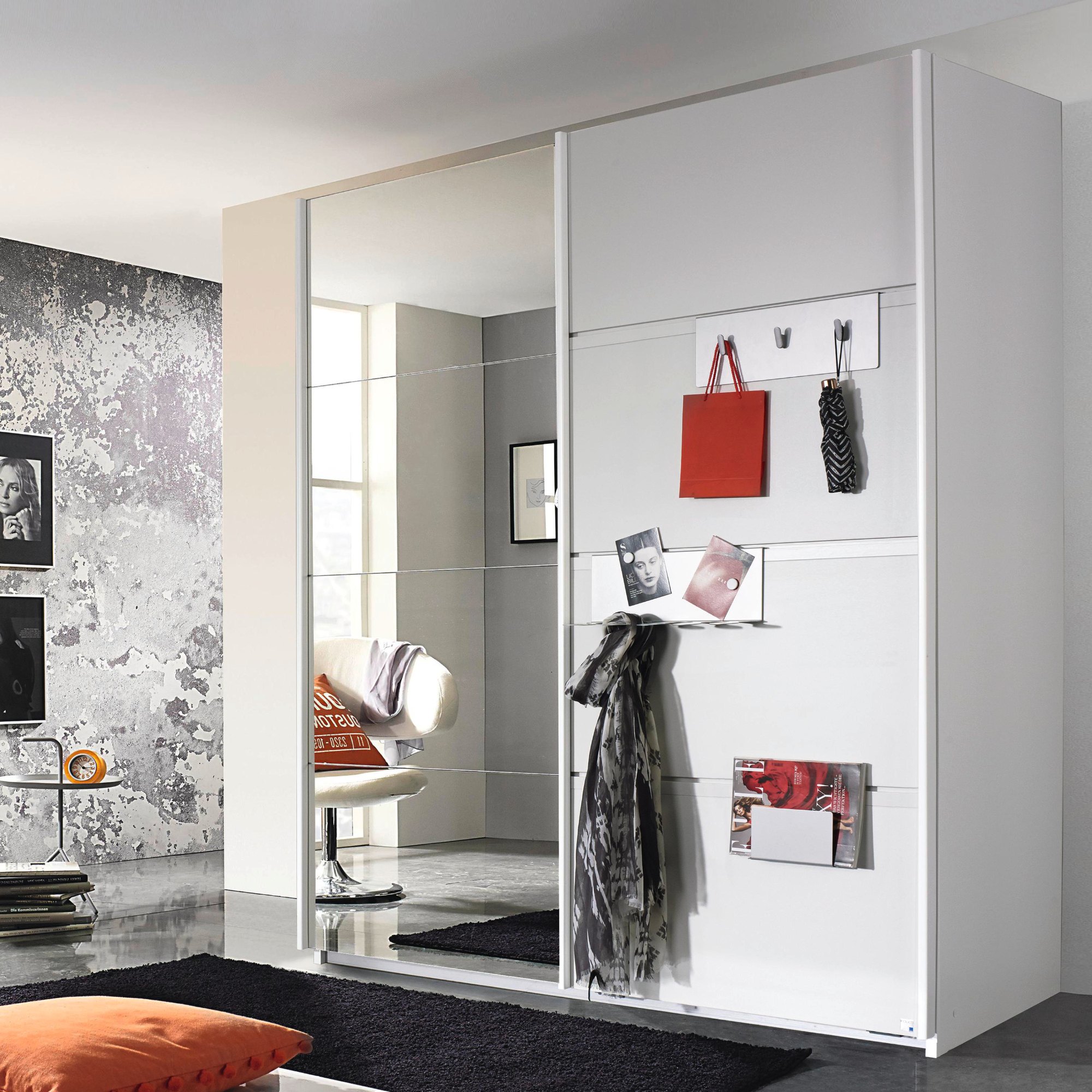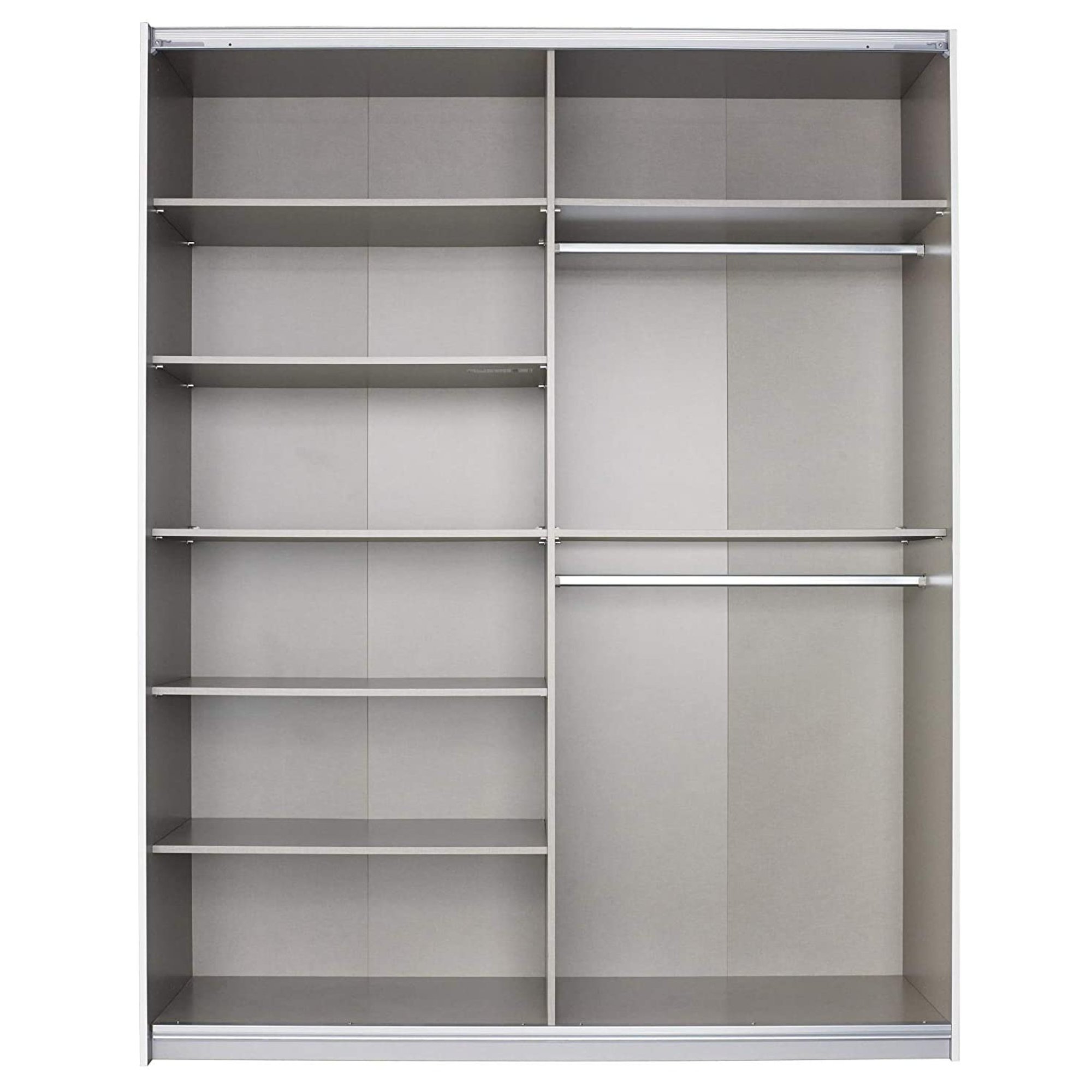 Moderná šatníková skriňa SHEA vďaka zrkadlovým dverám opticky zväčší vašu spálňu. Vnútorné usporiadanie skrine je rozdelené na dva bloky, kedy sa v jednom bloku nachádza celkom 6 vložených políc a 1 šatníková tyč. V druhom bloku je tiež 1 šatníková tyč ale iba jedna polica. Súčasťou skrine sú háčiky z vonkajšej strany s multifunkčným využitím, s ktorými má skriňa hĺbku 72 cm. Určite ich využijete napríklad na odkladanie doplnkov. Konštrukcia posuvných dverí je rozdelená do 4 panelov. Materiálom je odolné a na údržbu nenáročné lamino.