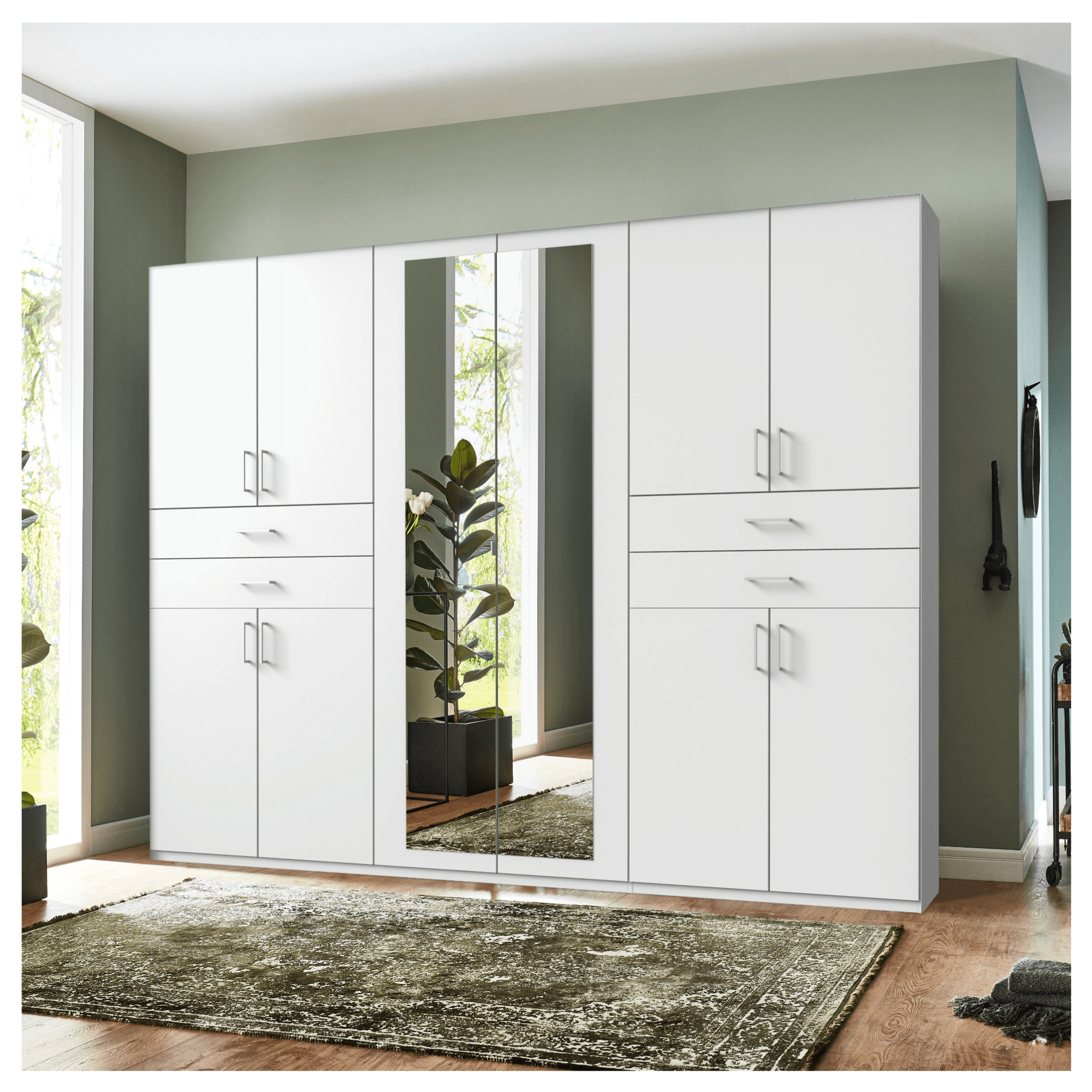 Skriňa je zložená z 3 blokov z ktorých 2 postranné sú identické. Na každej strane sa nachádzajú 2 páry otočných dverí nad sebou, kedy za každým párom nájdete 1 vloženú policu prakticky rozdeľujúcu vnútorný priestor. Medzi 2 pármi dverí sú umiestnené 2 zásuvky na drobné šatstvo a doplnky. Medzi týmito 2 identickými blokmi sa nachádza prostredná časť obsahujúca 2 šatníkové tyče, ktoré sú ideálne na zavesenie krčivých kusov oblečenia. Tie sa ukrývajú za posledným párom dverí, ktorý je tvorený zrkadlovými plochami. Zrkadlá skvele rozjasnia a opticky zväčšia miestnosť a zároveň vám umožňujú si kedykoľvek skontrolovať svoj vzhľad. Všetky predné plochy dopĺňajú výrazné rúčky vo farbe kovu. Šatníková skriňa je vyrobená z materiálu nenáročného na údržbu.