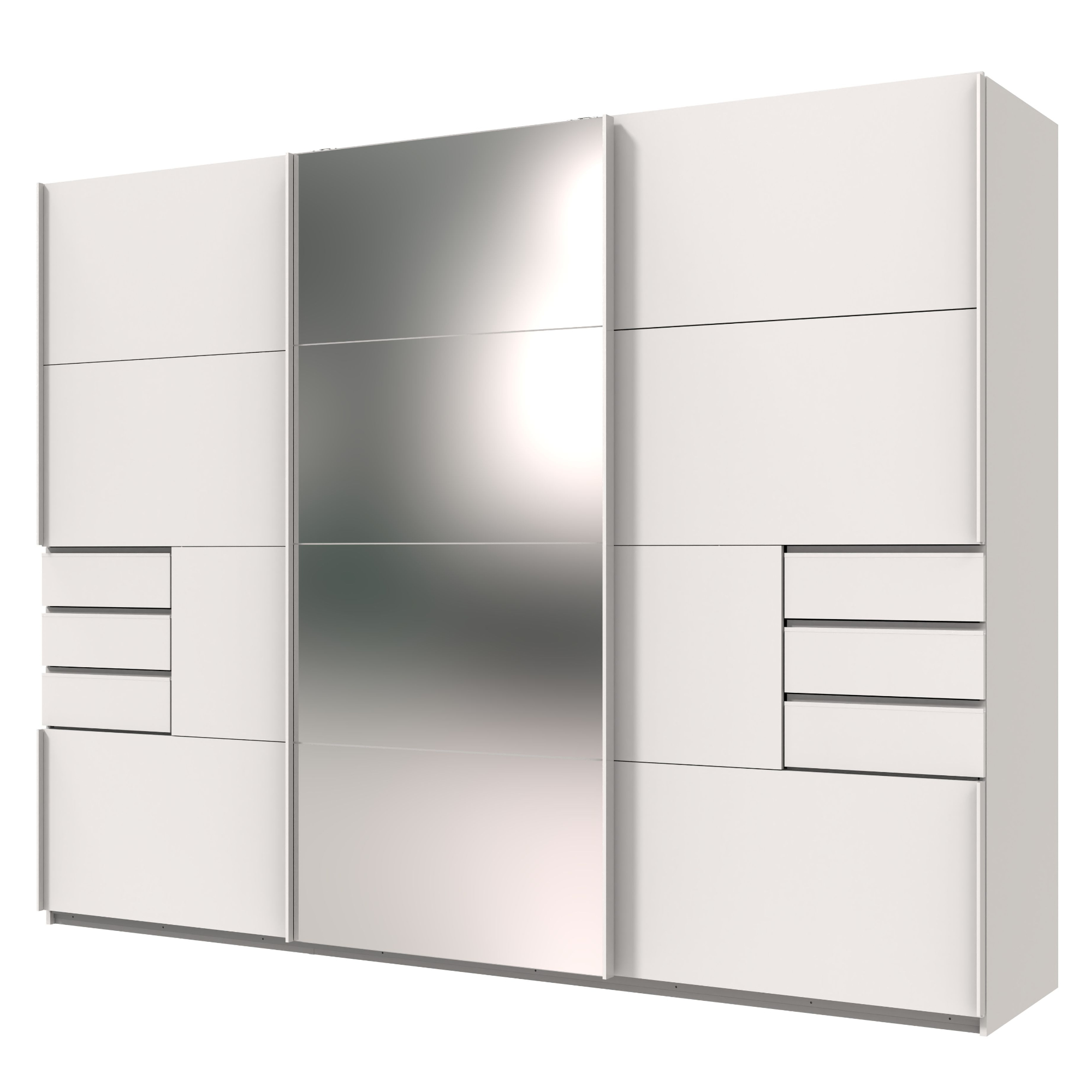Vnútorné vybavenie skrine ponúka veľmi praktické riešenie na uskladnenie šatstva a doplnkov skladajúce sa z 3 blokov z ktorých iba prostredná časť sa odlišuje. Ľavá a pravá strana obsahujú celkom 8 vložených políc, ktoré bez problémov pojmú veľké množstvo poskladaného oblečenia, doplnkov a lôžkovín. 3 menšie zásuvky na každej strane sú ideálne na uskladnenie drobností. Priestor za prostrednými dverami je vyplnený 2 šatníkovými tyčami umiestnenými nad sebou, ktoré umožňujú pohodlné zavesenie väčších odevov alebo tých, u ktorých chcete zabrániť pokrčeniu. Skriňu uzatvárajú 3 posuvné dvere, ktoré šetria cenný priestor zvonku aj vo vnútri skrine. Práve prostredné dvere sú vyplnené zrkadlovou plochou a vy si tak môžete kedykoľvek skontrolovať svoj vzhľad. Zrkadlo tiež zaistí optické zväčšenie a presvetlenie interiéru.