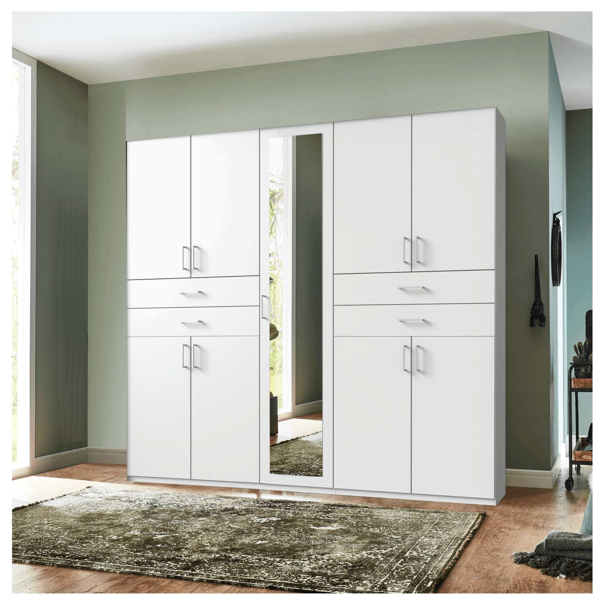 Skriňu uzatvára 9 otočných dverí, ktoré umožňujú maximálne využitie vnútorného priestoru. 1 dvere sú vyplnené zrkadlom, v ktorom si môžete kedykoľvek skontrolovať svoj vzhľad. Za každým párom dverí sa nachádza 1 priestranná vložená polica, ktorá prakticky predeľuje priestor. Za zrkadlovými dverami sa ukrývajú 2 šatníkové tyče. Umiestnenie v 2 radoch umožňuje zavesenie viacerých kusov oblečenia. Skriňa ďalej obsahuje 4 praktické zásuvky na drobnejšie šatstvo či doplnky. Všetky predné plochy sú osadené výraznými rúčkami vo farbe kovu, ktoré uľahčia každodennú manipuláciu.
