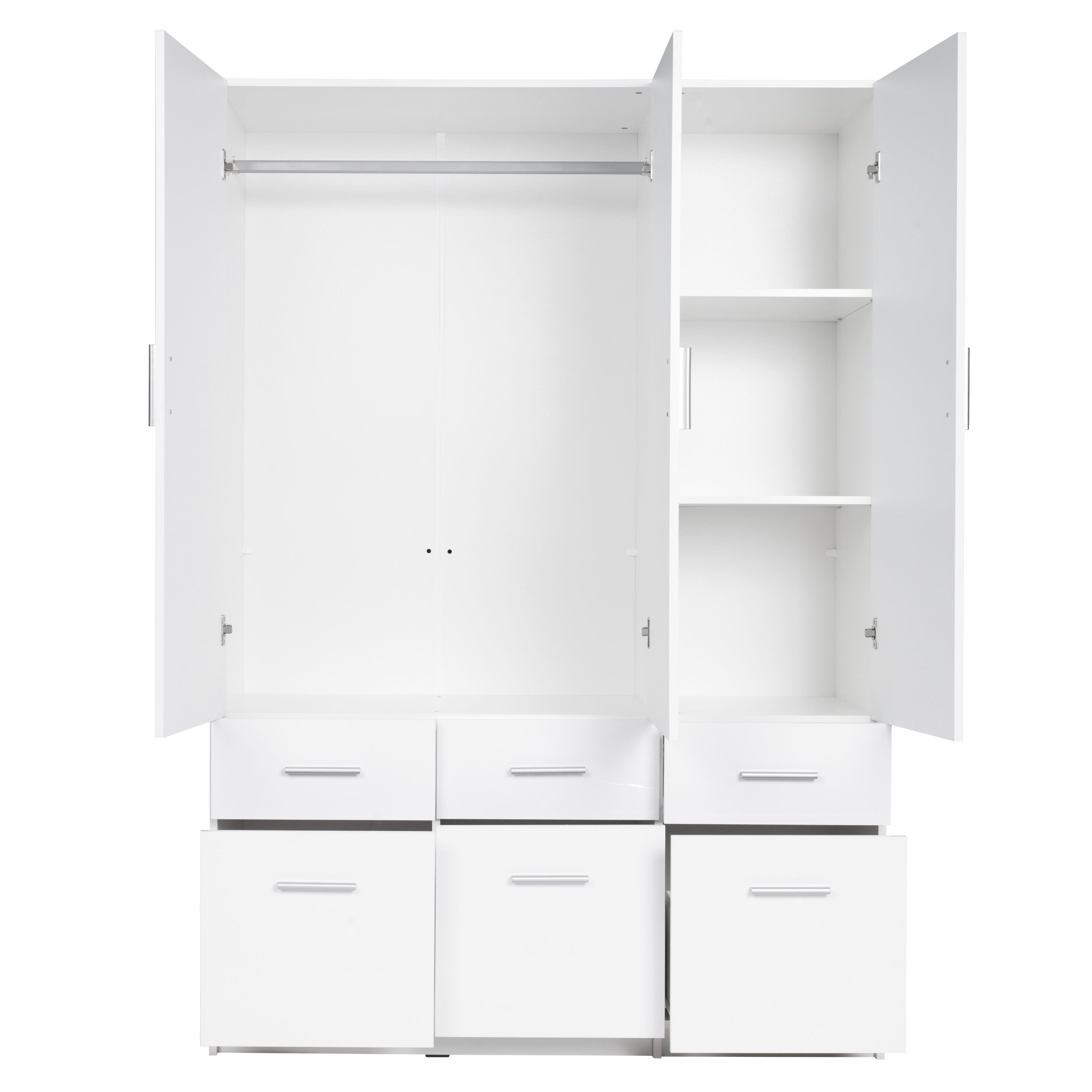 Skriňa je uzatvárateľná otočnými dverami, ktoré sú rovnako ako ďalšie predné plochy vybavené rúčkami vo farbe kovu na ľahkú každodennú manipuláciu. Vnútorný priestor je vybavený šatníkovou tyčou a 2 vloženými policami, ktoré ponúkajú dostatok miesta na uloženie oblečenia aj doplnkov. Na skladovanie môžete využiť tiež 6 priestranných zásuviek v spodnej časti skrine. Skriňa je vyrobená z laminovaného dreveného materiálu s povrchom nenáročným na údržbu.