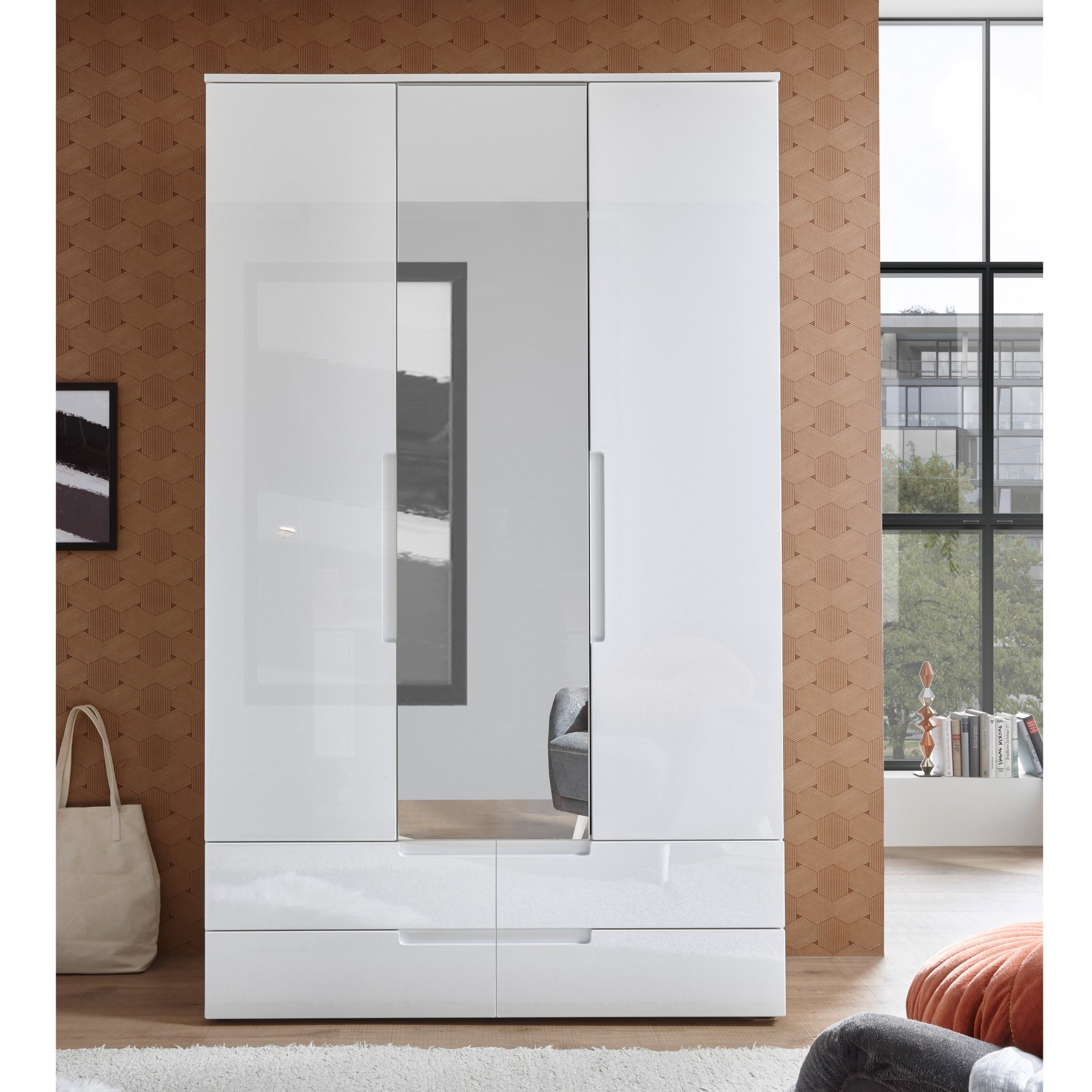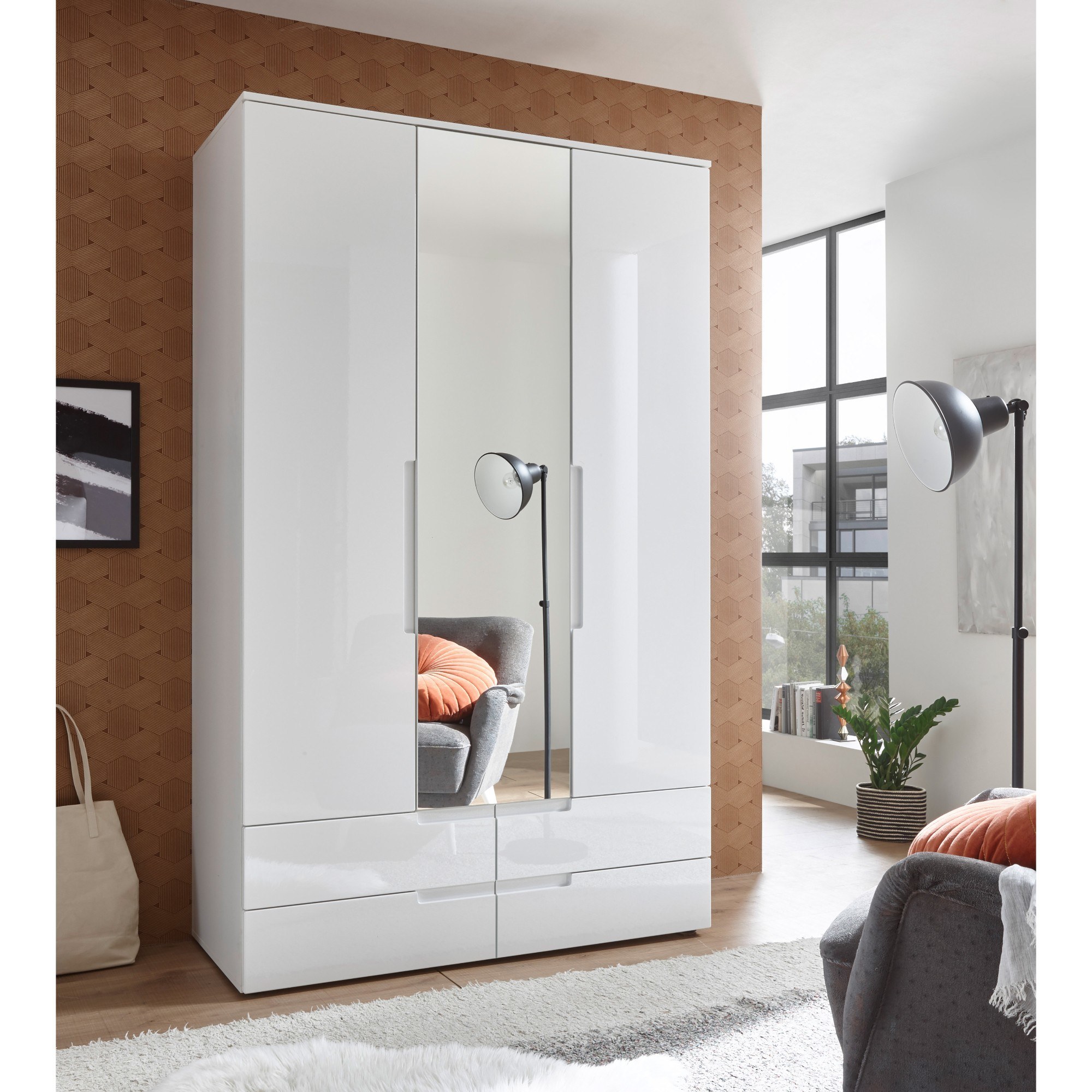 Moderná šatníková skriňa TEAGAN 1 je vyrobená v duchu moderného minimalistického štýlu s povrchovou úpravou predných plôch vo vysokom lesku. Vďaka svojim rozmerom sa hodí aj do menších spální. Zrkadlo z vonkajšej strany skrine dokáže navyše tento malý priestor svojim optickým klamom zväčšiť. Praktické vnútorné usporiadanie sa postará o prehľadné a organizované ukladanie vášho oblečenia a doplnkov. Celkom máte k dispozícii 4 police, jednu šatníkovú tyč a k tomu 4 priestranné zásuvky v dolnej časti. Bezrúčkové otváranie dotvára čistý dojem celej skrine. Jej otváranie však uľahčujú nenápadne vykrojené časti. Materiál je nenáročný na údržbu.