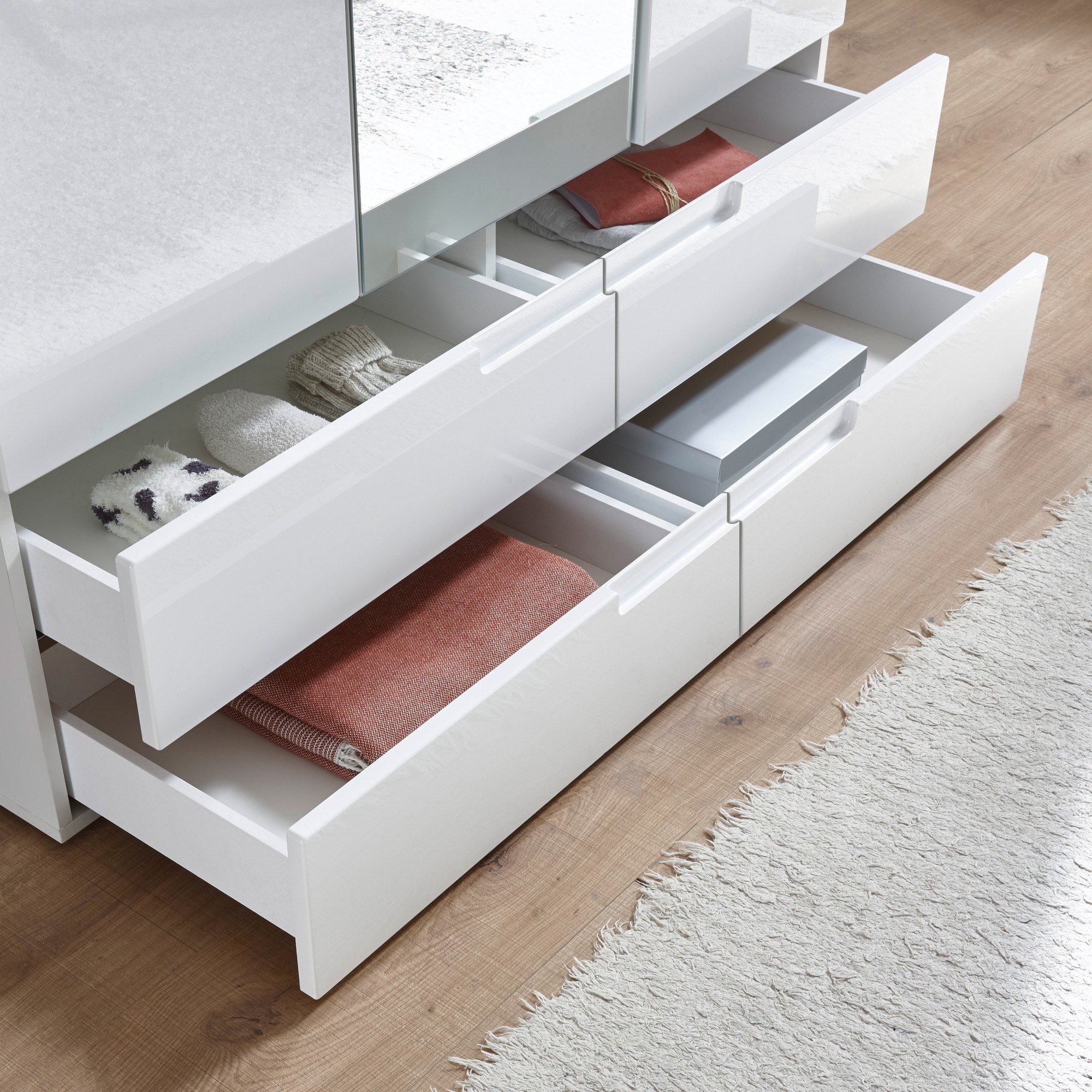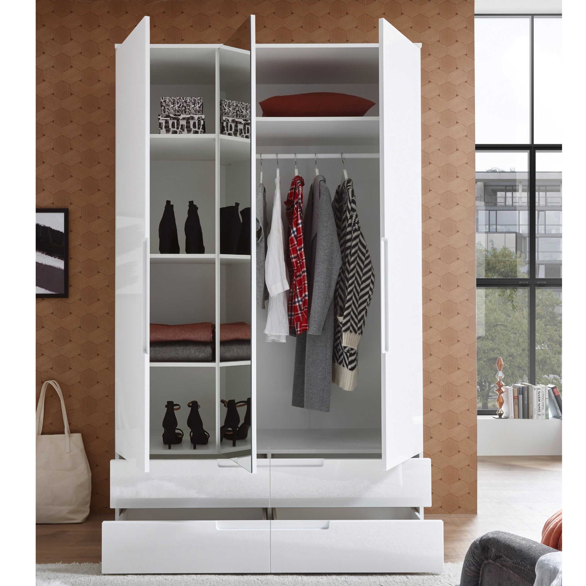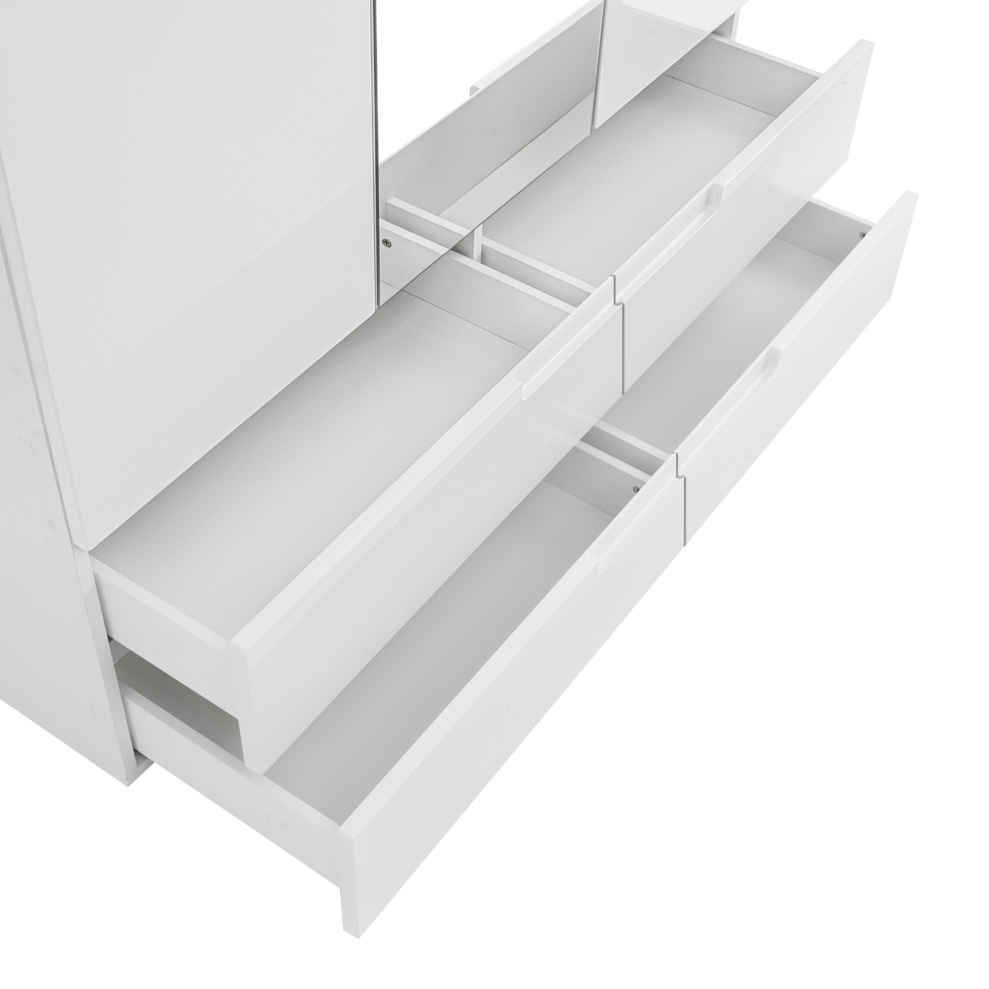 - 4 police, šatníková tyč, 4 zásuvky, zrkadlo