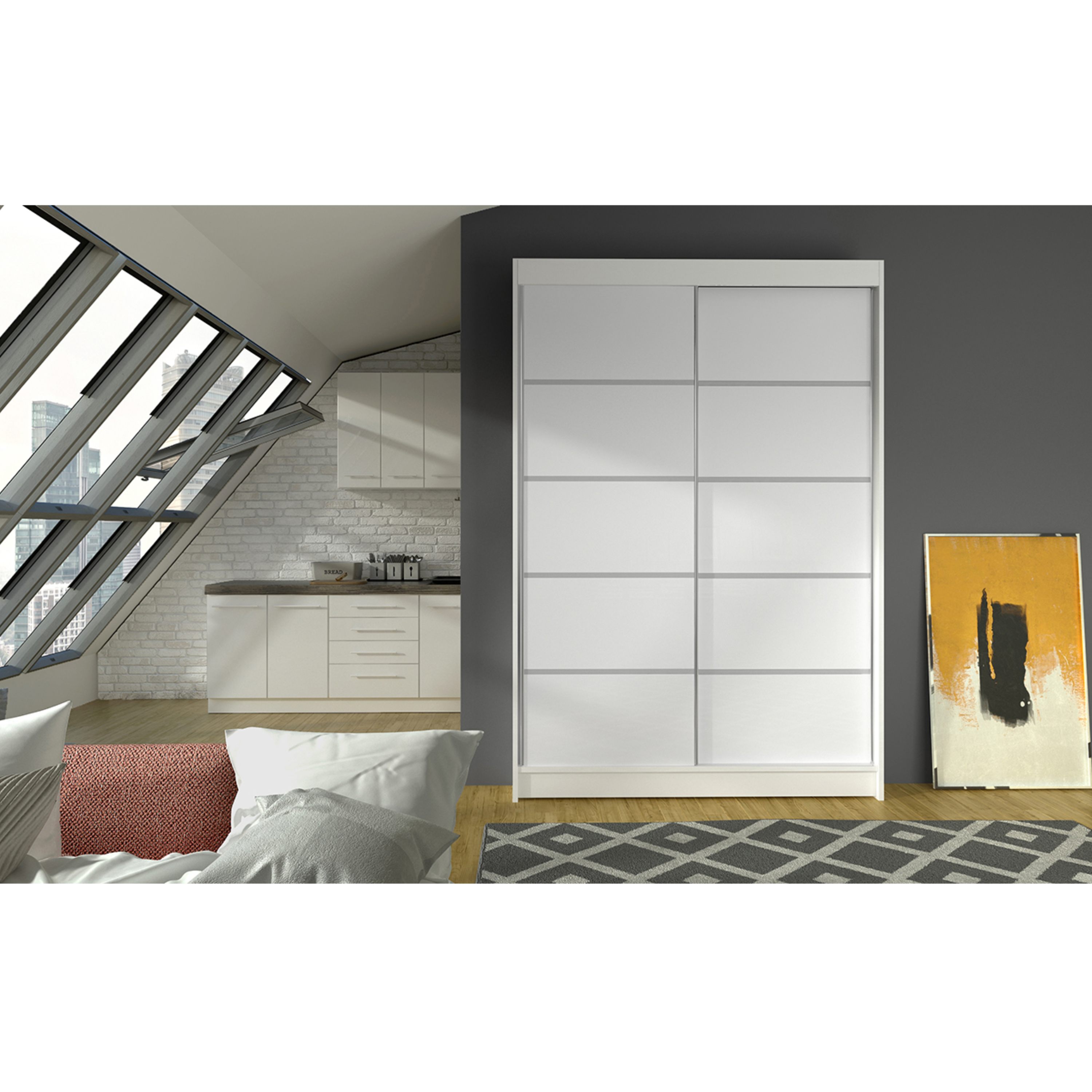 Vnútorné vybavenie pozostáva celkom z 5 políc a 1 šatníkovej tyče na uloženie rôznych typov odevov. Skriňu uzatvárajú posuvné dvere, ktoré šetria cenný priestor vo vnútri aj mimo skriňu. Korpus skrine je vyrobený z laminovaného dreveného materiálu, ktorý je doplnený o ABS hrany chrániace pred mechanickým poškodením.