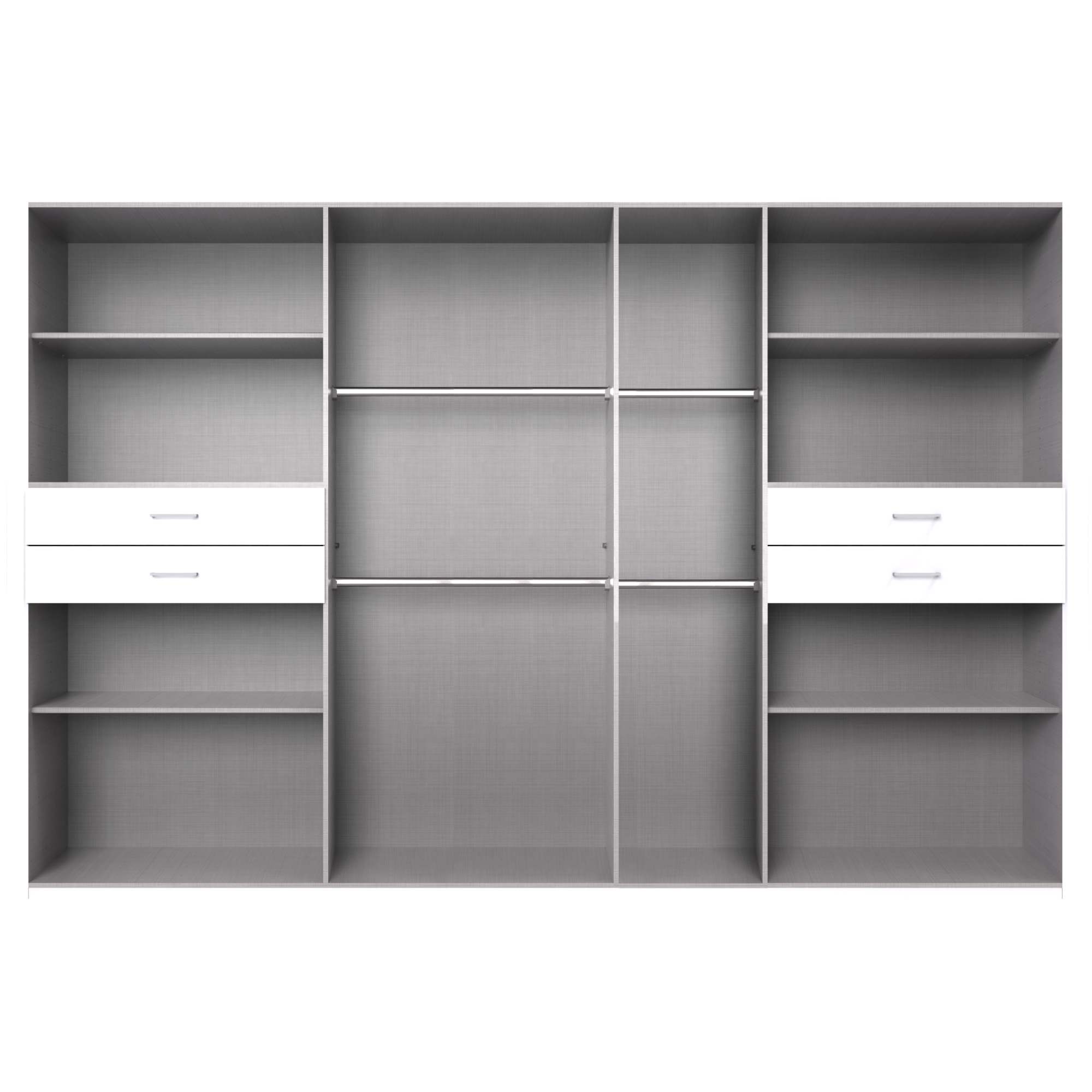 - 4 vložené police, 4 šatníkové tyče a 4 zásuvky