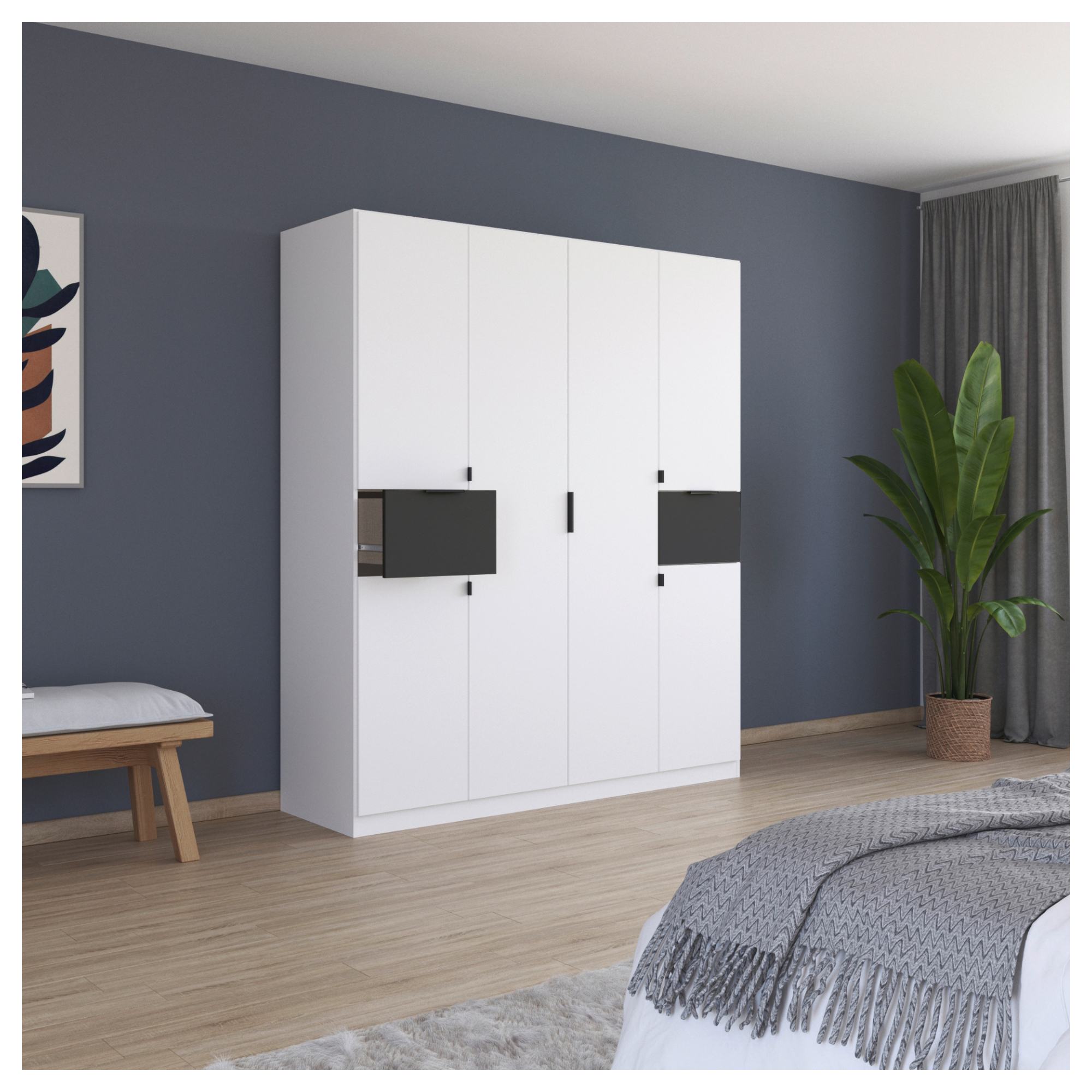 Skriňu uzatvára 6 otočných dverí, ktoré umožňujú maximálne využitie vnútorného priestoru. Skriňa je vybavená celkom 3 vloženými policami a 3 šatníkovými tyčamina prehľadné skladovanie vášho šatstva. Skriňa ponúka aj 2 priestranné zásuvky ktoré sú vhodné na uloženie spodnej bielizne, šperkov či iných doplnkov. Všetky predné plochy sú doplnené o decentné rúčky, ktoré uľahčia každodennú manipuláciu. Skriňa je vyrobená z laminovanej drevotriesky nenáročnej na údržbu.