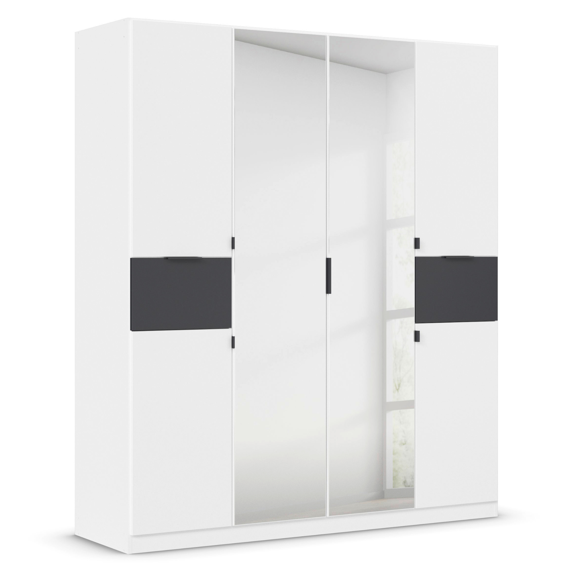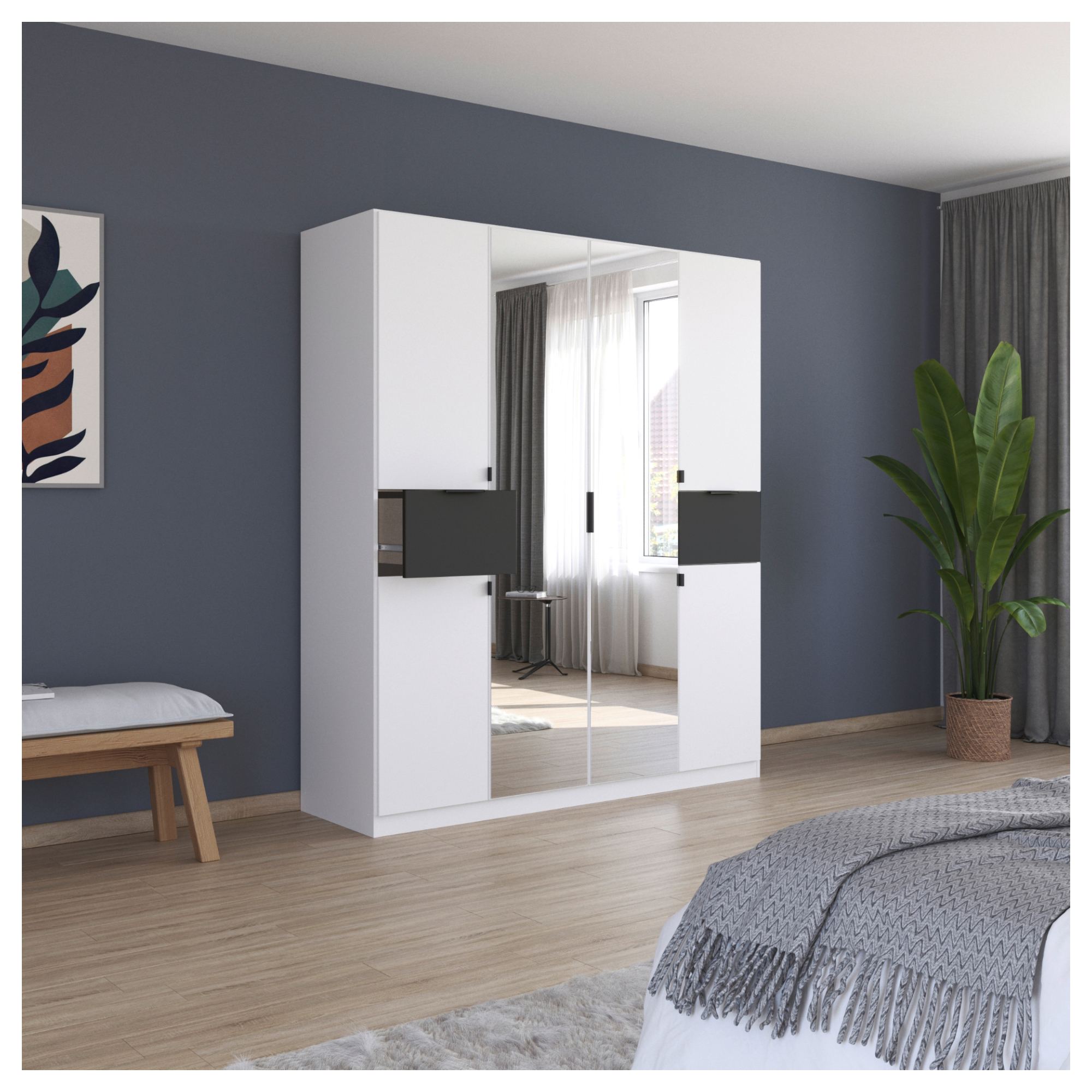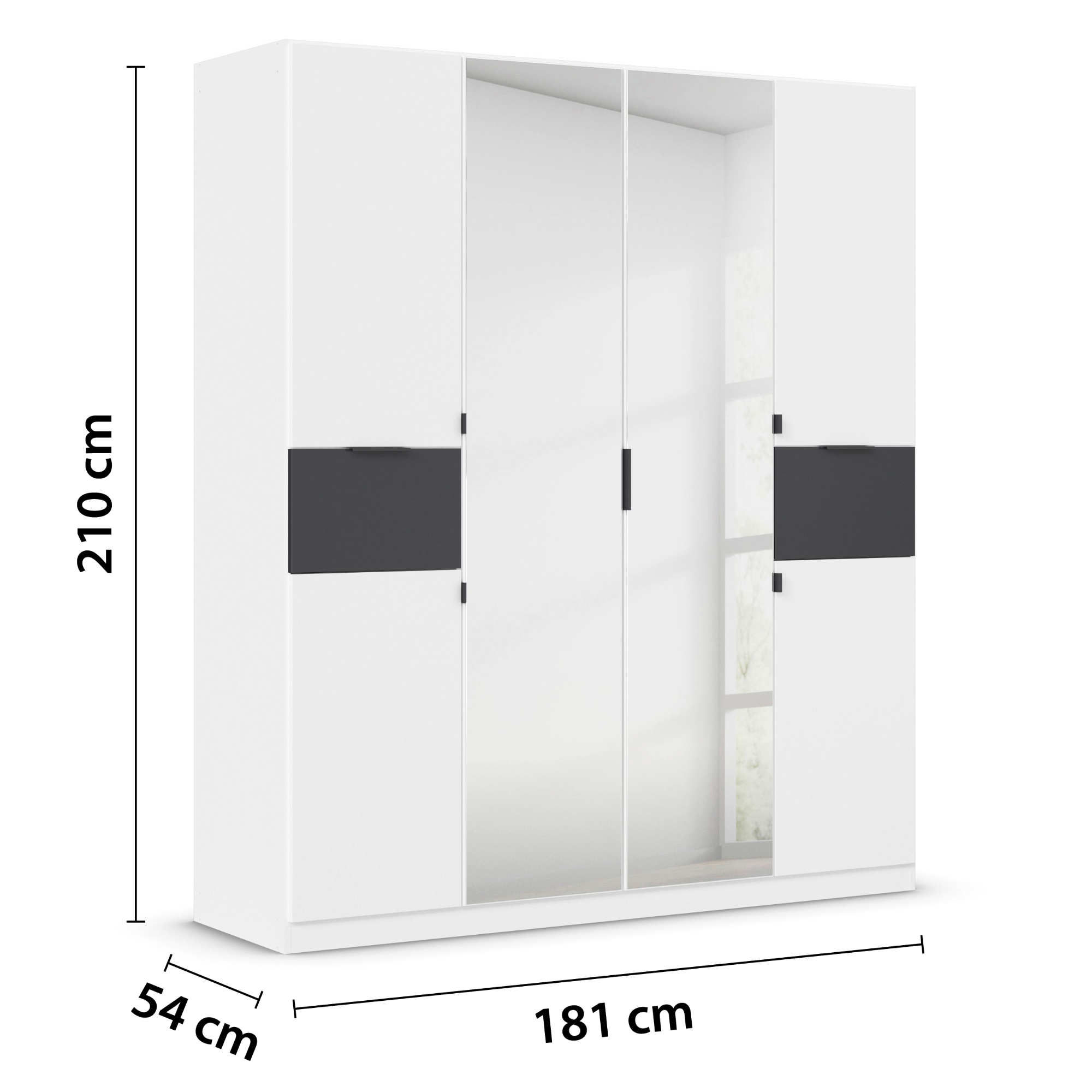 Skriňa je uzatvárateľná pomocou 6 otočných dverí z ktorých 2 sú zrkadlové. Zrkadlá vám nielen zaistia perfektný vzhľad, ale aj presvetlia a opticky zväčšia interiér. Skriňa je vybavená celkom 2 zásuvkami, 3 vloženými policami a 3 šatníkovými tyčami, ktoré ponúkajú dostatok miesta na vaše oblečenie a doplnky. Jednoduché otváranie dverí a zásuviek umožňujú decentne riešené rúčky. Skriňa je vyrobená z laminovanej drevotriesky, ktorá zaručuje nenáročnú údržbu.
