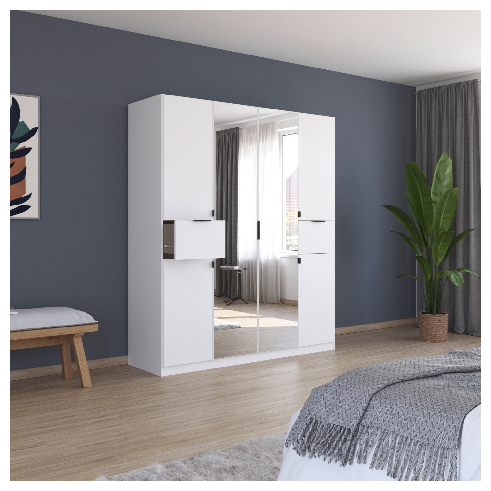Skriňa je uzatvárateľná pomocou 6 otočných dverí z ktorých 2 sú zrkadlové. Zrkadlá vám nielen zaistia perfektný vzhľad, ale aj presvetlia a opticky zväčšia interiér. Skriňa je vybavená celkom 2 zásuvkami, 3 vloženými policami a 3 šatníkovými tyčami, ktoré ponúkajú dostatok miesta na vaše oblečenie a doplnky. Jednoduché otváranie dverí a zásuviek umožňujú decentne riešené rúčky. Skriňa je vyrobená z laminovanej drevotriesky, ktorá zaručuje nenáročnú údržbu.