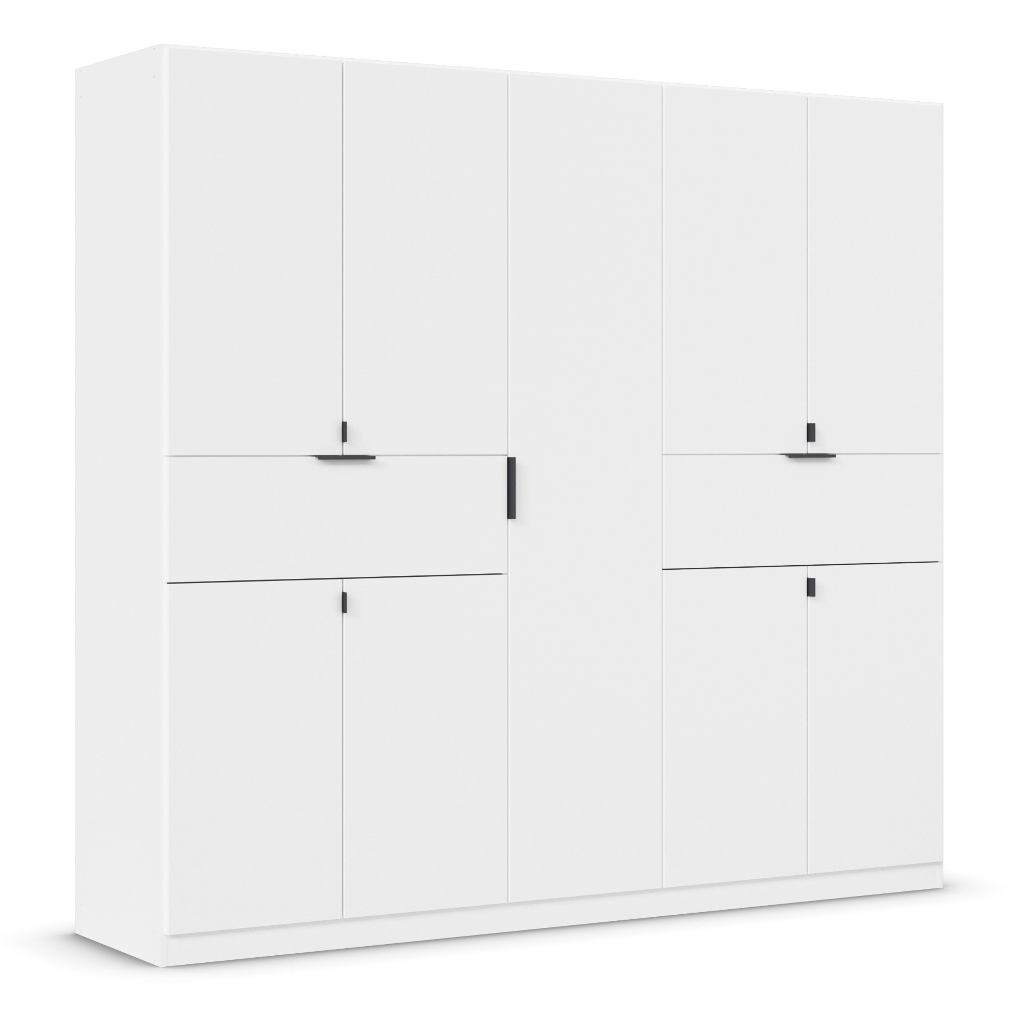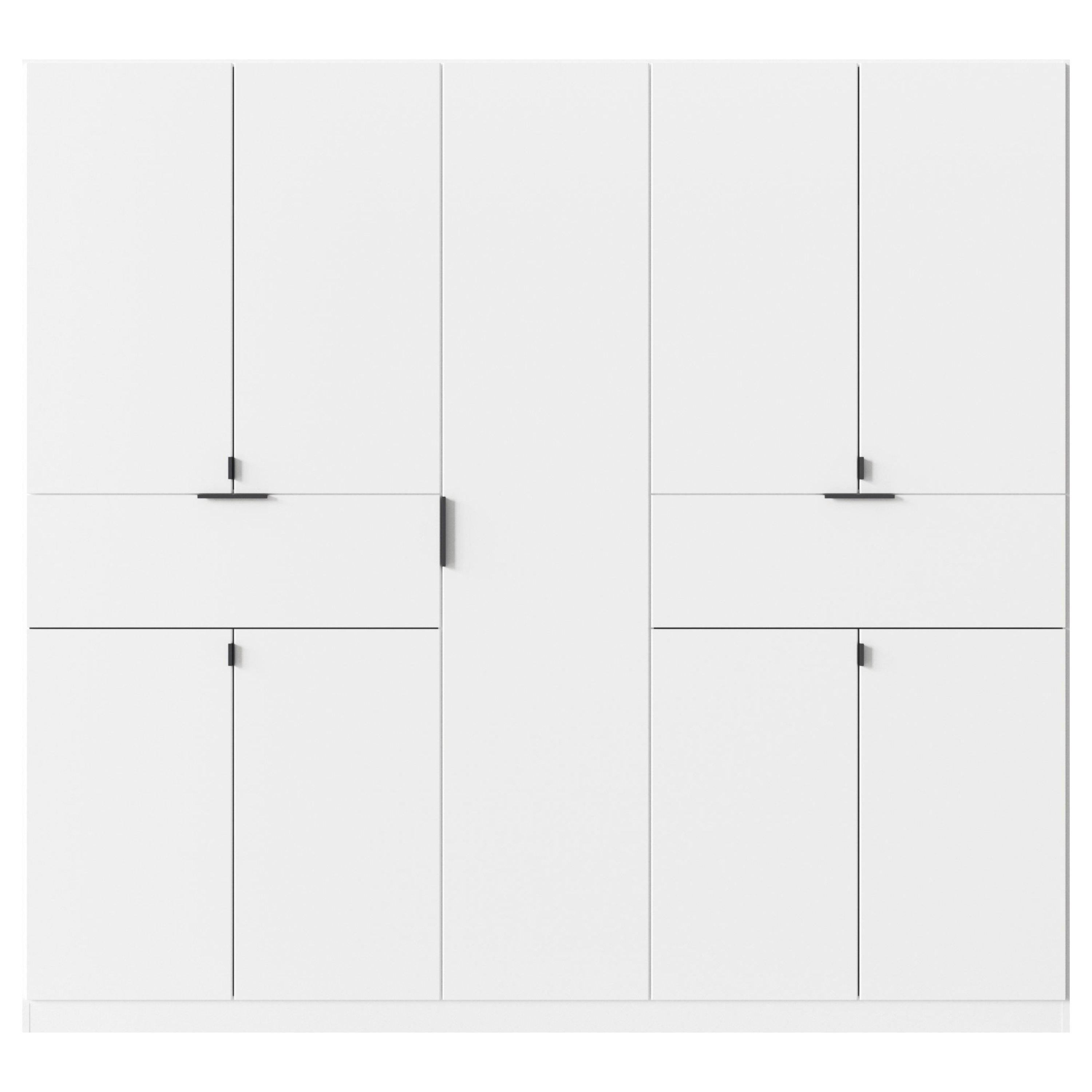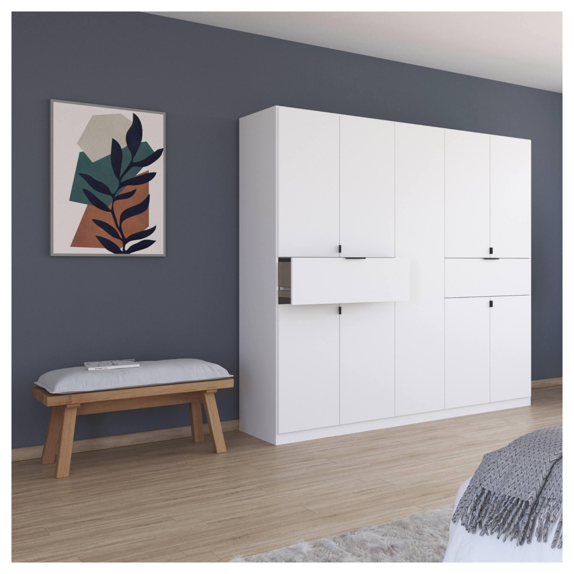 Skriňa je uzatvárateľná pomocou 9 otočných dverí a 2 praktických zásuviek. Vnútorné vybavenie pozostáva celkom z 3 vložených políc a 3 šatníkových tyčí. Pre maximálne zužitkovanie priestoru môžete využiť aj dno skrine, ktoré je ideálne na skladovanie úložných boxov a ďalších organizérov. Jednoduché otváranie všetkých prvkov zaisťujú decentné rúčky. Skriňa je vyrobená z laminovanej drevotriesky nenáročnej na údržbu.