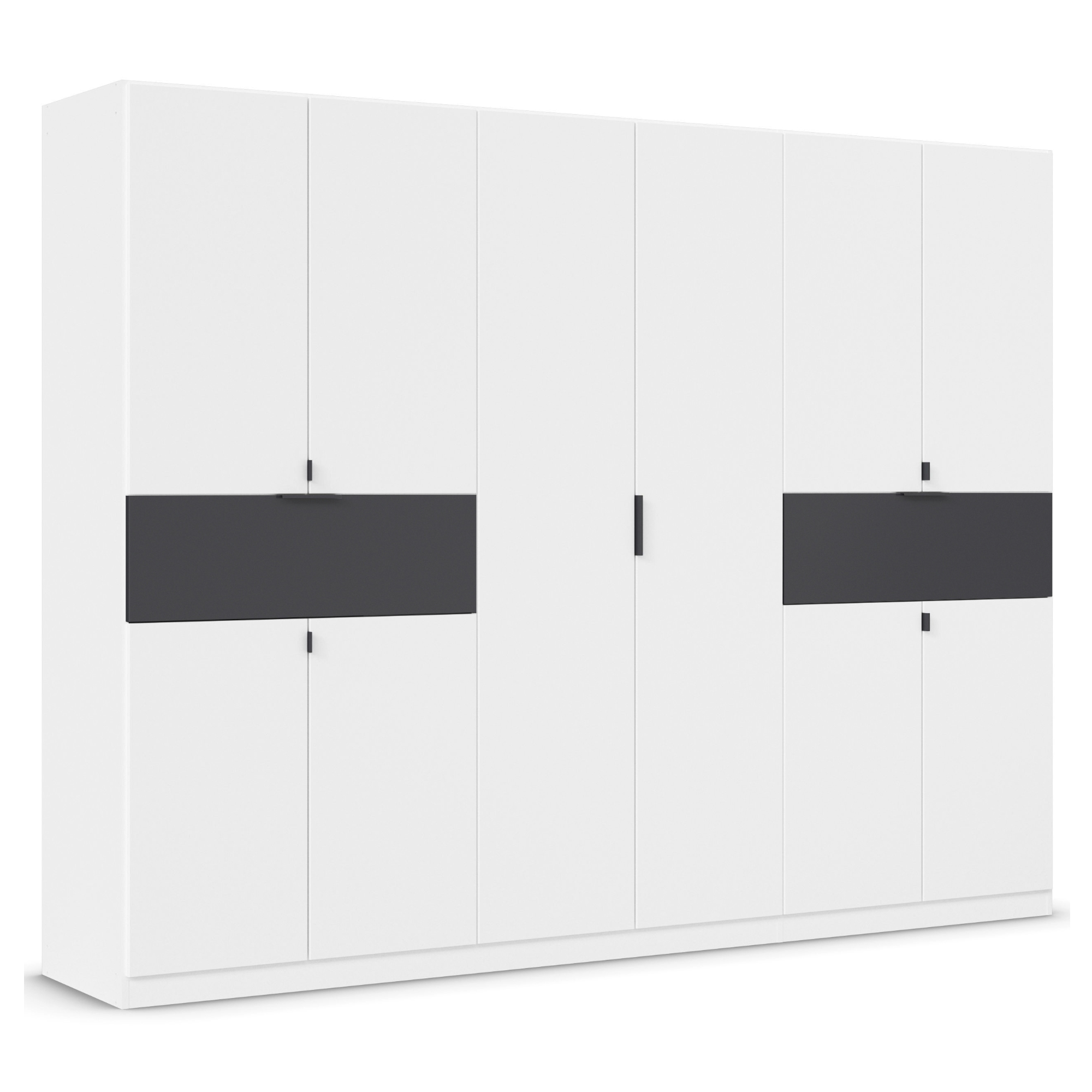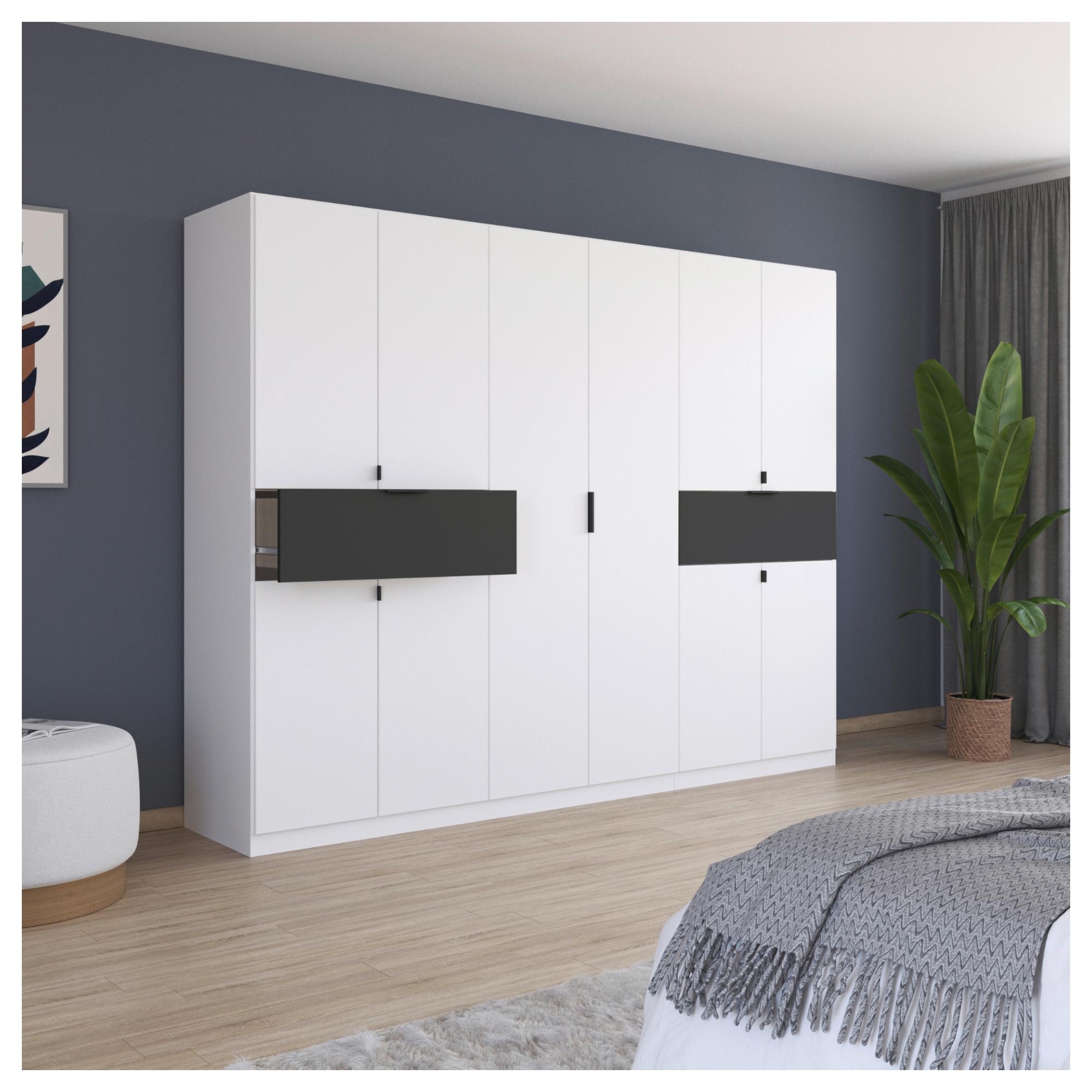 Skriňa je vybavená 10 klasickými otočnými dverami a 2 praktickými zásuvkami, ktoré umožňujú využiť skriňu na maximum. Vnútorný priestor ponúka celkom 3 vložené police a 3 šatníkové tyče. Všetky predné plochy sú doplnené o decentné rúčky na ľahkú každodennú manipuláciu. Skriňa je vyrobená z laminovanej drevotriesky nenáročnej na údržbu.