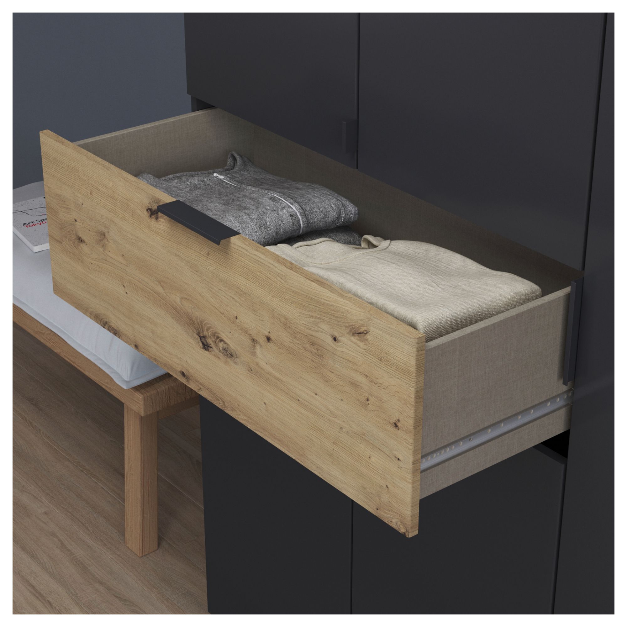 Skriňa je vybavená 10 klasickými otočnými dverami a 2 praktickými zásuvkami, ktoré umožňujú využiť skriňu na maximum. Vnútorný priestor ponúka celkom 3 vložené police a 3 šatníkové tyče. Všetky predné plochy sú doplnené o decentné rúčky na ľahkú každodennú manipuláciu. Skriňa je vyrobená z laminovanej drevotriesky nenáročnej na údržbu.