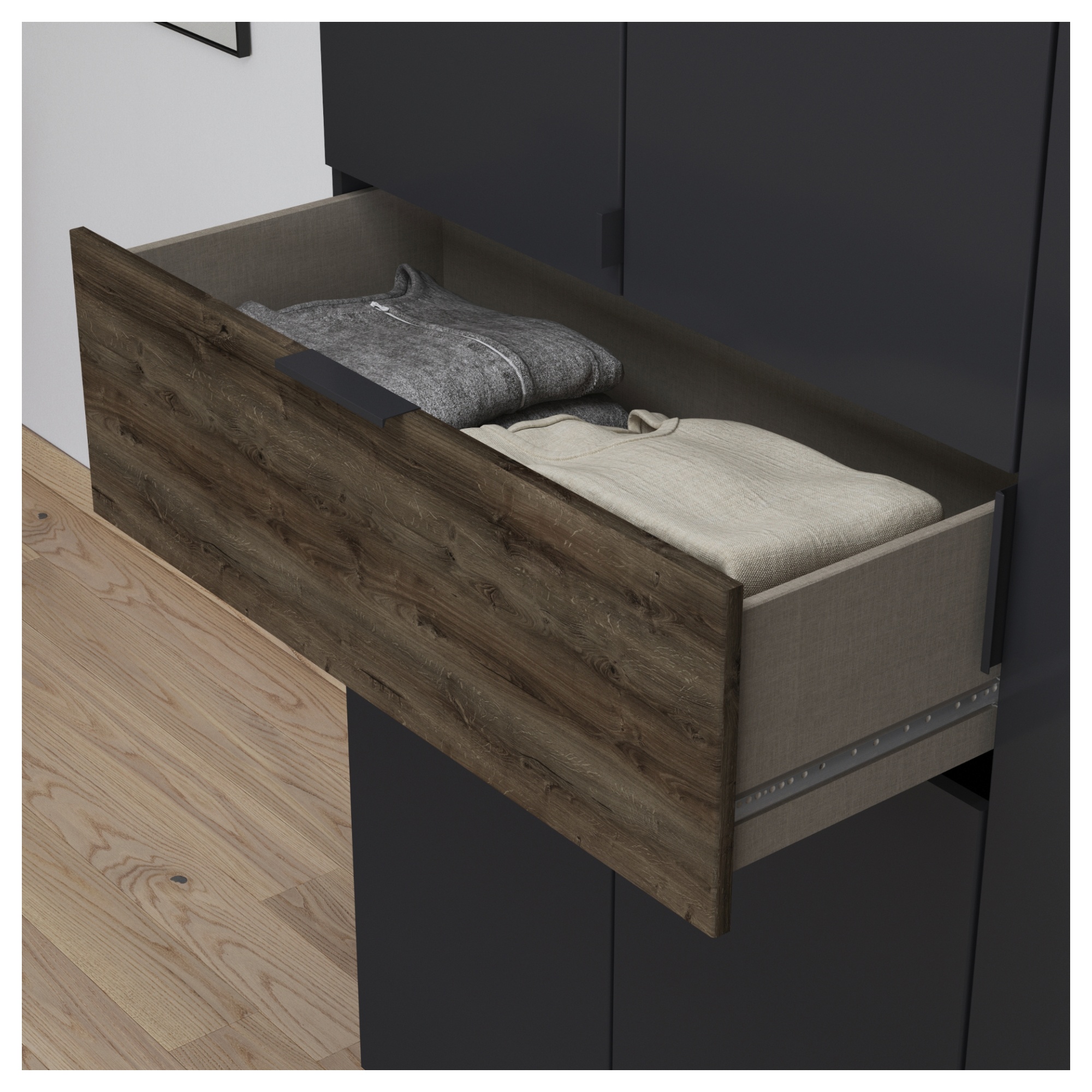 Skriňa je vybavená 10 klasickými otočnými dverami a 2 praktickými zásuvkami, ktoré umožňujú využiť skriňu na maximum. Vnútorný priestor ponúka celkom 3 vložené police a 3 šatníkové tyče. Všetky predné plochy sú doplnené o decentné rúčky na ľahkú každodennú manipuláciu. Skriňa je vyrobená z laminovanej drevotriesky nenáročnej na údržbu.