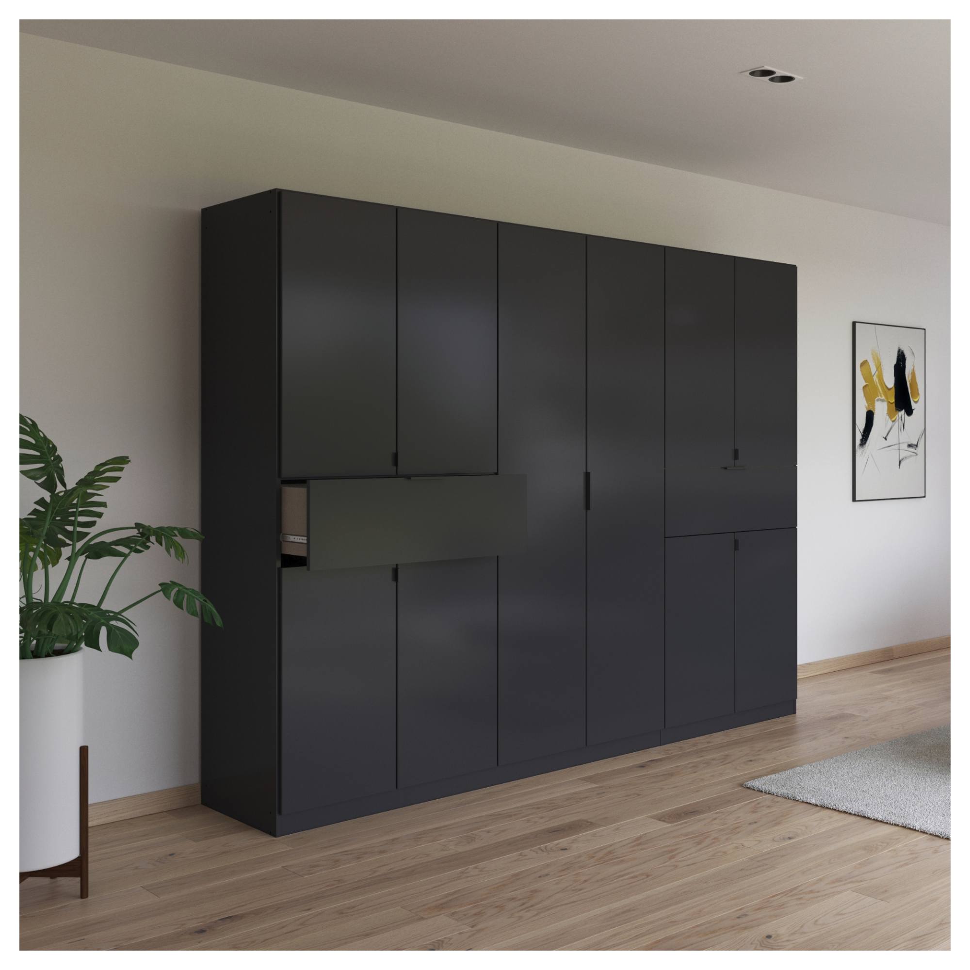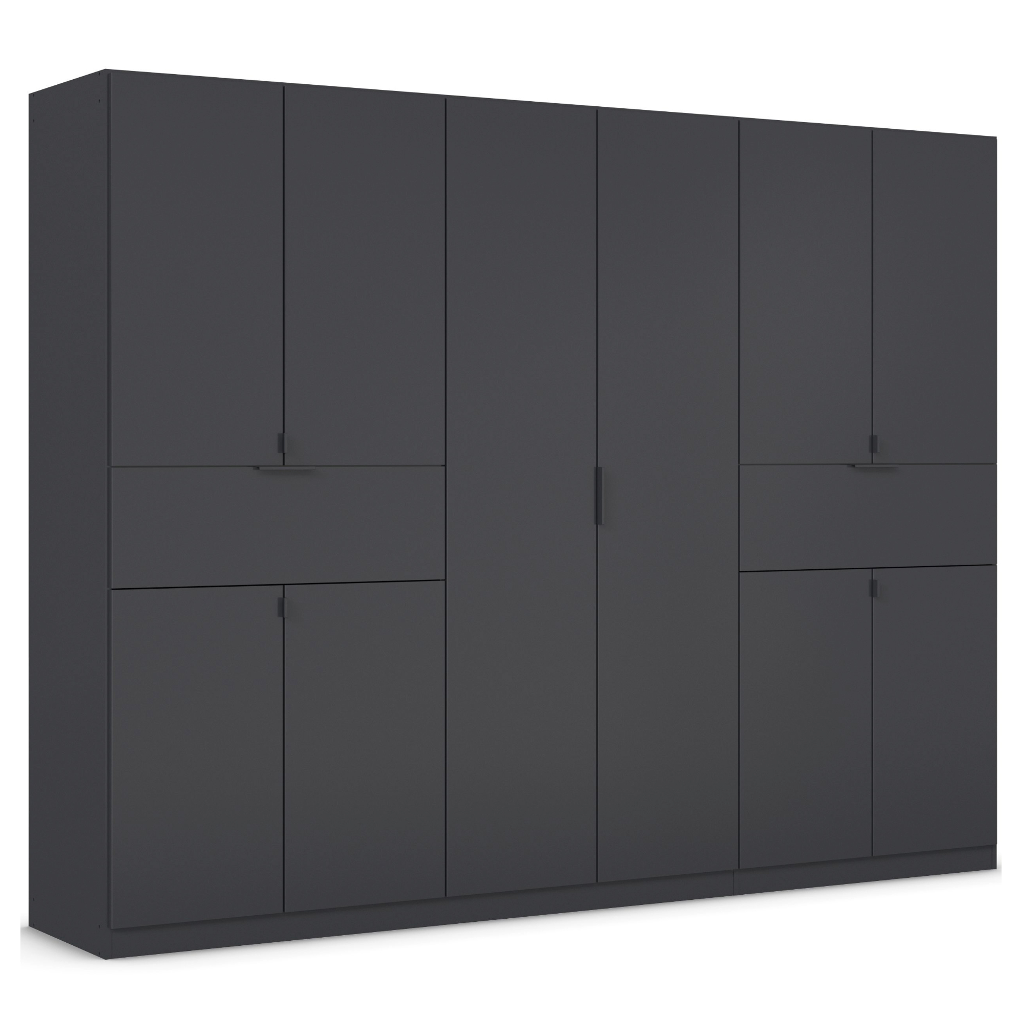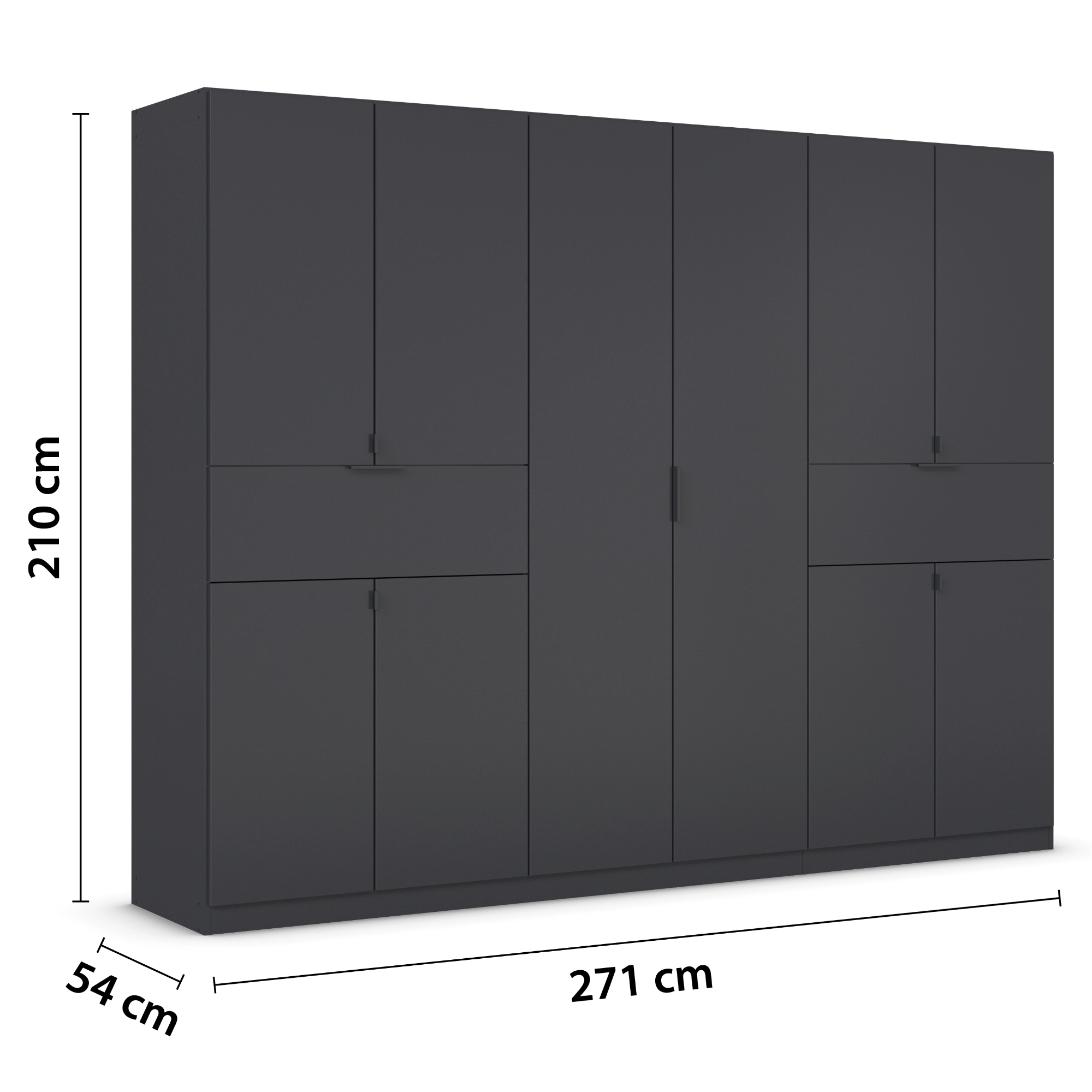 Skriňa je vybavená 10 klasickými otočnými dverami a 2 praktickými zásuvkami, ktoré umožňujú využiť skriňu na maximum. Vnútorný priestor ponúka celkom 3 vložené police a 3 šatníkové tyče. Všetky predné plochy sú doplnené o decentné rúčky na ľahkú každodennú manipuláciu. Skriňa je vyrobená z laminovanej drevotriesky nenáročnej na údržbu.