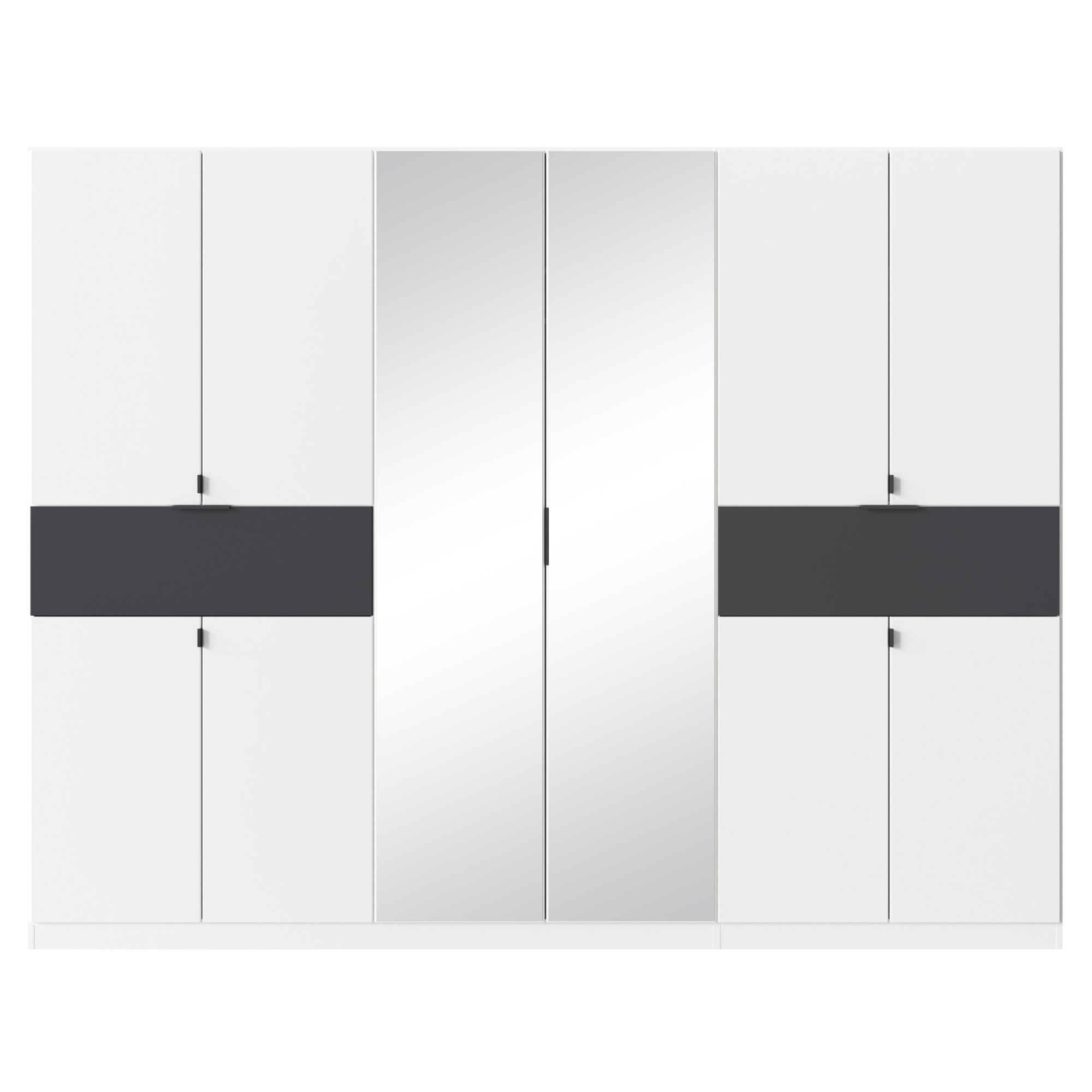 Skriňu uzatvára 5 párov otočných dverí z ktorých 1 pár je doplnený o zrkadlá, ktoré miestnosť presvetlia a opticky zväčšia. O prehľadné uskladnenie vášho oblečenia a doplnkov sa postará prakticky riešené vnútorné vybavenie v podobe 3 šatníkových tyčí, 3 vložených políc a 2 zásuviek. Jednoduché otváranie všetkých prvkov zaisťujú drobné rúčky. Skriňa je vyrobená z laminovanej drevotriesky, ktorá nie je náročná na údržbu.