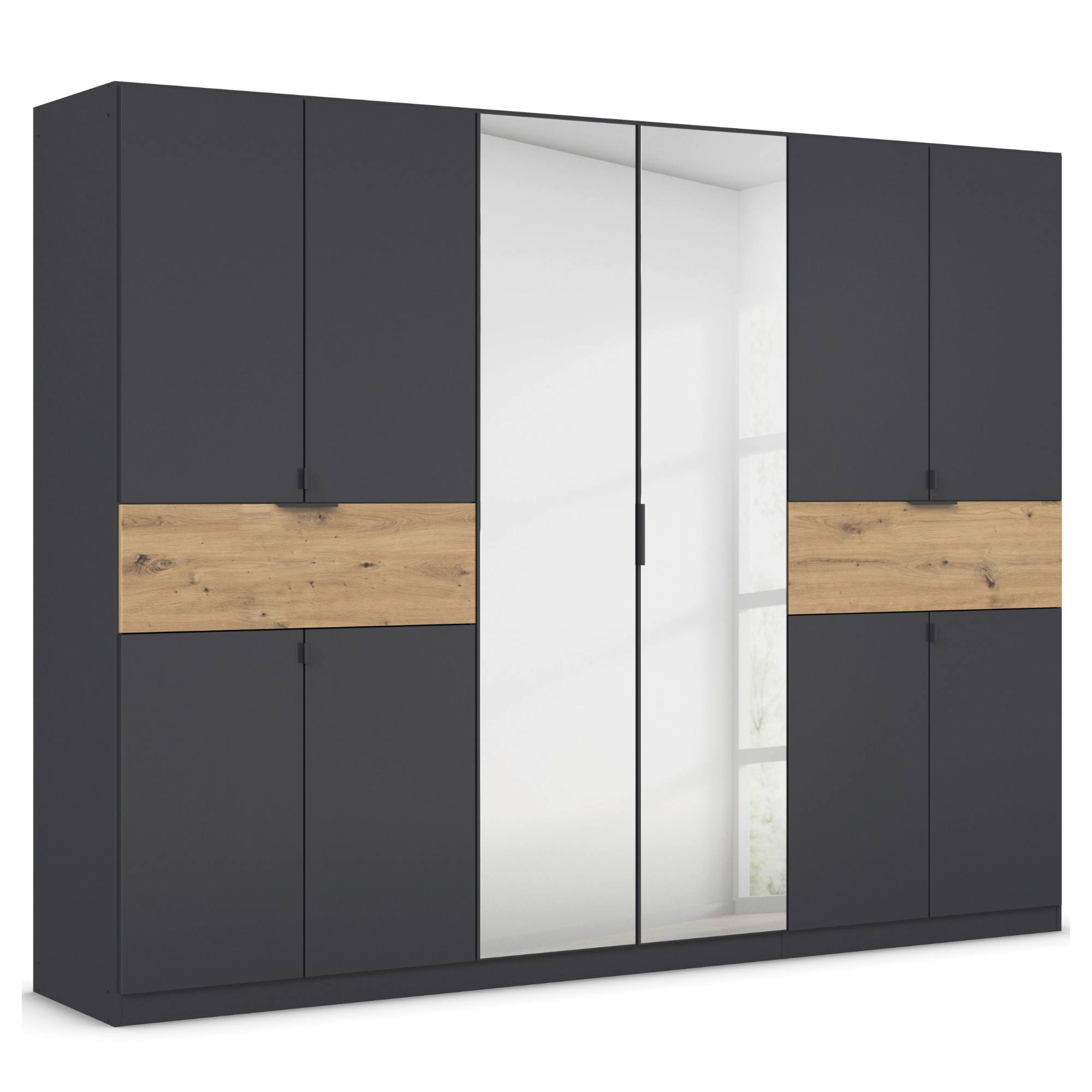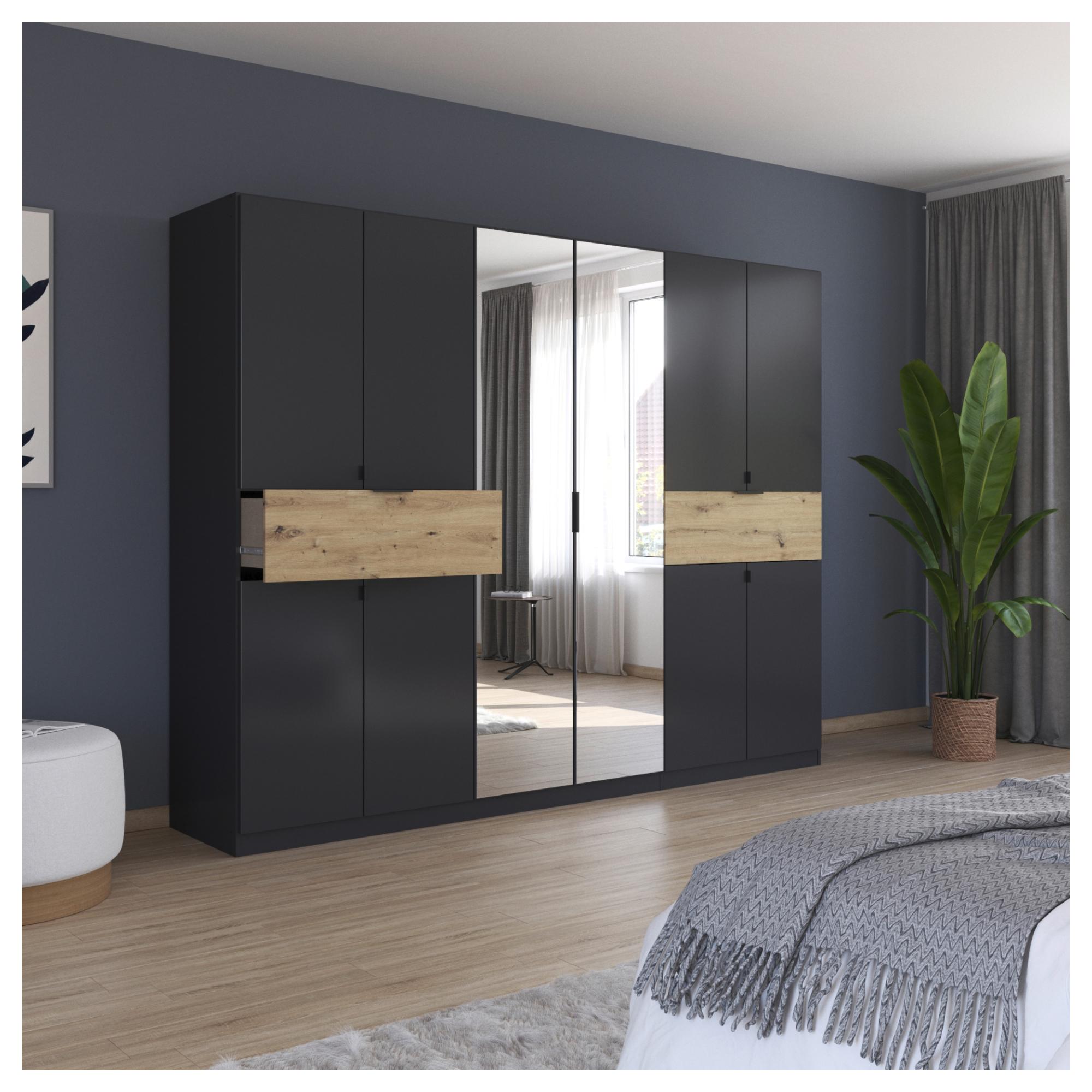 Skriňu uzatvára 5 párov otočných dverí z ktorých 1 pár je doplnený o zrkadlá, ktoré miestnosť presvetlia a opticky zväčšia. O prehľadné uskladnenie vášho oblečenia a doplnkov sa postará prakticky riešené vnútorné vybavenie v podobe 3 šatníkových tyčí, 3 vložených políc a 2 zásuviek. Jednoduché otváranie všetkých prvkov zaisťujú drobné rúčky. Skriňa je vyrobená z laminovanej drevotriesky, ktorá nie je náročná na údržbu.